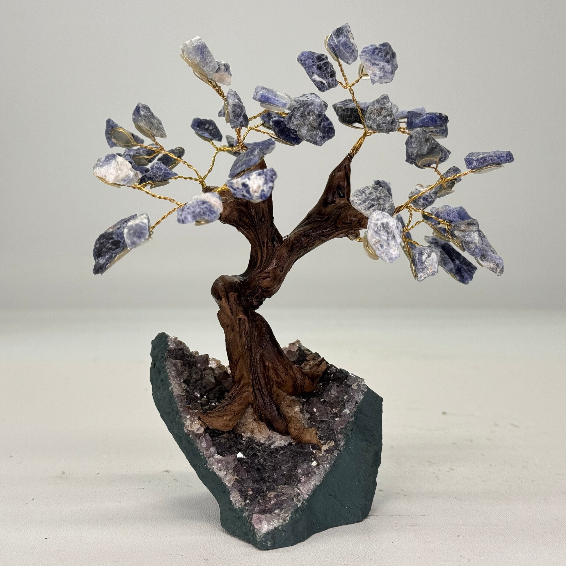 Klein edelsteenboompje met bladeren van ruwe sodaliet. Het boompje staat stevig op een natuurlijke amethist cluster en is volledig met de hand gemaakt. Hierdoor is elk exemplaar uniek in vorm en uitstraling.