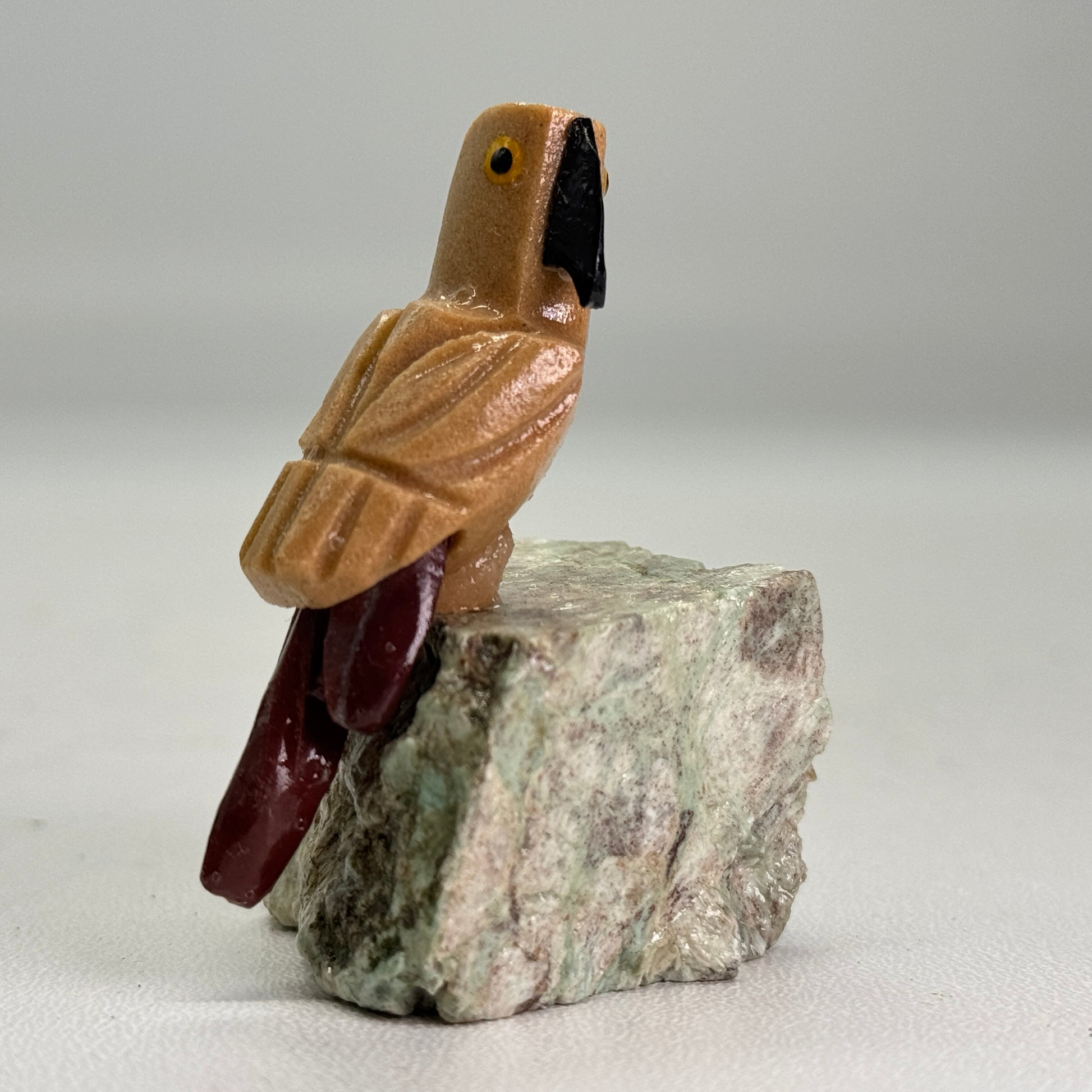 Mini papegaai, met de hand vervaardigd uit geslepen en gepolijste edelstenen. Elke papegaai is uniek, omdat er verschillende soorten stenen worden gebruikt.