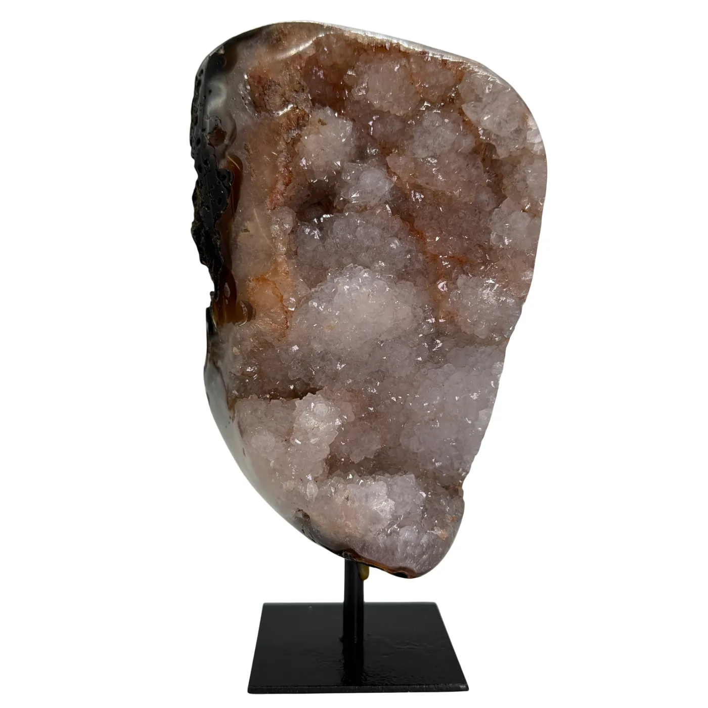 Prachtige natuurlijke rotsagaat op een elegante zwarte standaard. Deze steen is afkomstig uit Brazilië en is deels gepolijst, waardoor de natuurlijke kleuren, lagen en structuren van de agaat extra mooi zichtbaar worden. In de kern bevindt zich een schitterende druzy, waarvan de fijne kristallen prachtig glinsteren in het licht.