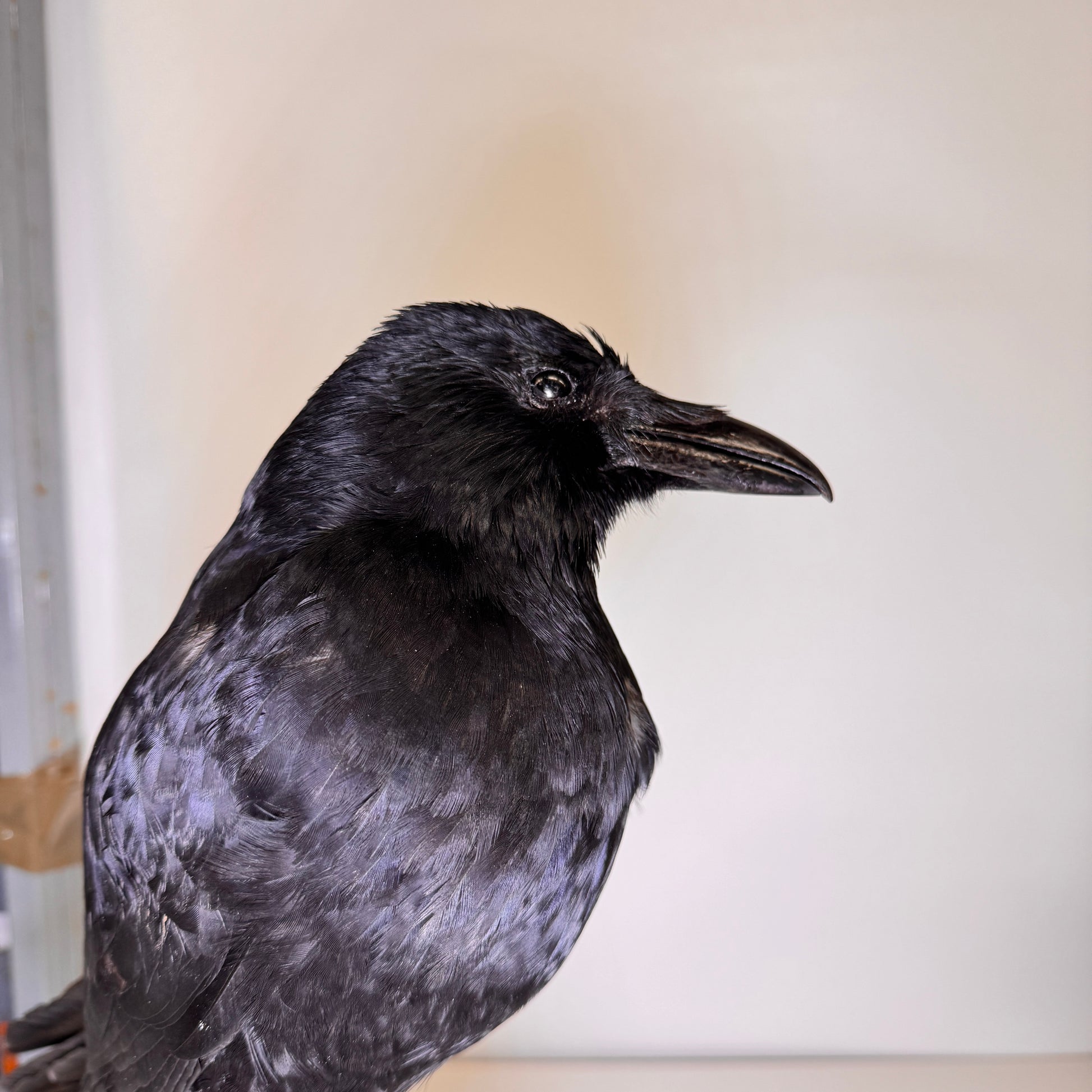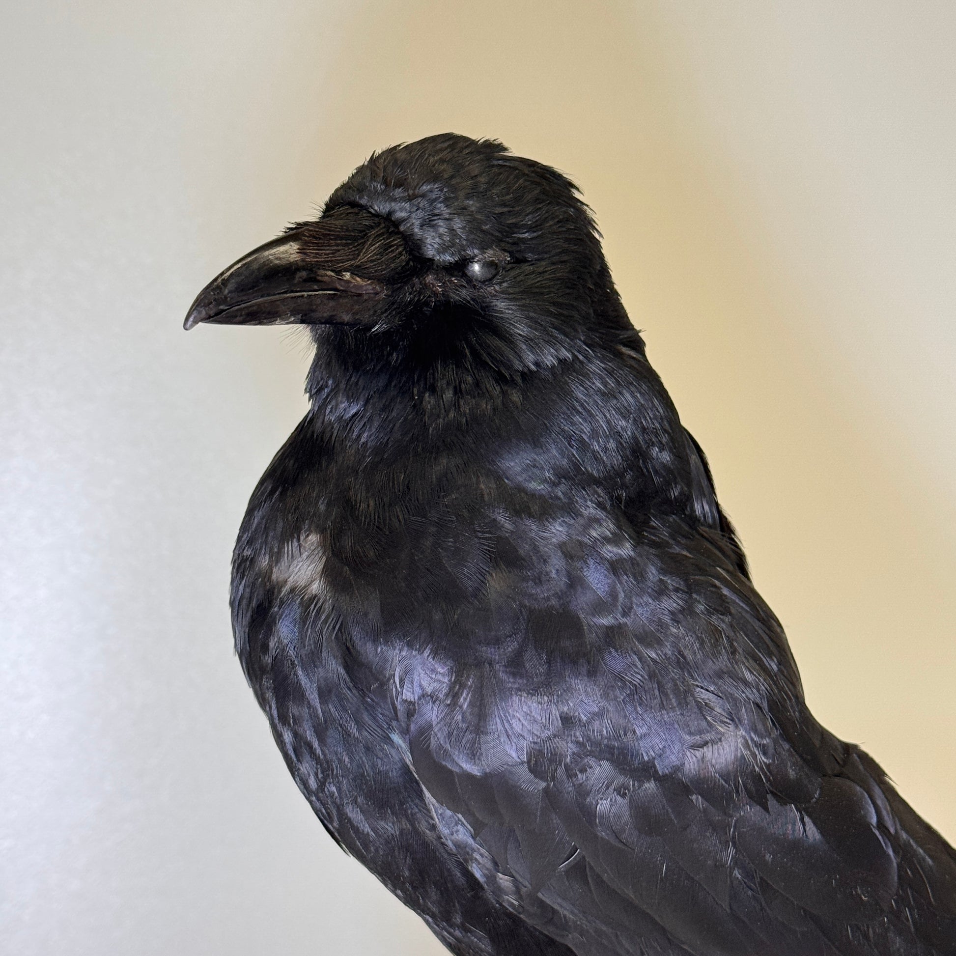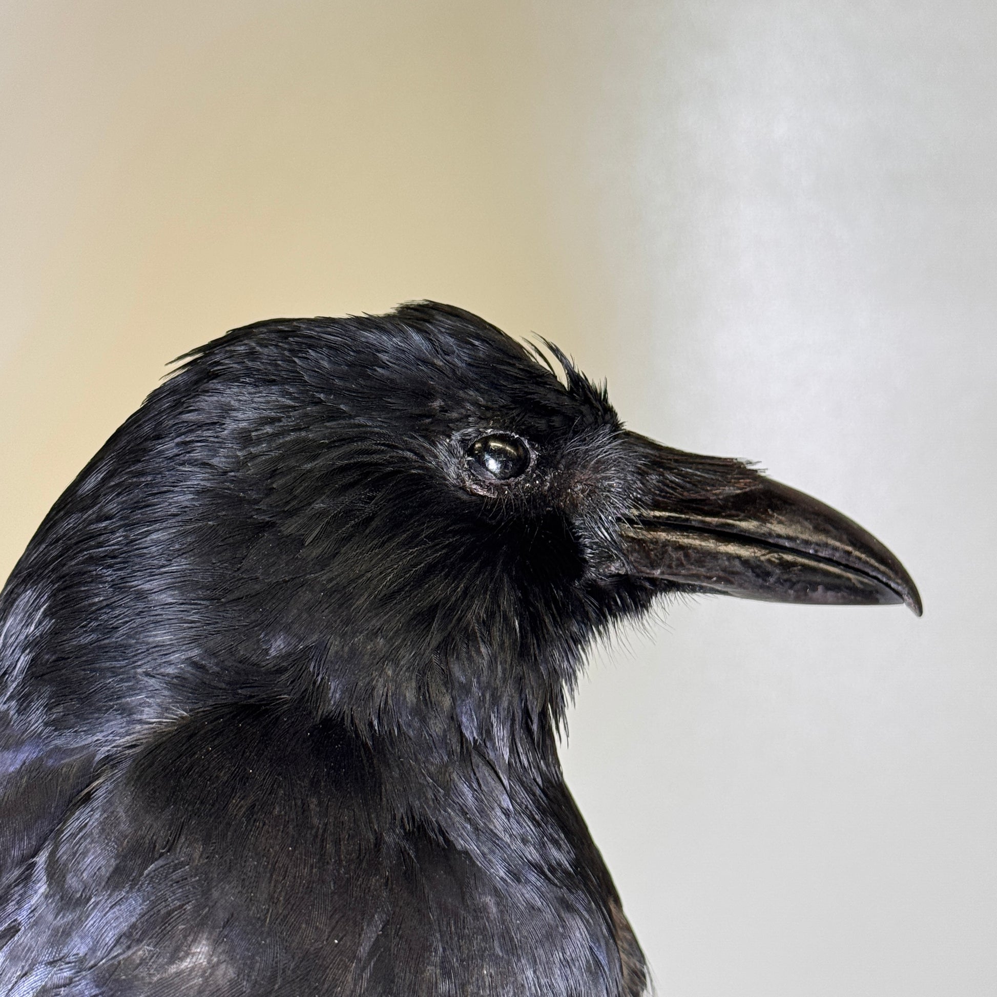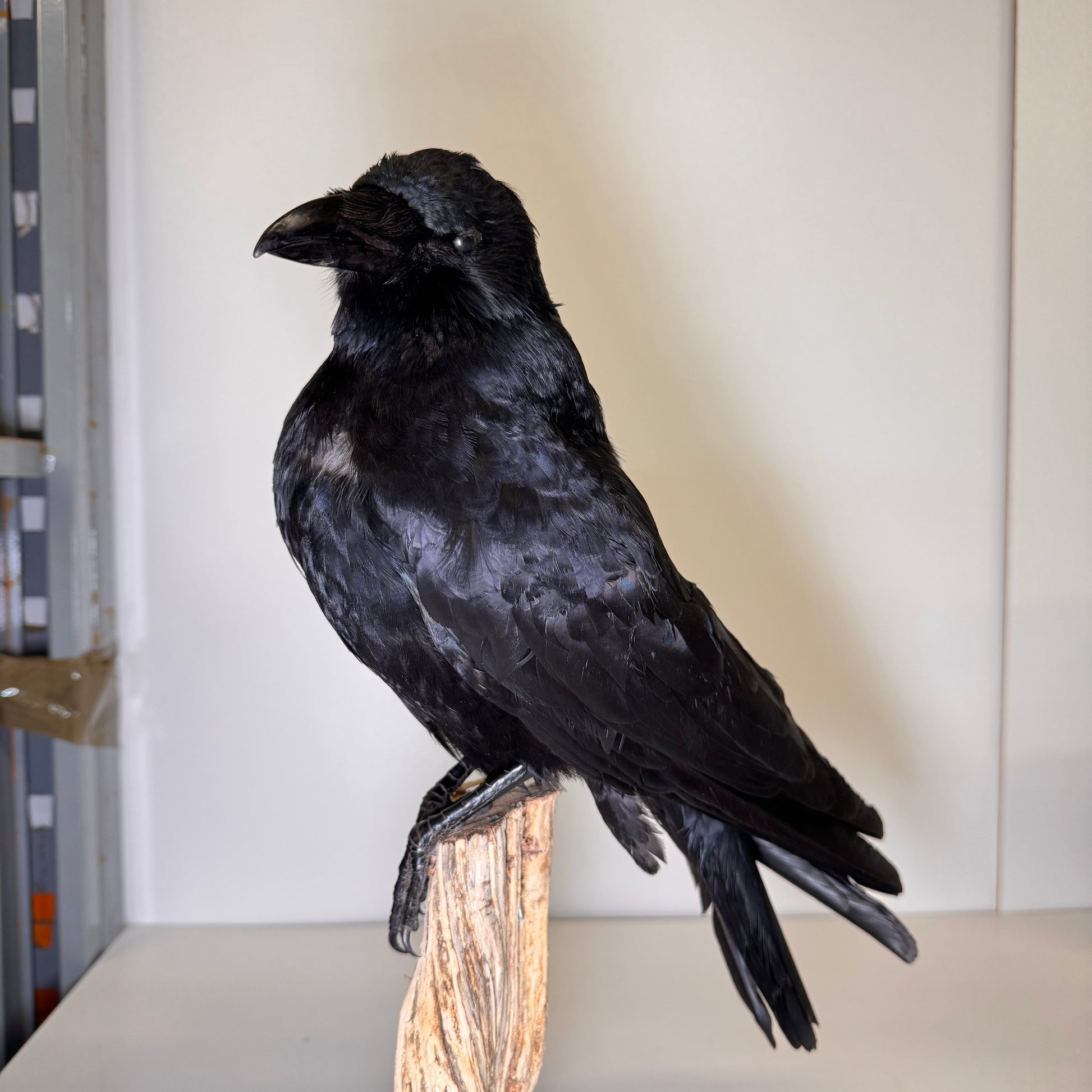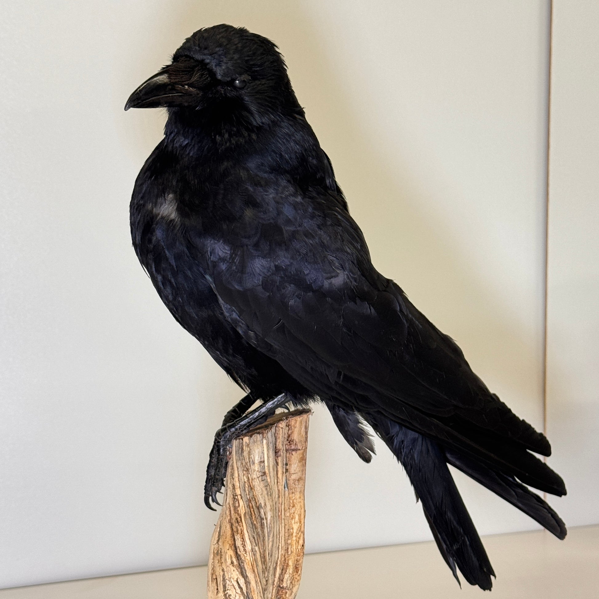 Deze indrukwekkende, echte kraai is met de grootste zorg en vakmanschap geprepareerd. Met zijn afmetingen van ca. 30 × 14 × 44 cm is dit unieke stuk een absolute blikvanger, perfect voor zowel een modern als klassiek interieur, of als bijzonder geschenk voor liefhebbers.