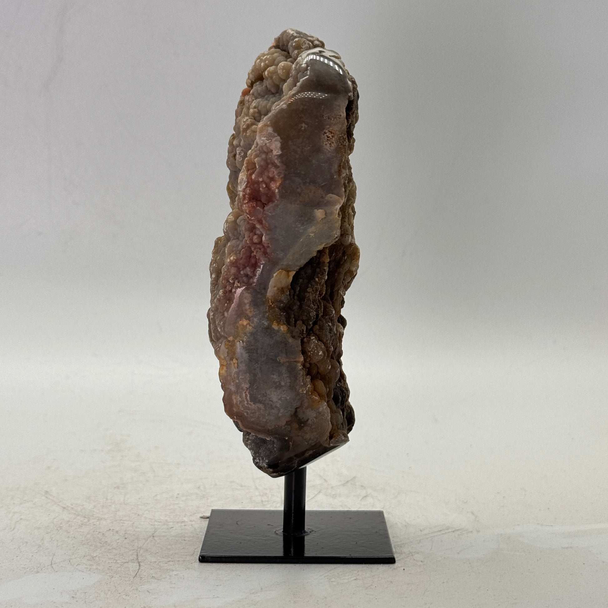 Unieke natuurlijke rotsagaat uit Brazilië, elegant gepresenteerd op een zwarte metalen standaard. De zijkanten van de steen zijn zorgvuldig gepolijst, waardoor de diepe kleuren, aders en karakteristieke patronen van de agaat schitterend zichtbaar zijn.