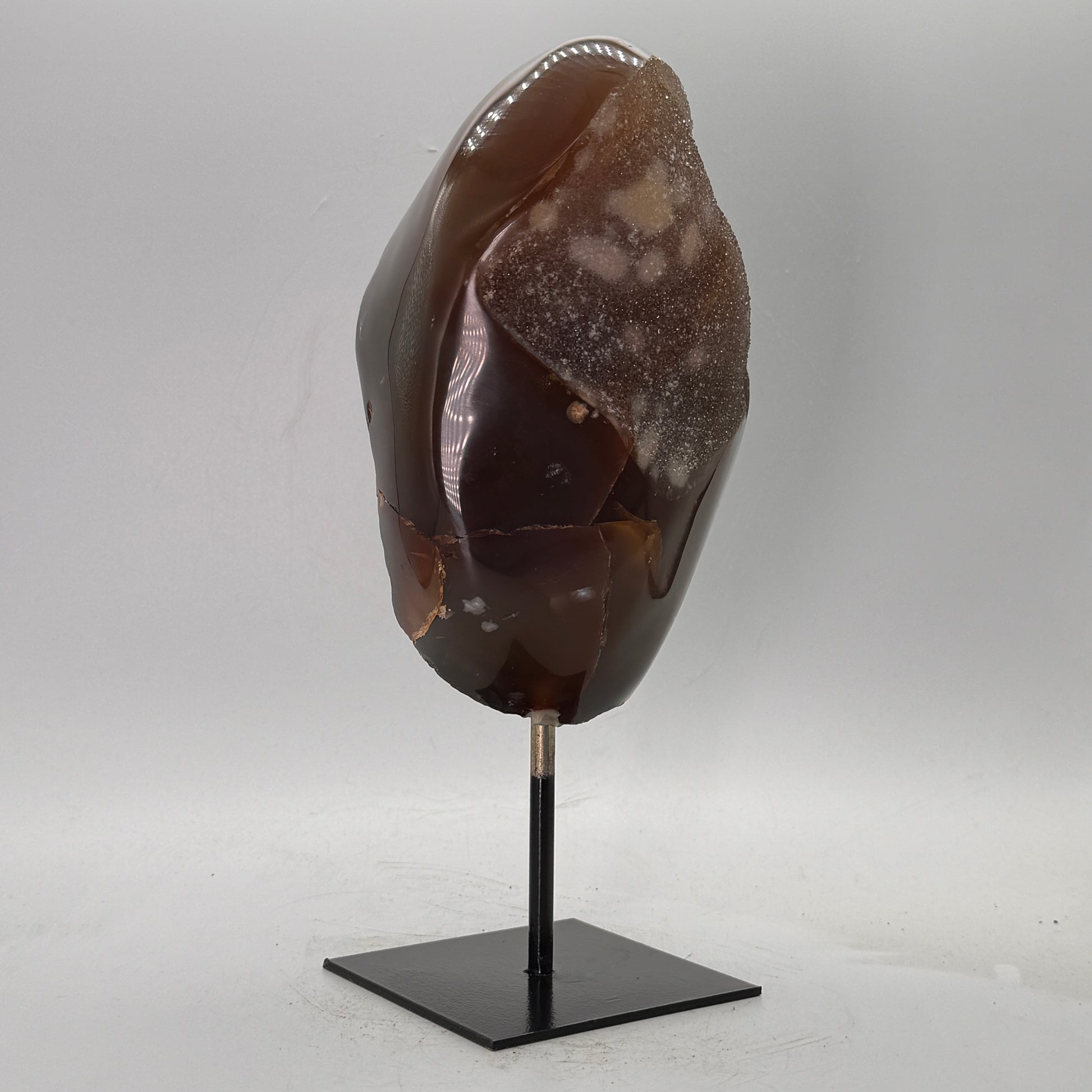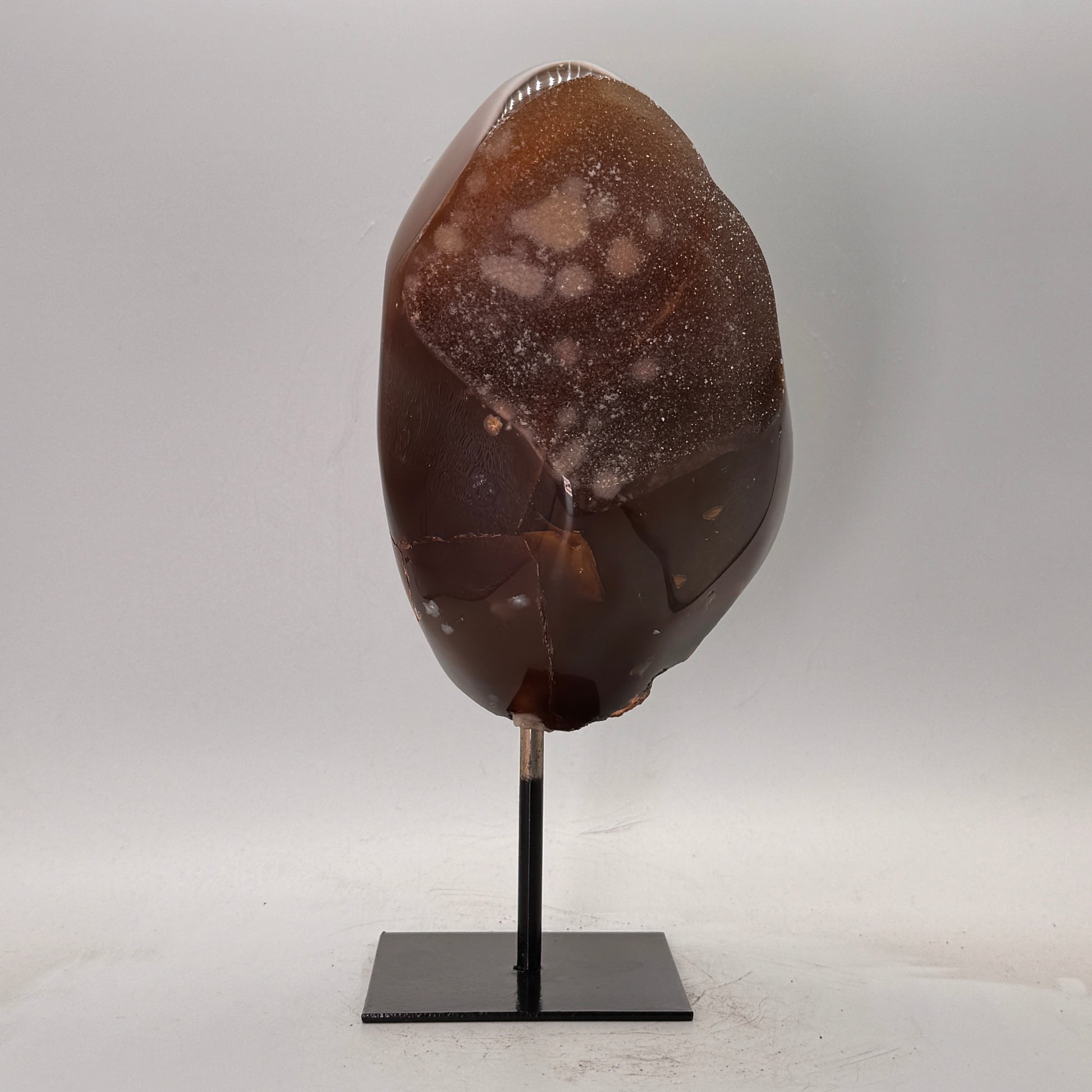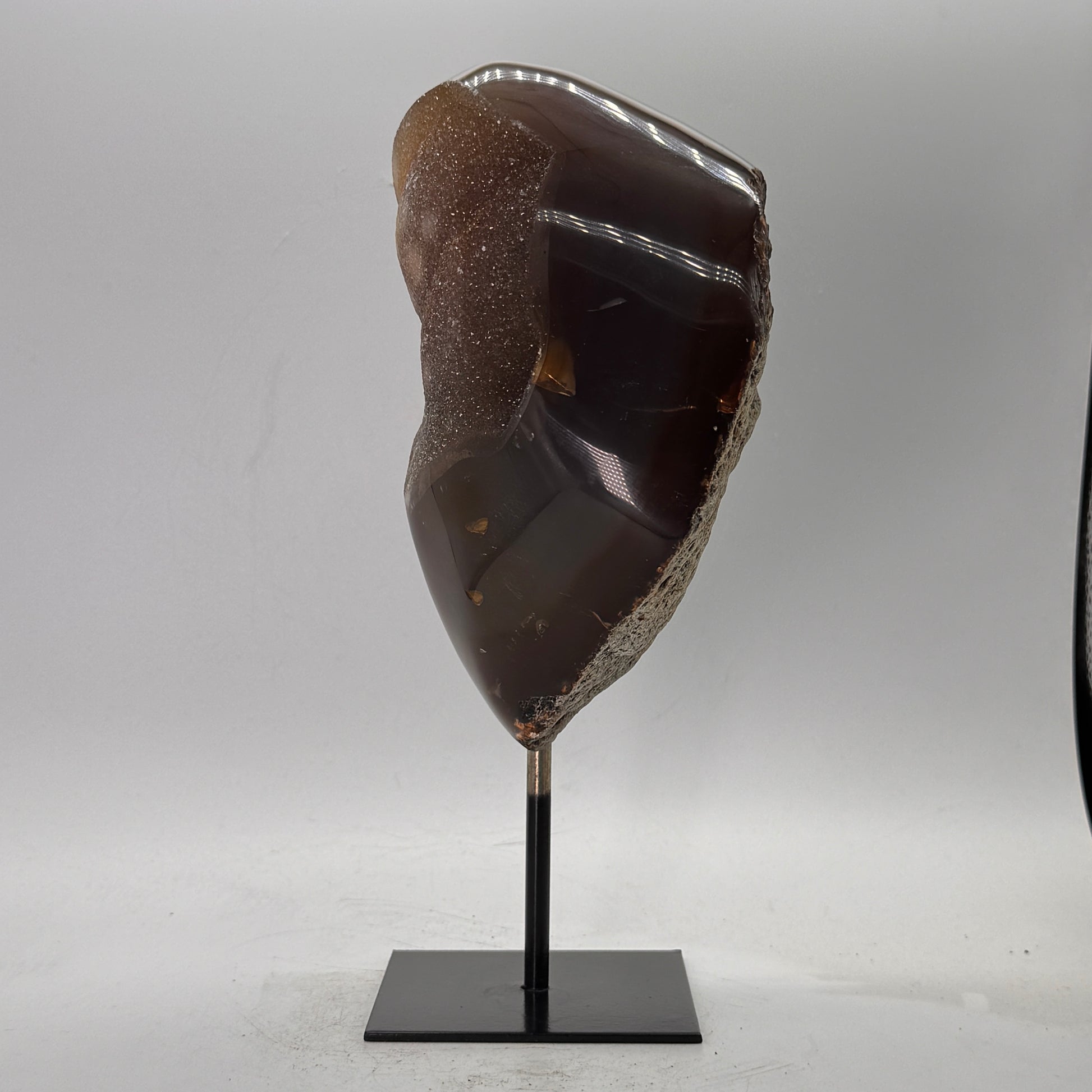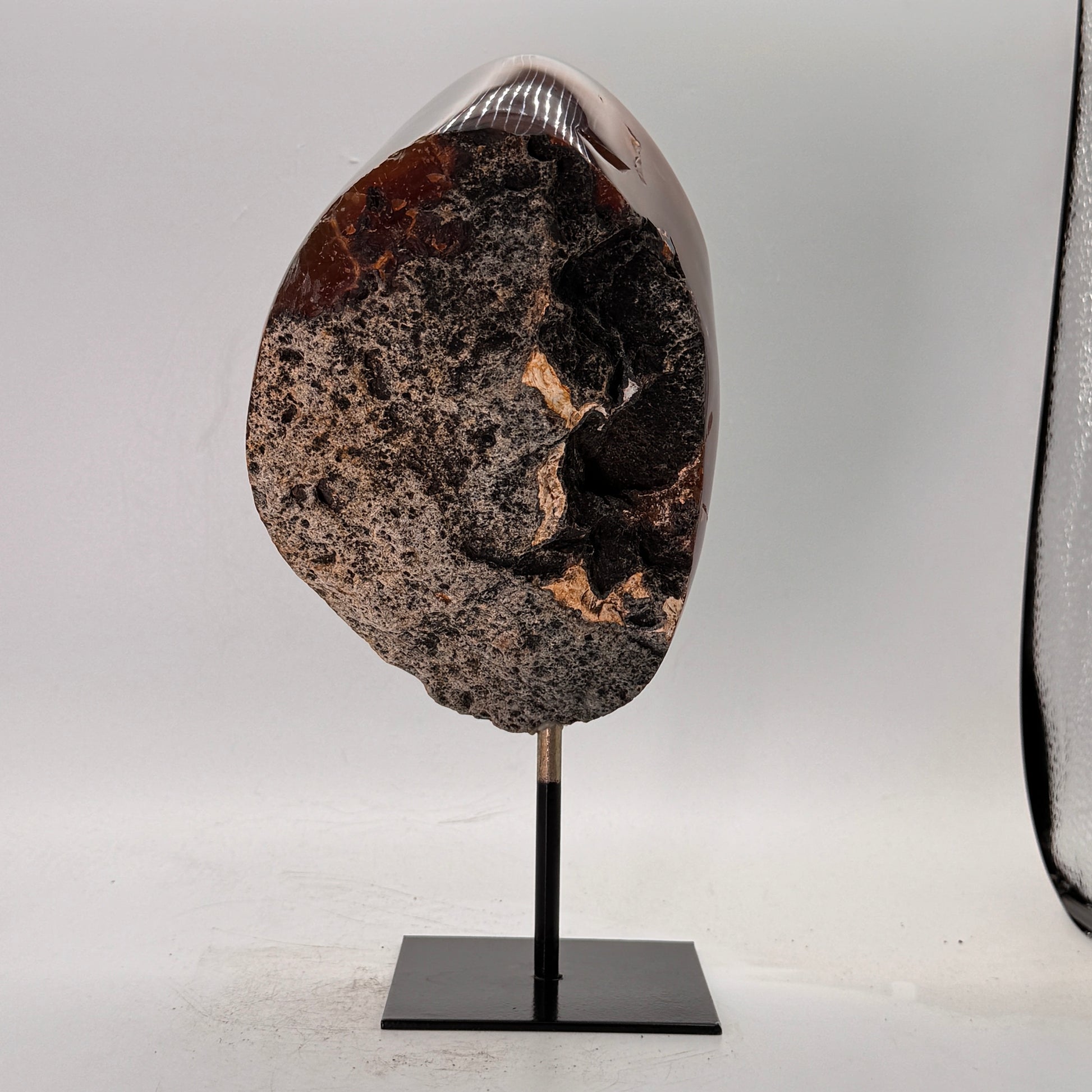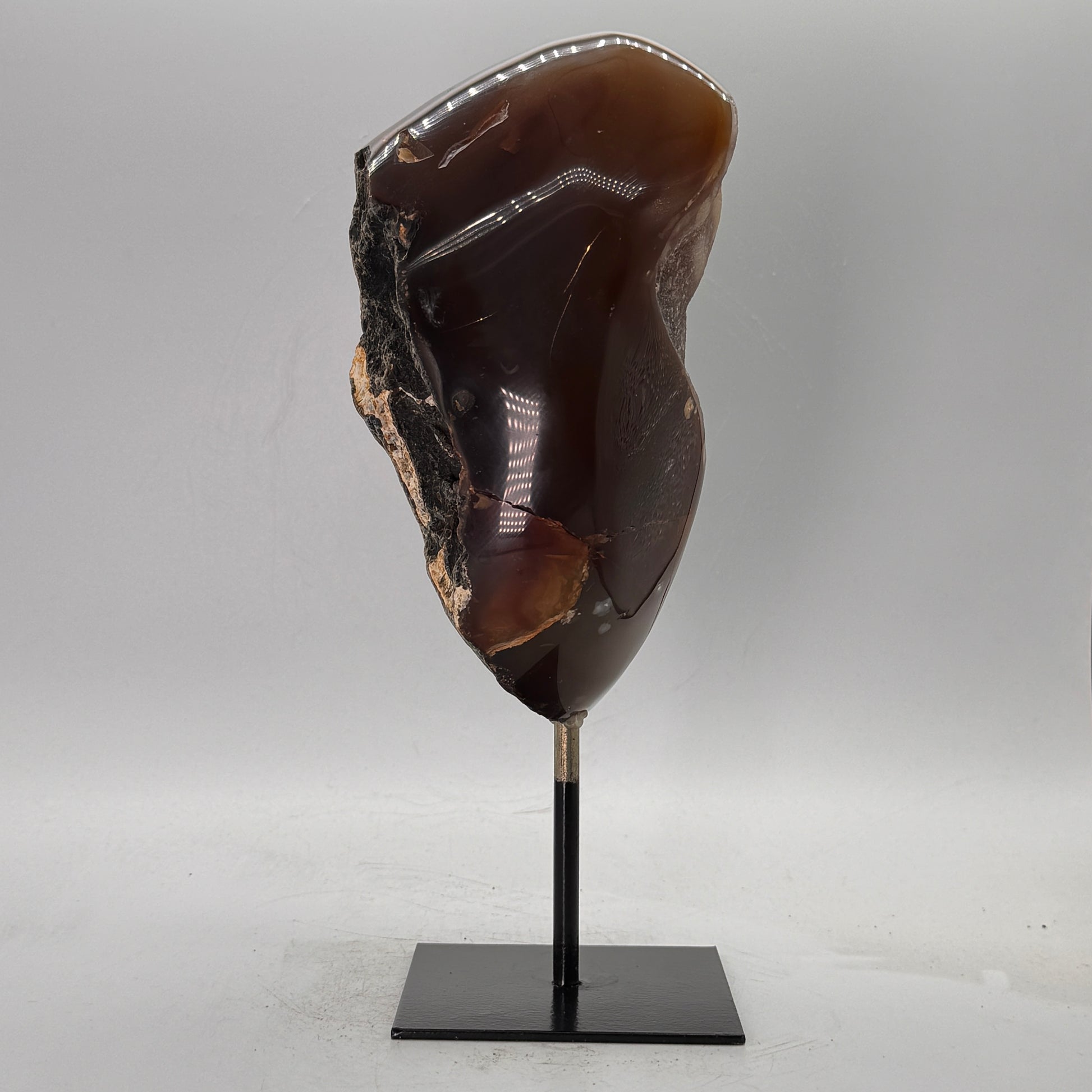 Natuurlijke rots agaat uit Brazilië, stijlvol gepresenteerd op een elegante zwarte metalen standaard. De steen is gepolijst, waardoor de diepe kleuren en bijzondere structuren van de agaat prachtig tot hun recht komen.