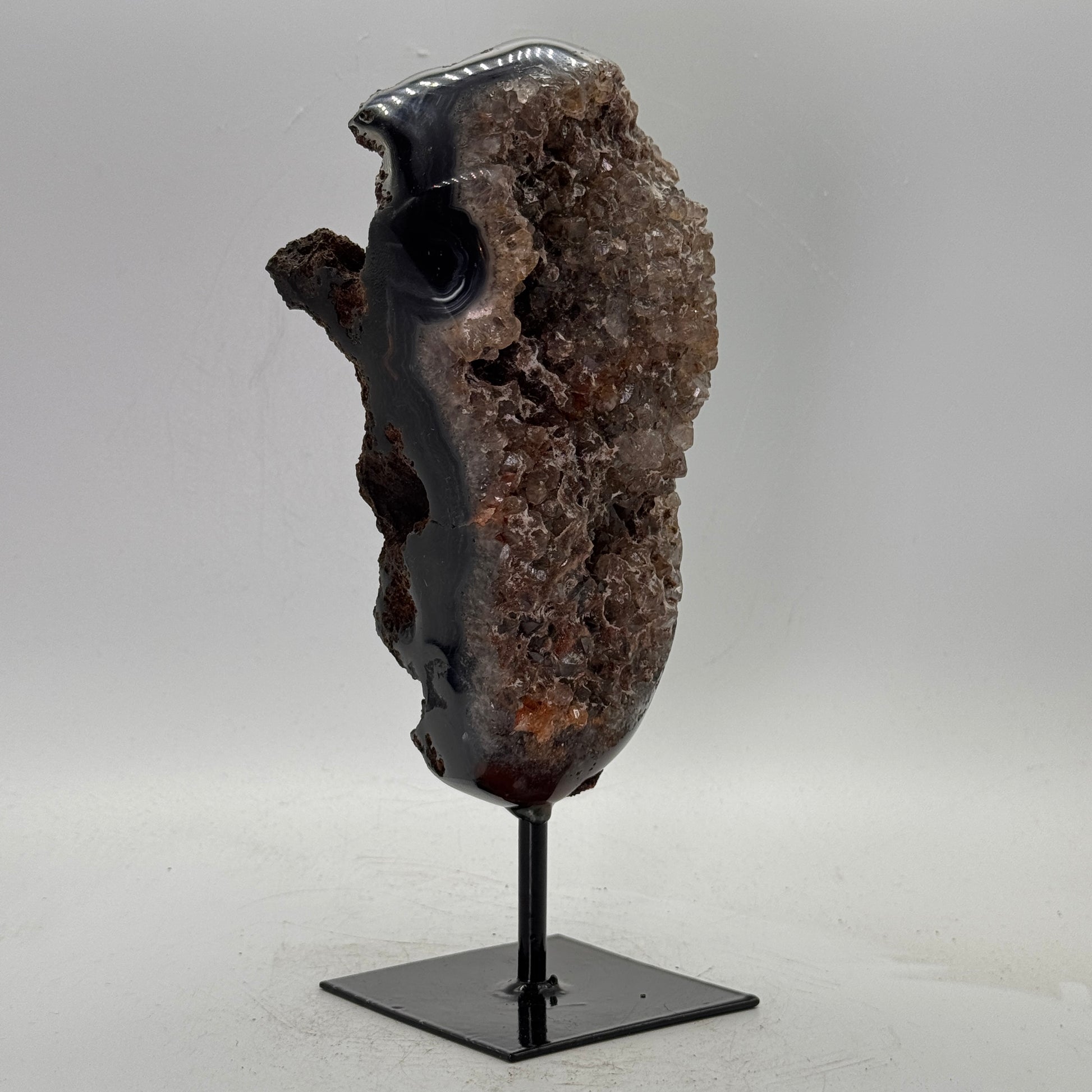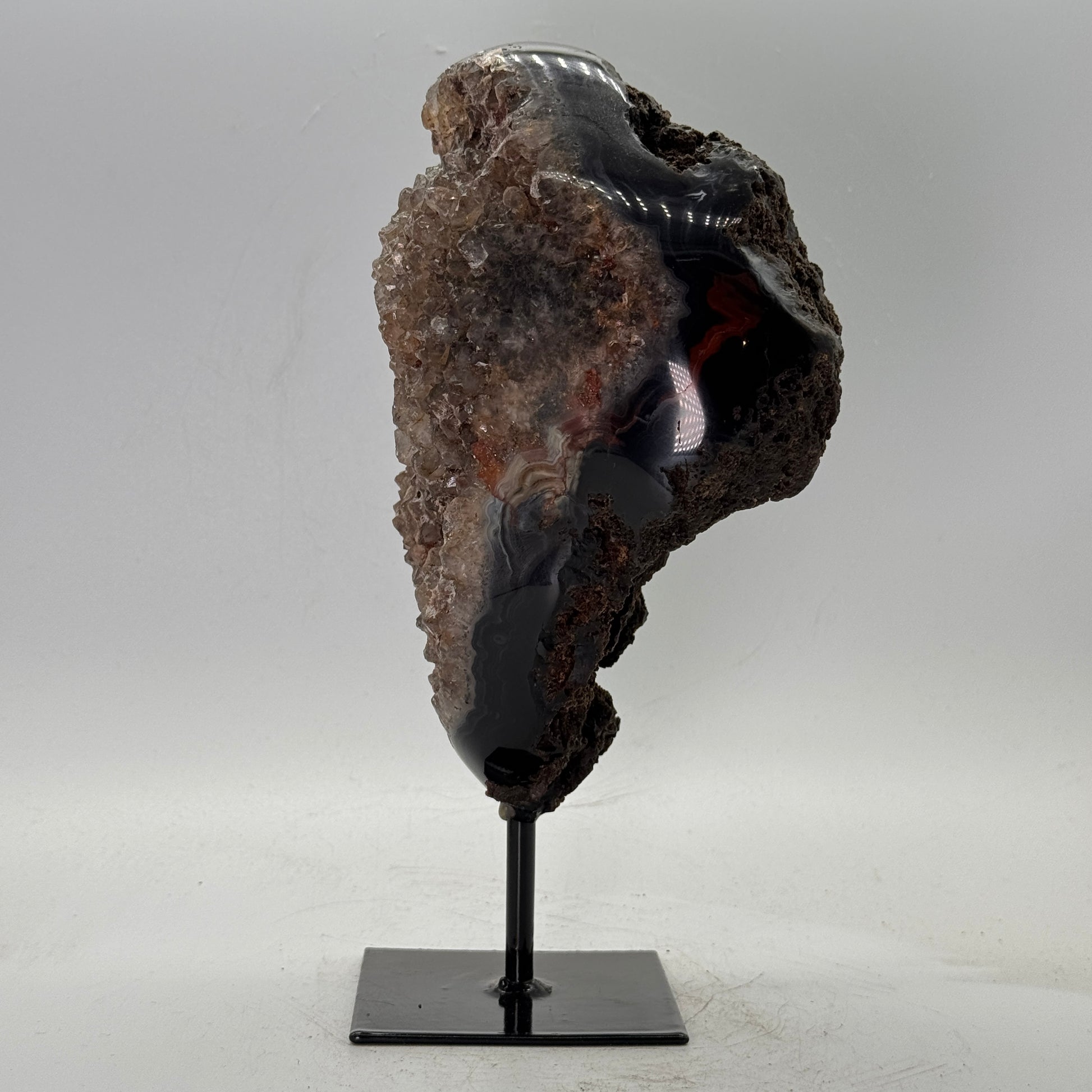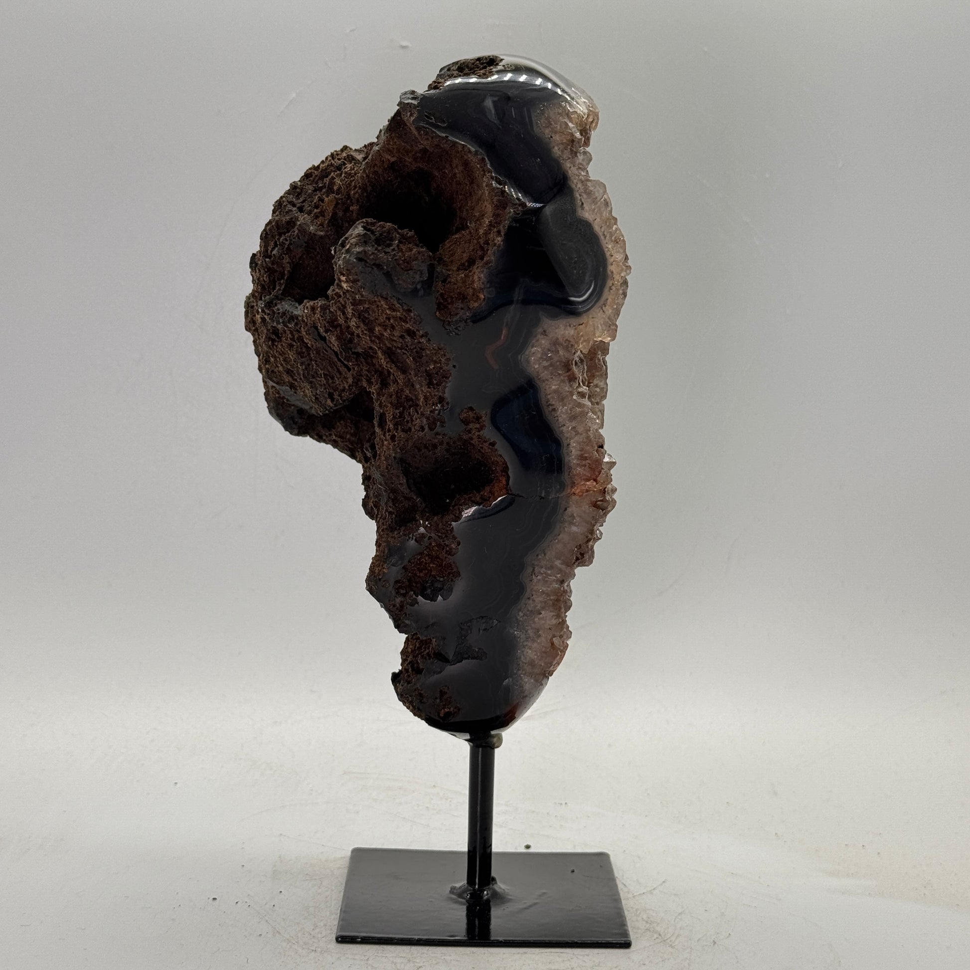 Natuurlijke rots agaat uit Brazilië, stijlvol gepresenteerd op een elegante zwarte metalen standaard. De steen is gepolijst, waardoor de diepe kleuren en bijzondere structuren van de agaat prachtig tot hun recht komen.