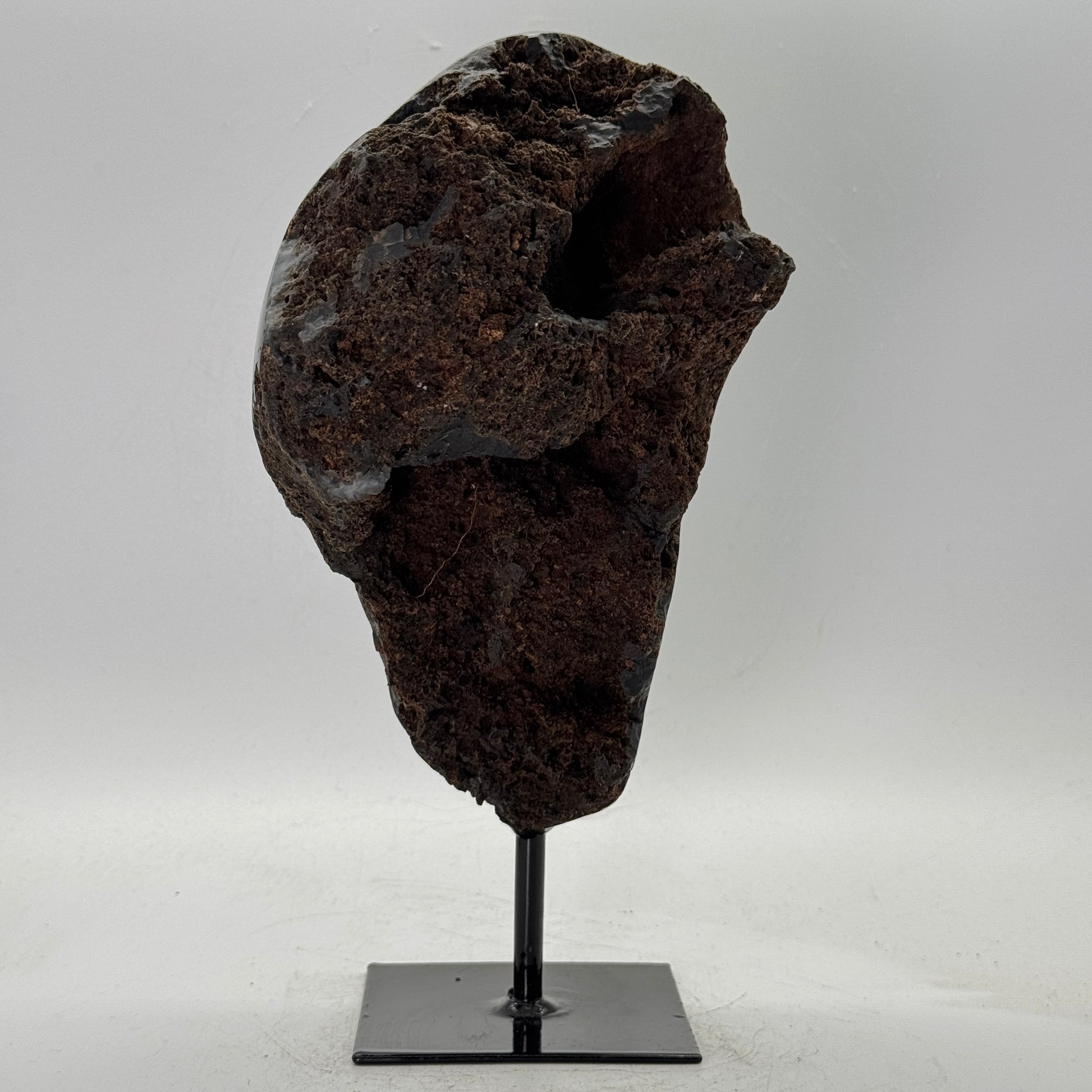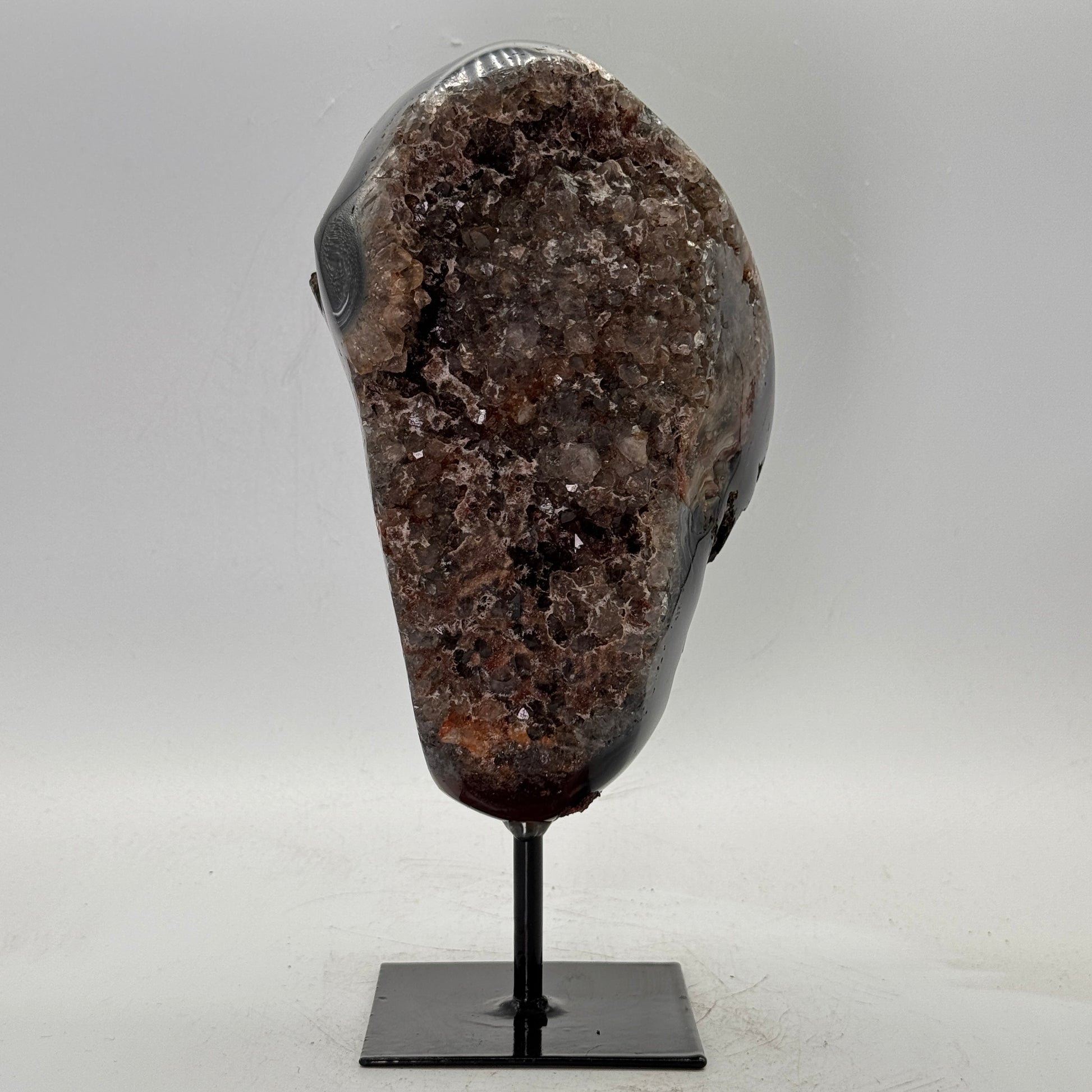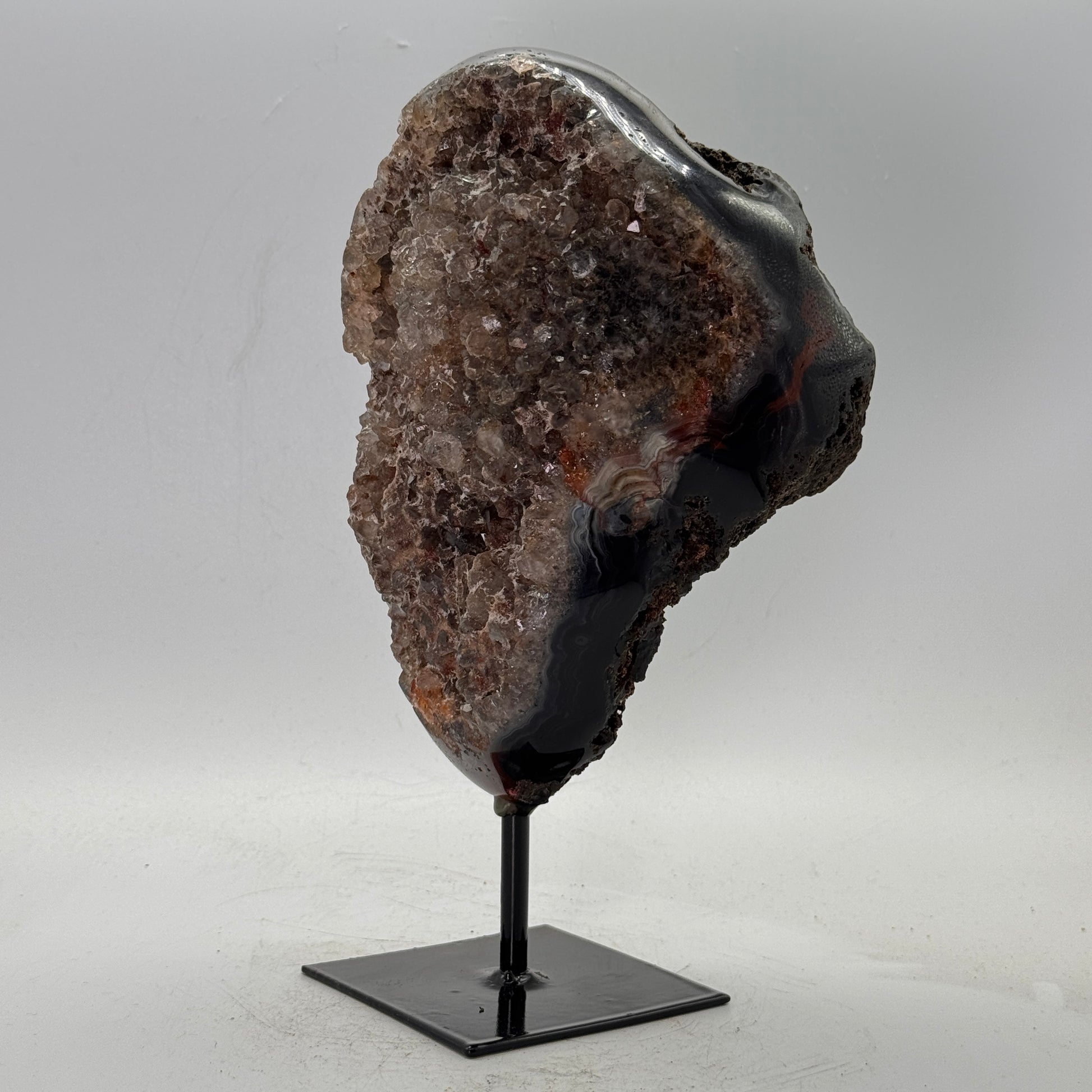 Natuurlijke rots agaat uit Brazilië, stijlvol gepresenteerd op een elegante zwarte metalen standaard. De steen is gepolijst, waardoor de diepe kleuren en bijzondere structuren van de agaat prachtig tot hun recht komen.