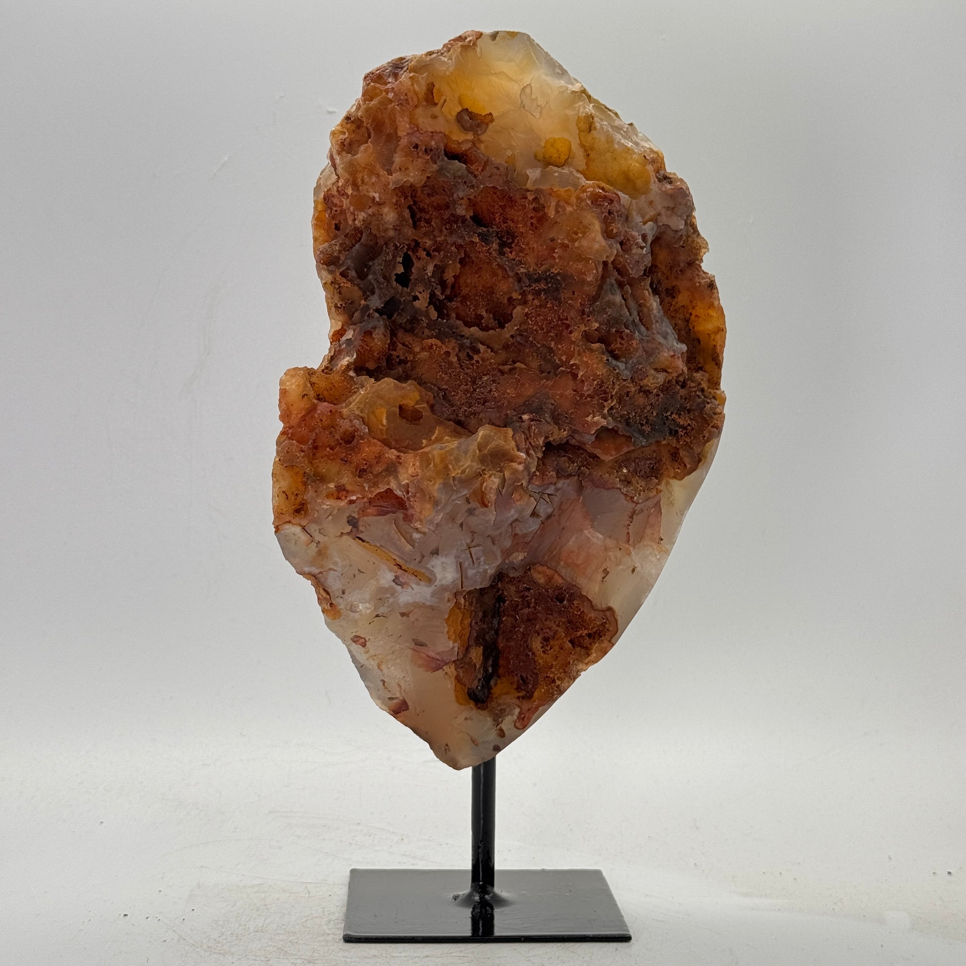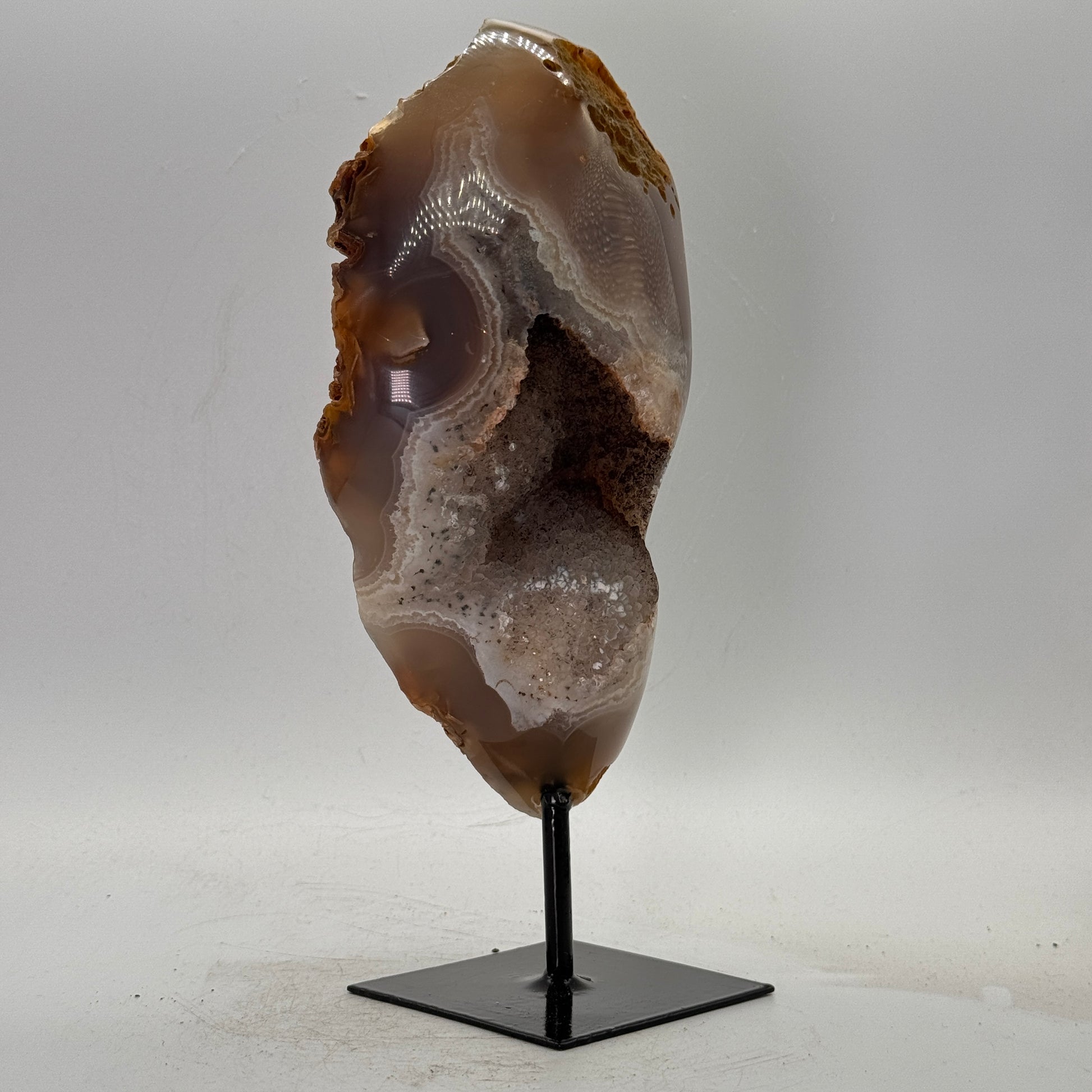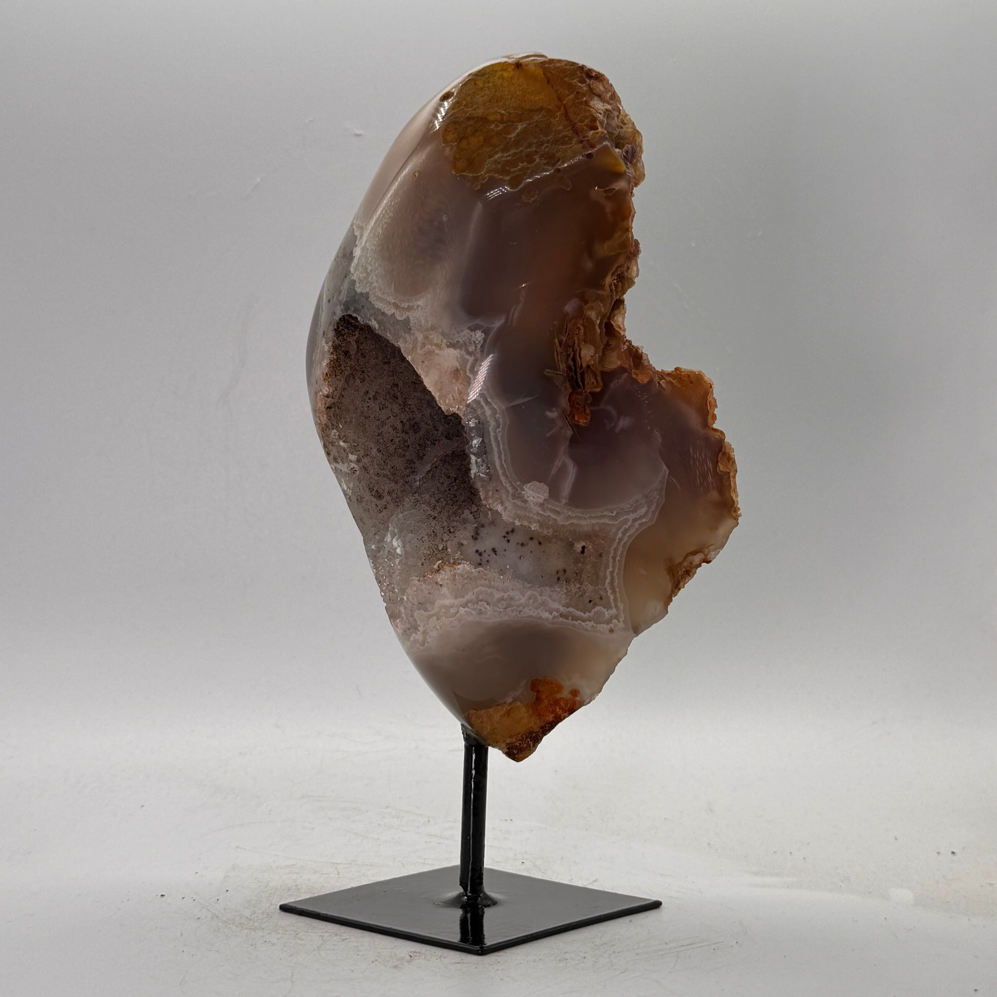 Natuurlijke rots agaat uit Brazilië, stijlvol gepresenteerd op een elegante zwarte metalen standaard. De steen is gepolijst, waardoor de diepe kleuren en bijzondere structuren van de agaat prachtig tot hun recht komen.