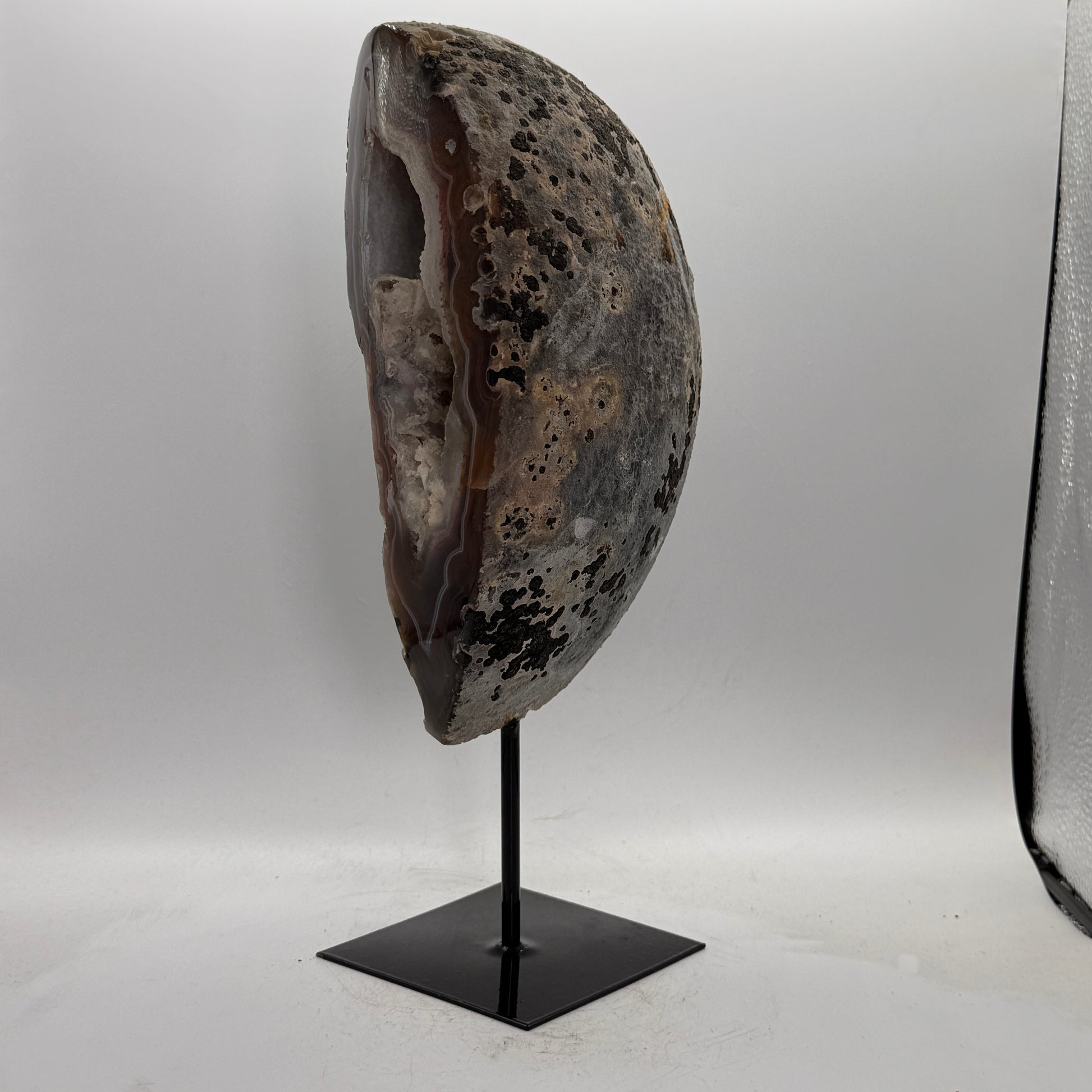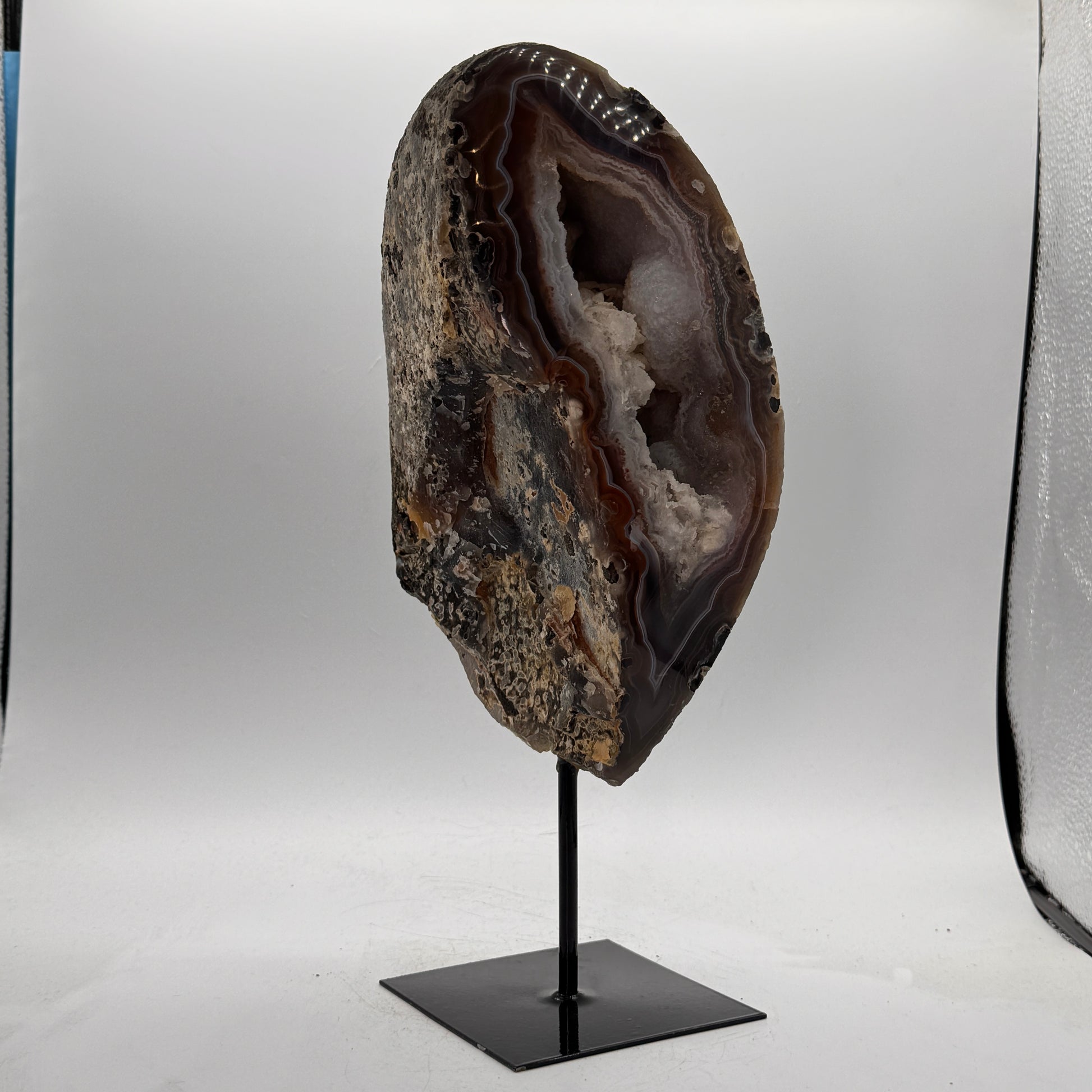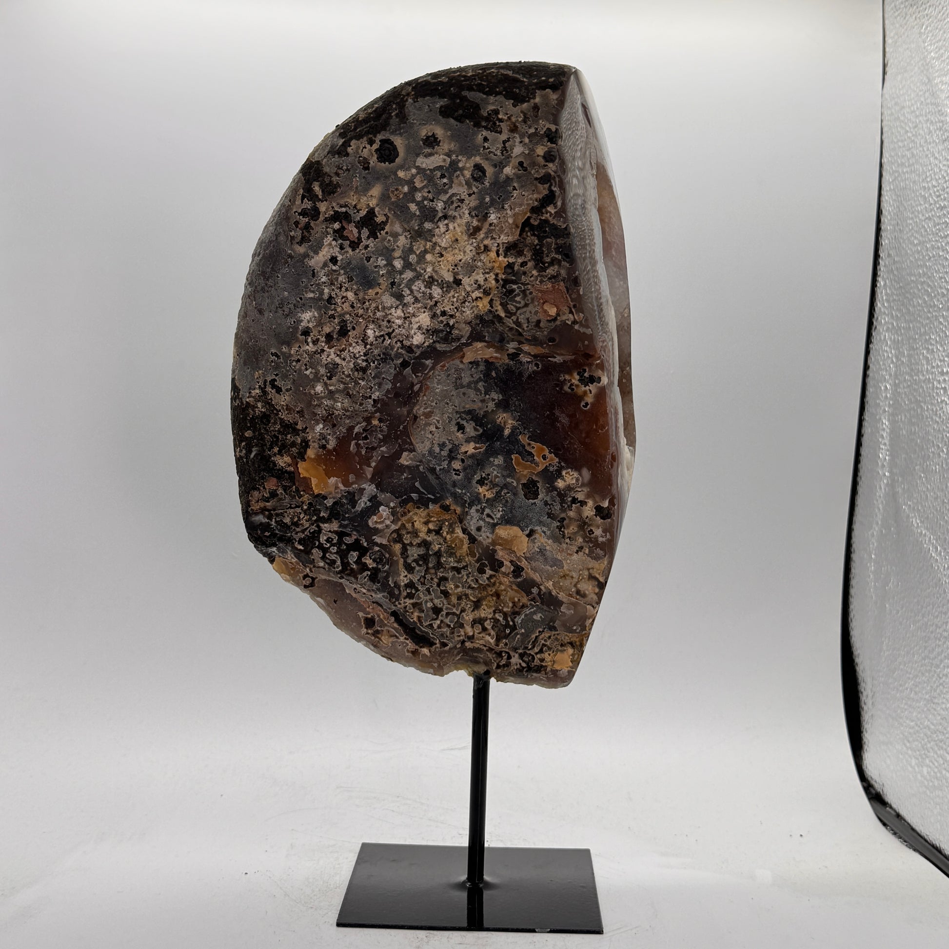 Natuurlijke rots agaat uit Brazilië, stijlvol gepresenteerd op een elegante zwarte metalen standaard. De steen is gepolijst, waardoor de diepe kleuren en bijzondere structuren van de agaat prachtig tot hun recht komen.