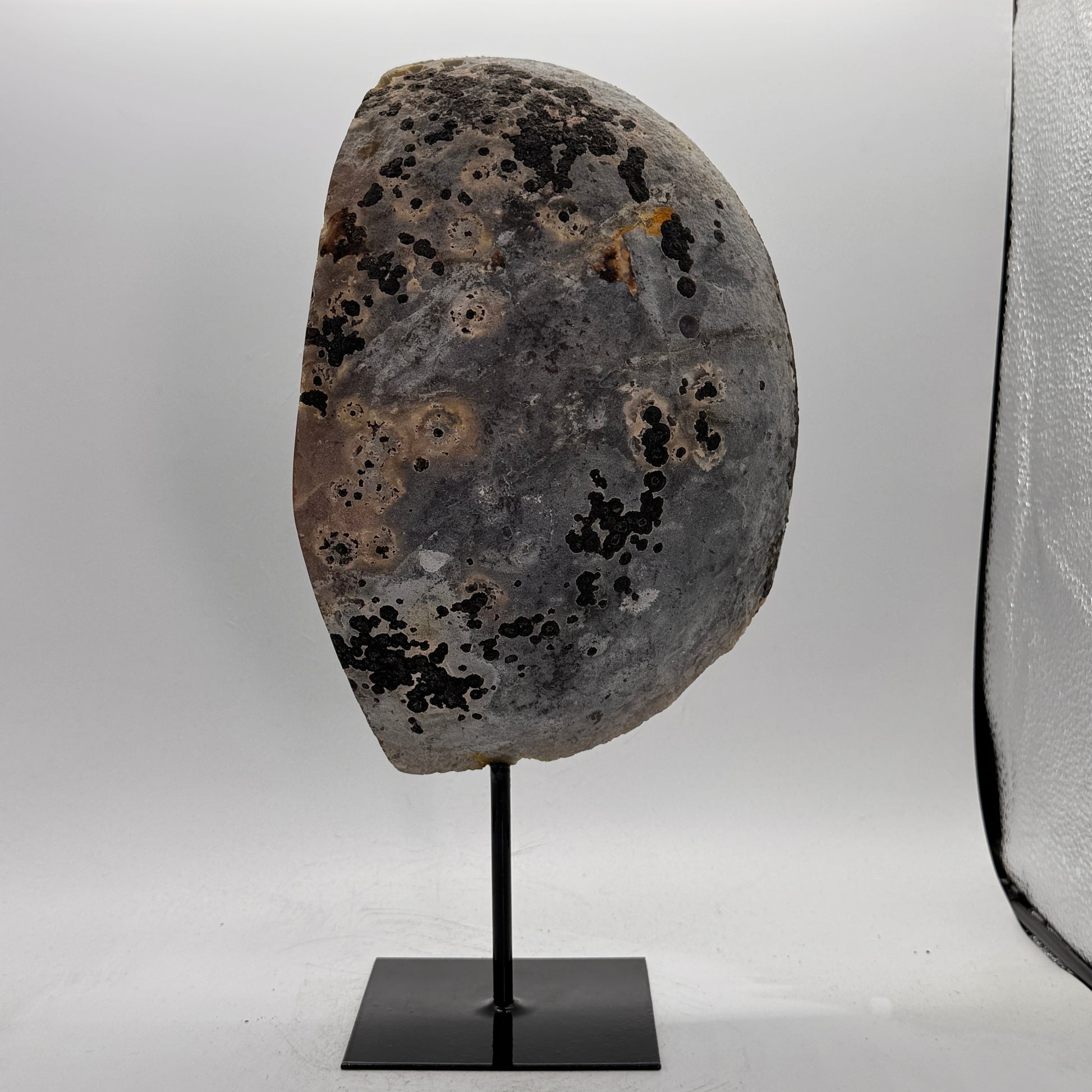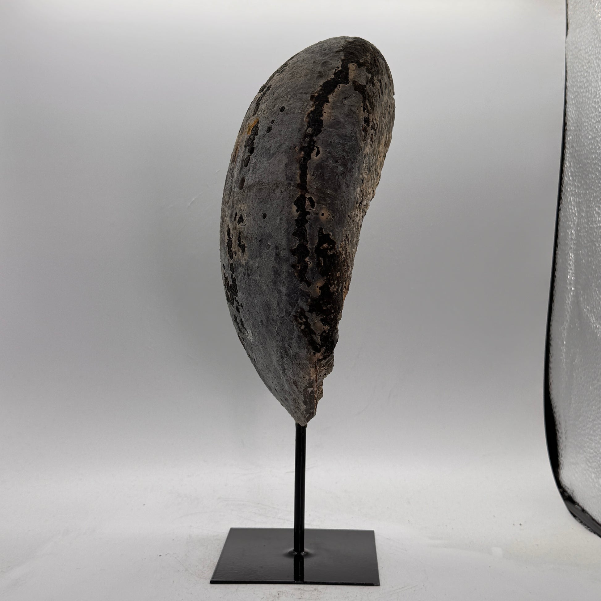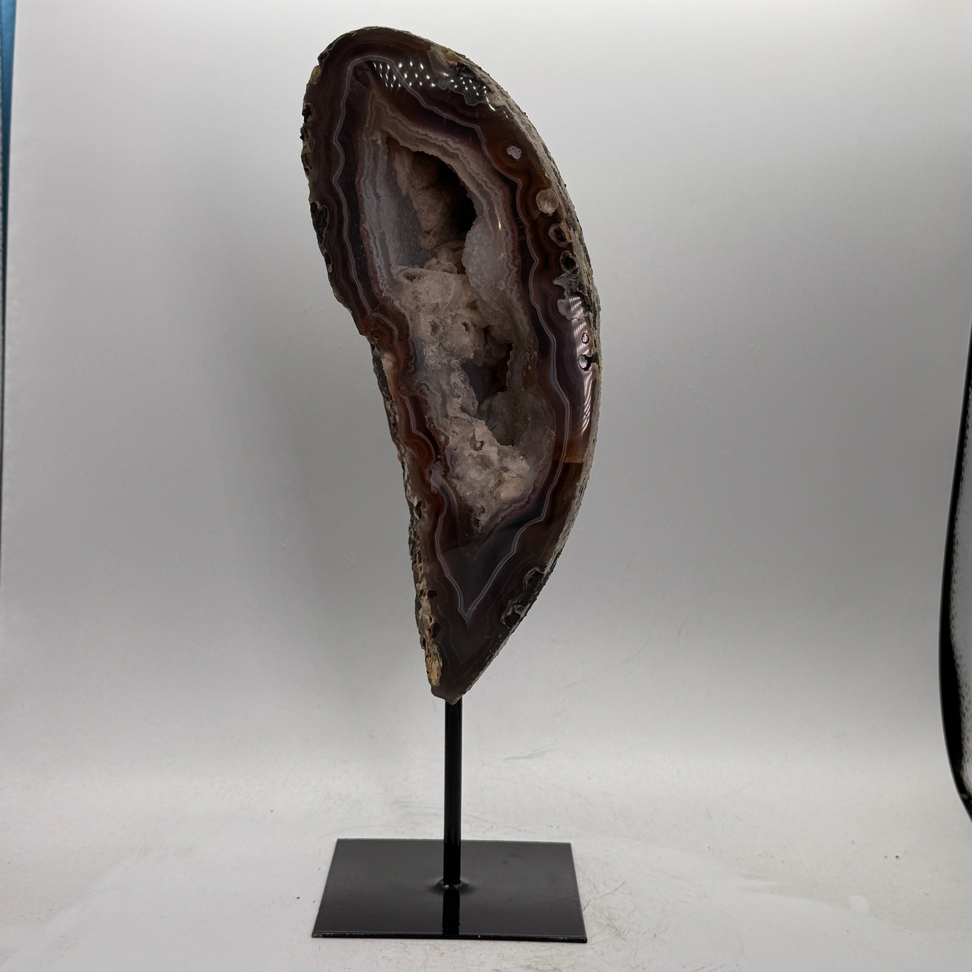 Natuurlijke rots agaat uit Brazilië, stijlvol gepresenteerd op een elegante zwarte metalen standaard. De steen is gepolijst, waardoor de diepe kleuren en bijzondere structuren van de agaat prachtig tot hun recht komen.