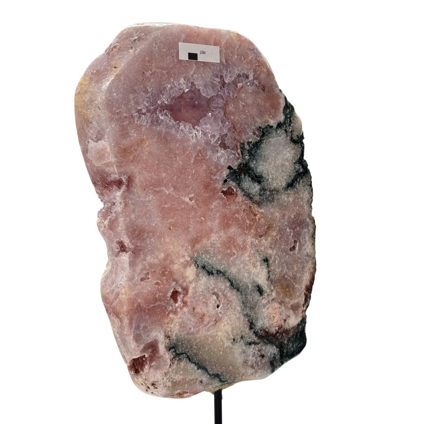 Voeg een vleugje luxe en sereniteit toe aan uw interieur met deze prachtige Roze Amethist, op een elegante zwarte metalen standaard. De voorkant van de steen is zorgvuldig gepolijst, waardoor de schitterende druzy-kristallen en natuurlijke kleurpatronen prachtig naar voren komen.