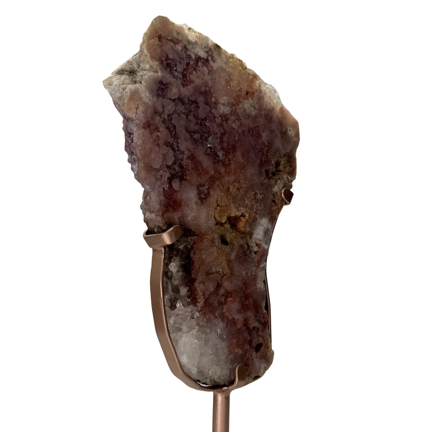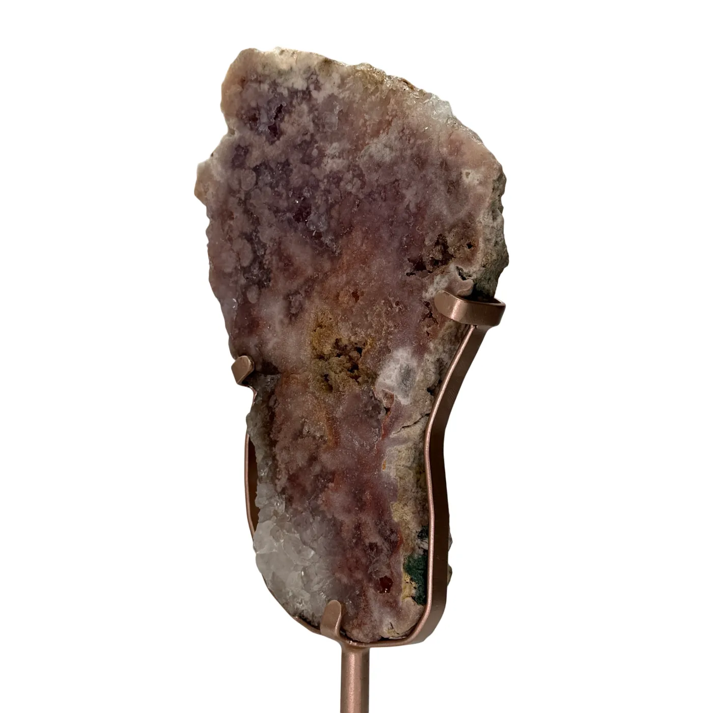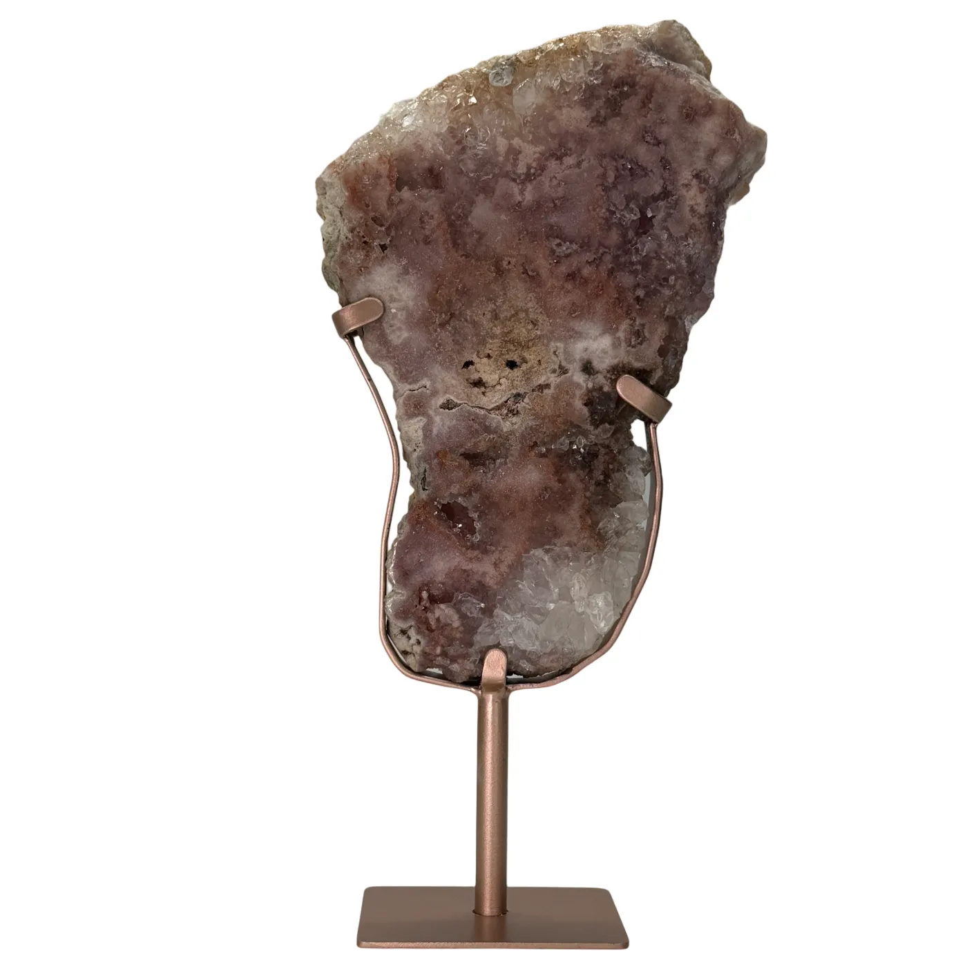 Prachtige roze amethist van hoge kwaliteit op een rosé metalen standaard. De steen is gepolijst aan de voorkant en achterkant, waardoor de zachte roze tinten en natuurlijke structuren extra mooi tot hun recht komen. Dankzij de elegante vorm en luxe uitstraling is dit een uniek decoratief object en een echte eyecatcher in elk interieur.