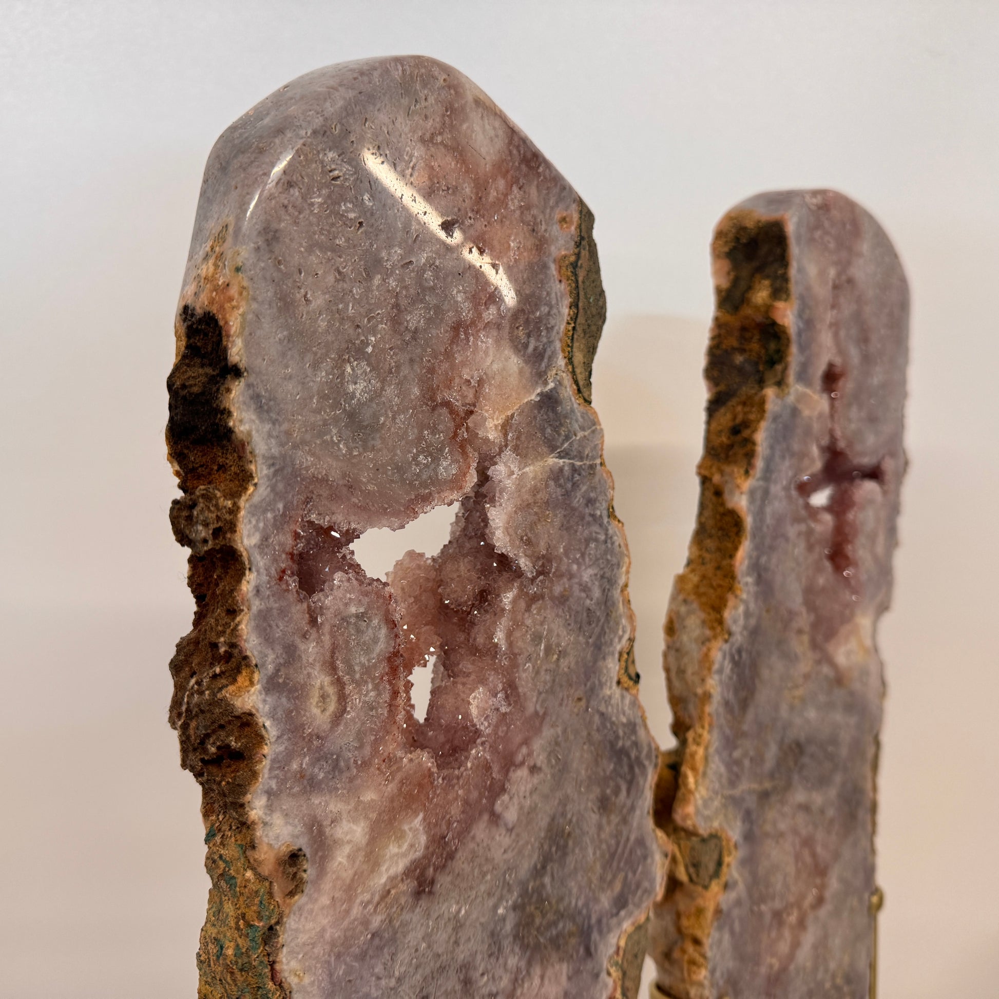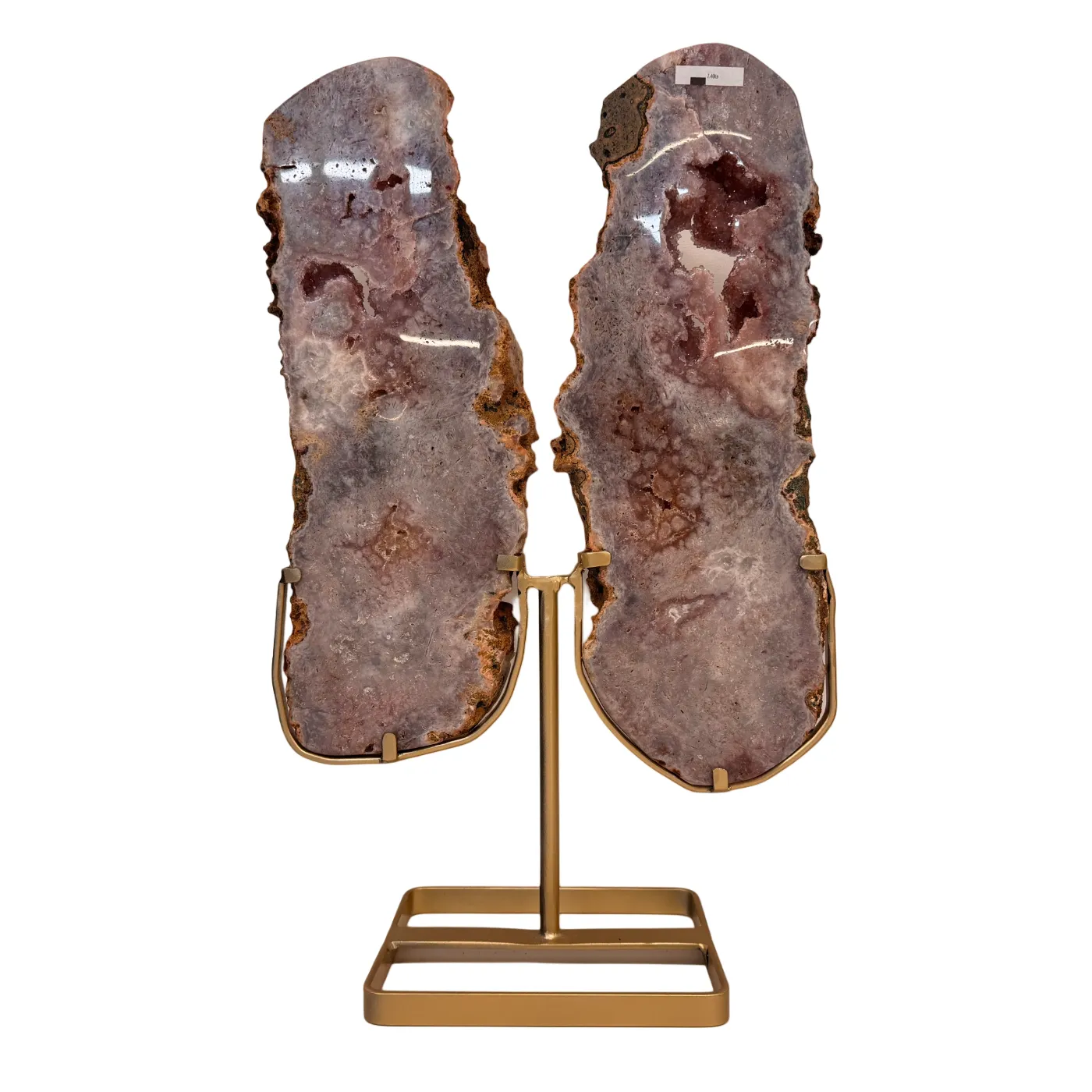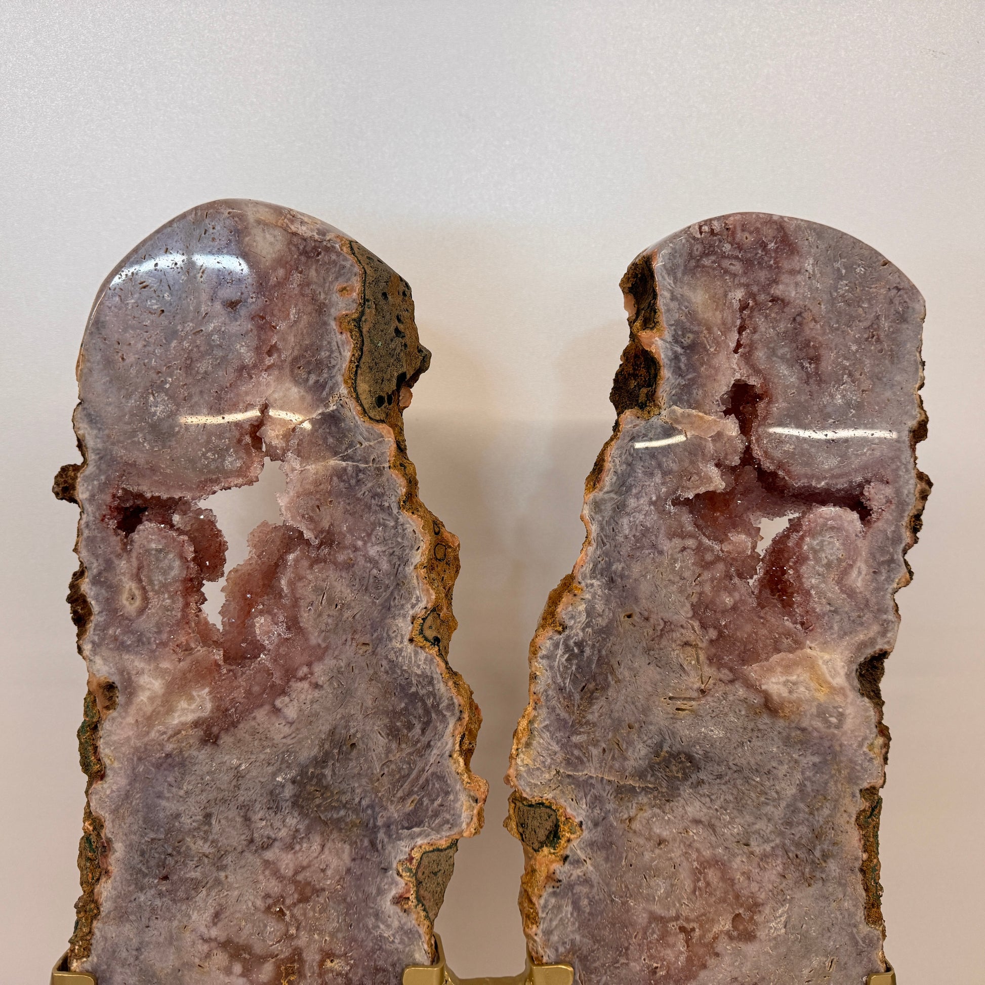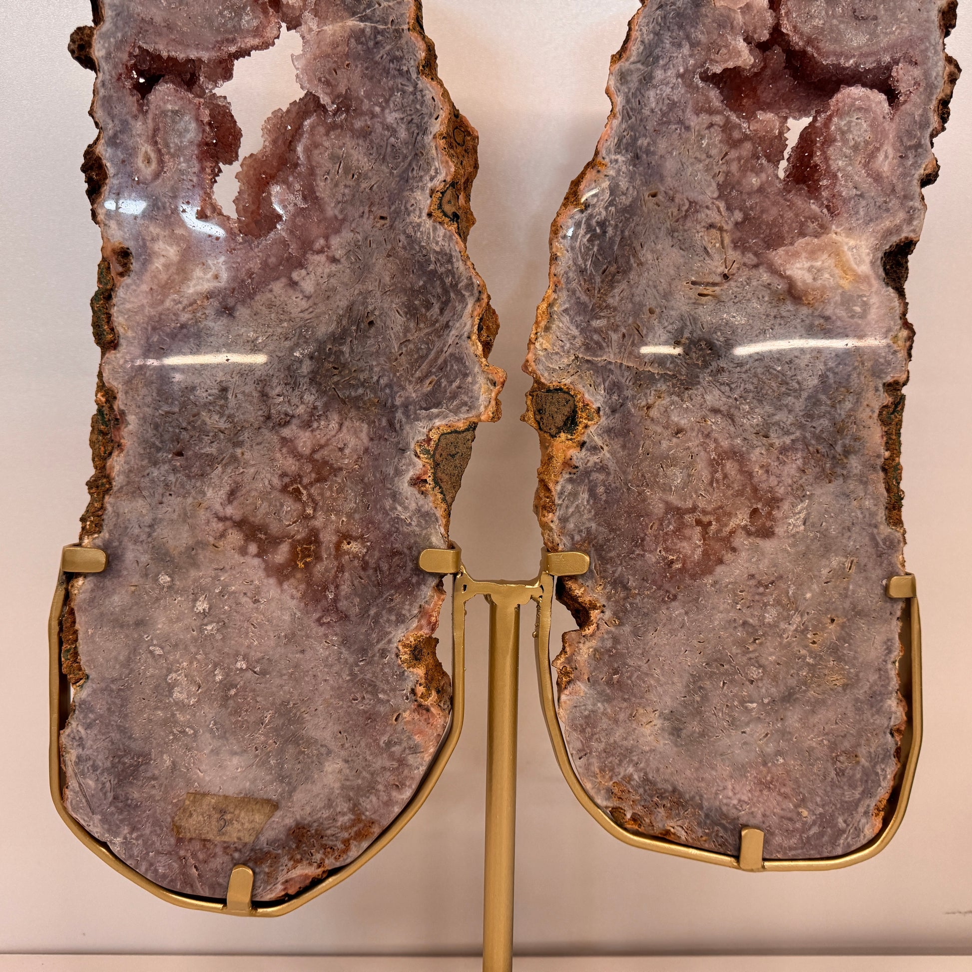 Prachtige roze amethist met druzy op een luxe gouden metalen standaard. Deze bijzondere creatie bestaat uit twee slabs (platen) van ca. 3 cm dik die uit één en dezelfde steen zijn geslepen. Samen vormen ze een elegant vlindereffect, waarbij de twee helften als vleugels naast elkaar staan.