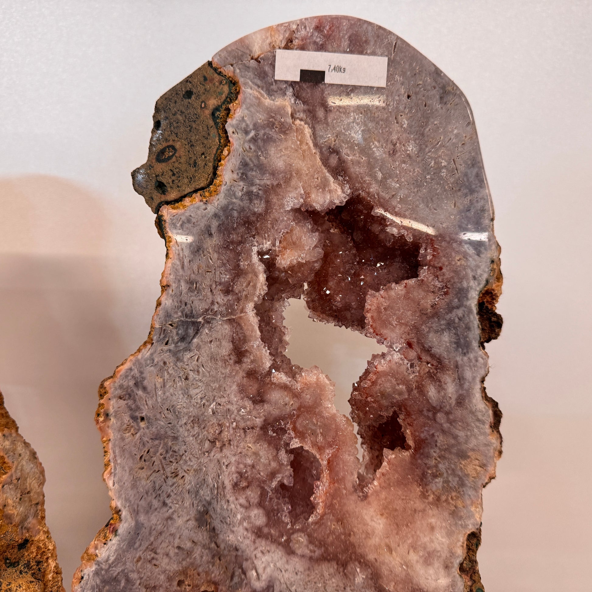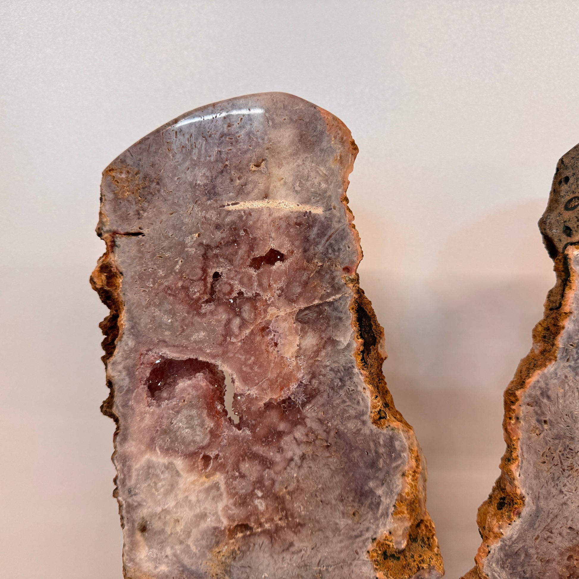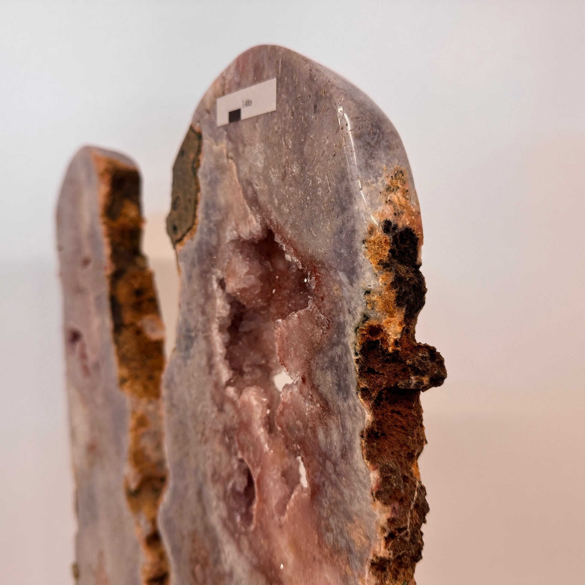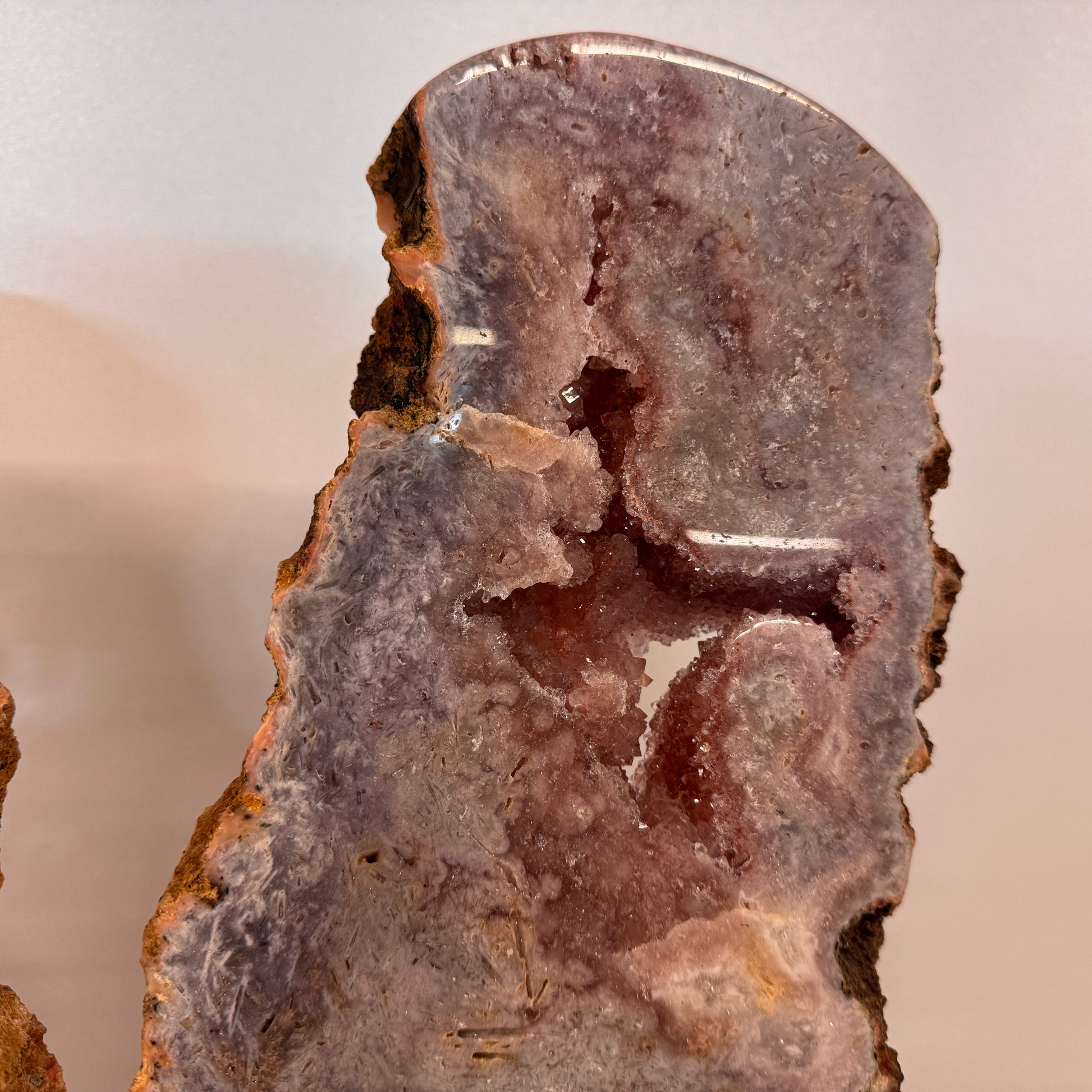 De roze amethist is aan beide zijden gepolijst, waardoor de natuurlijke patronen, kristalstructuren en zachte kleuren optimaal zichtbaar zijn. In het midden schittert een subtiele druzy laag vol fijne kristallen die het geheel extra diepte geven.