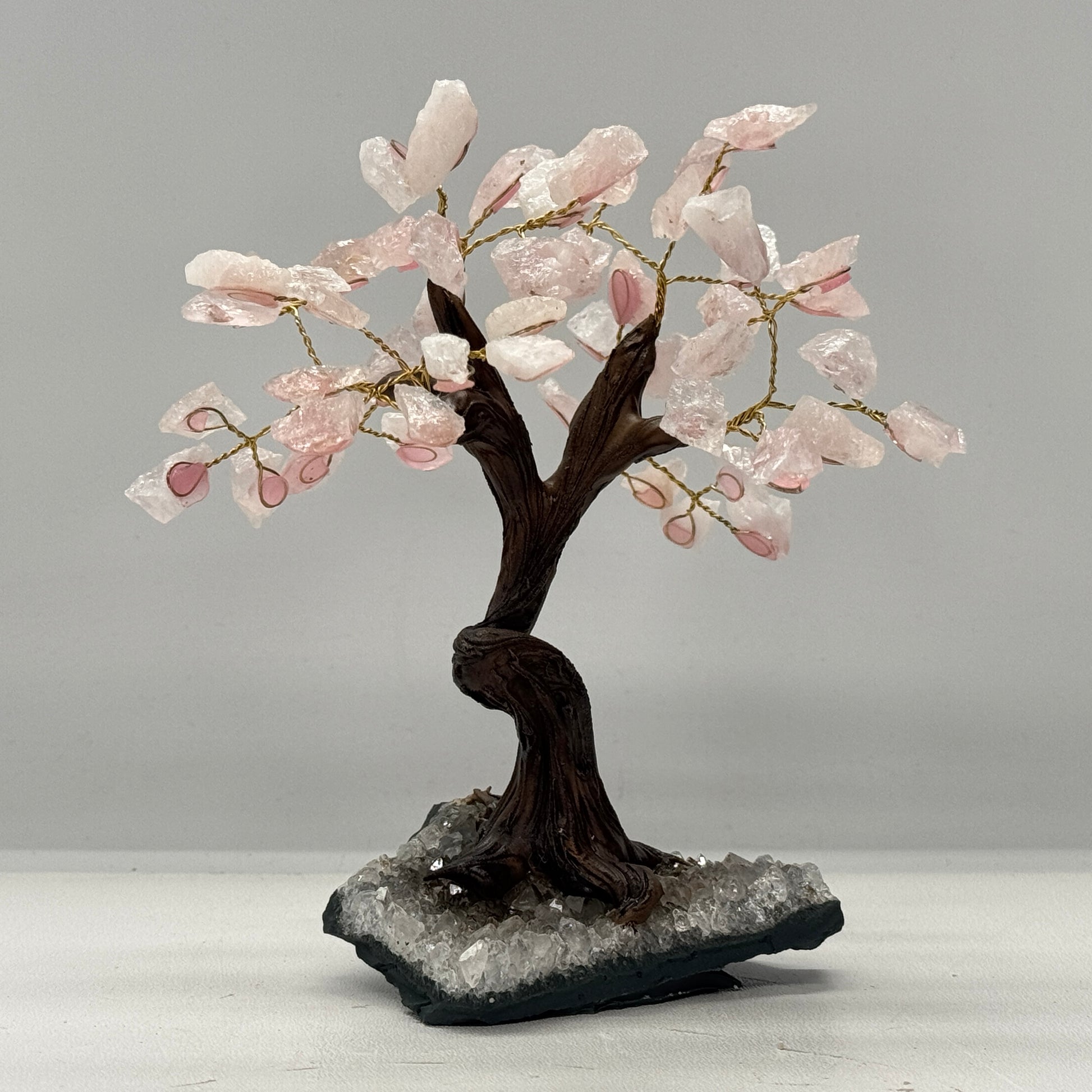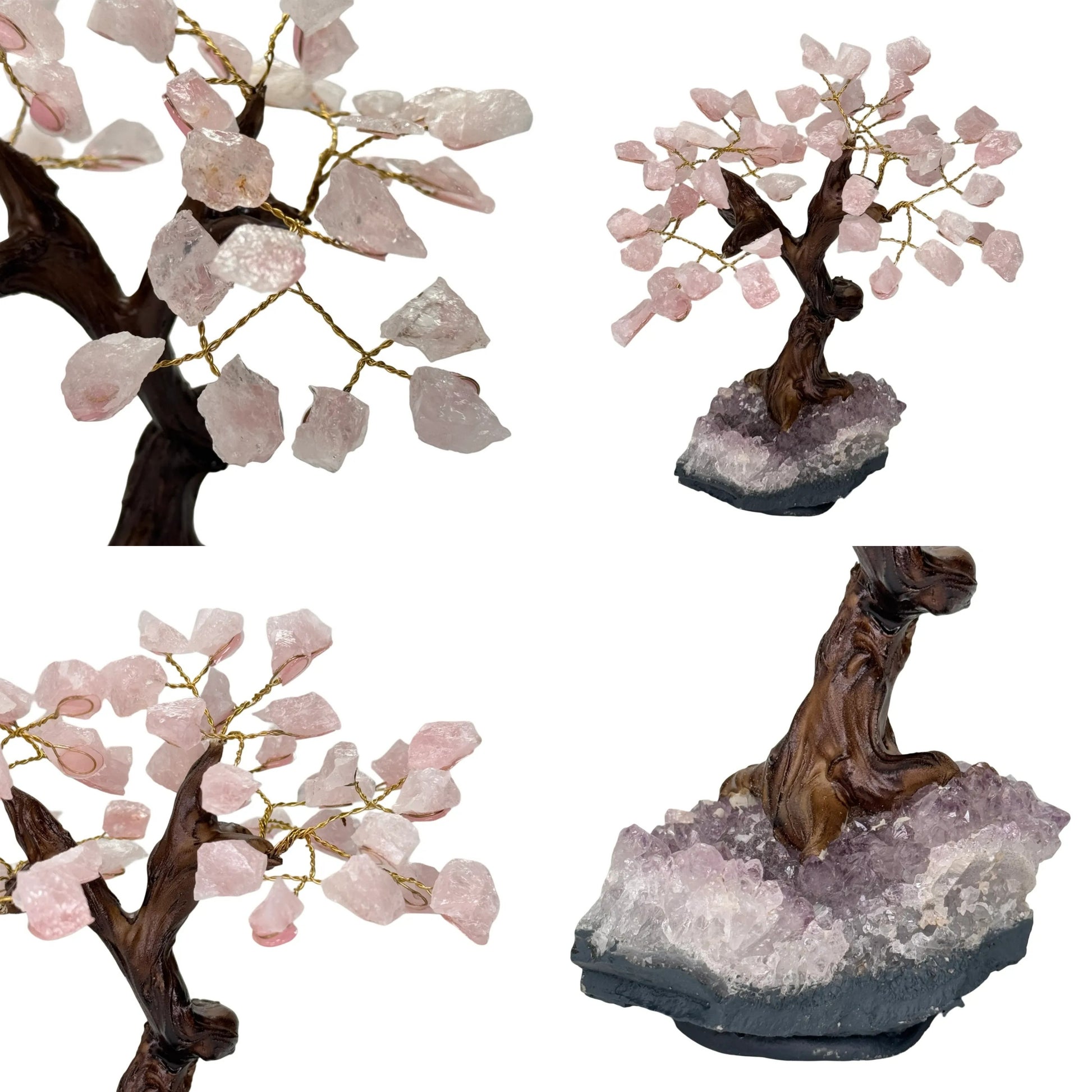Een sfeervol en uniek edelstenen boompje, met ruwe stukjes rozenkwarts als bladeren. De boom staat op een prachtige amethist basis, waardoor de warme roze tinten van de rozenkwarts nog mooier uitkomen.
