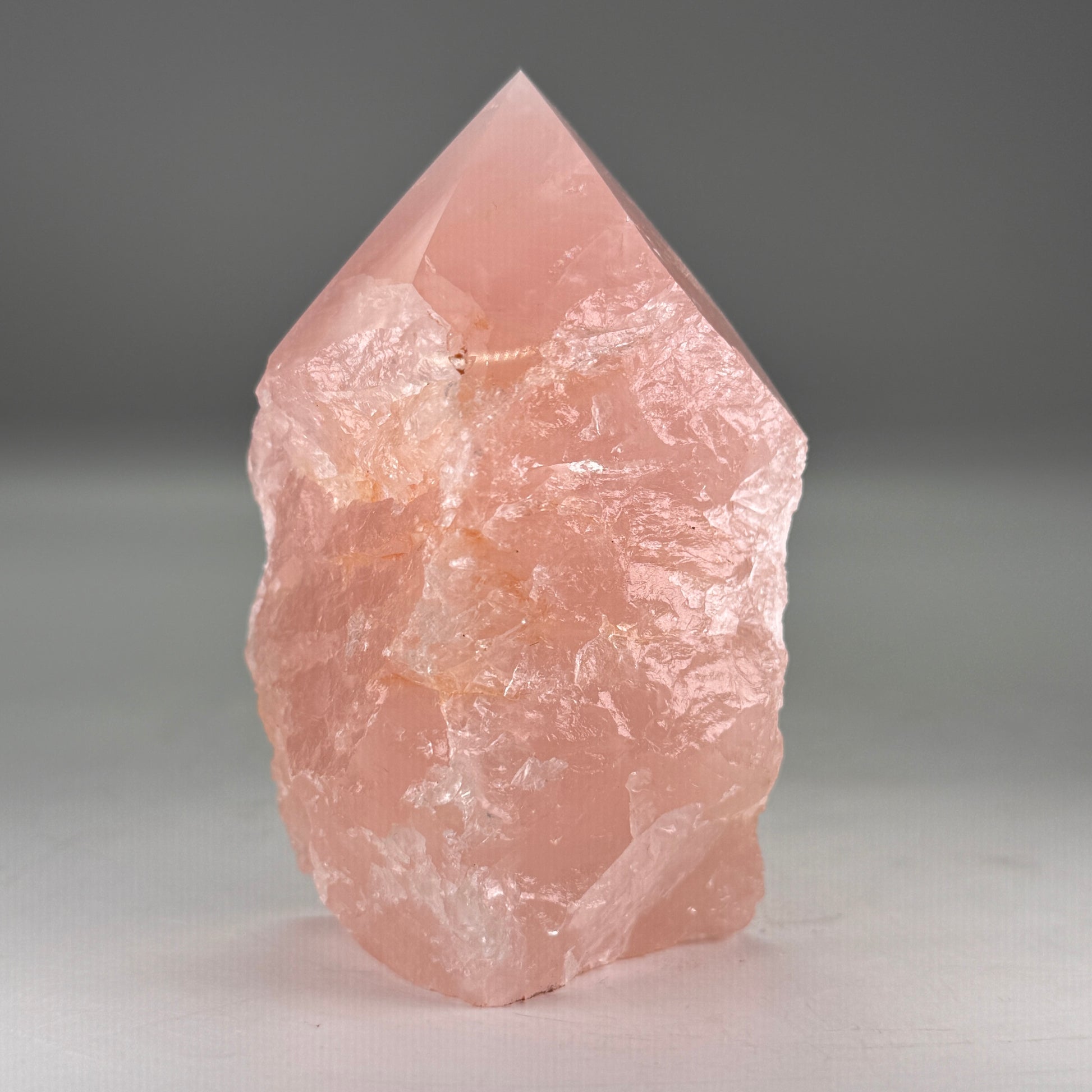 De bovenkant van de steen is glad gepolijst, waardoor de natuurlijke structuren en zachte roze tinten van de rozenkwarts mooi zichtbaar zijn.