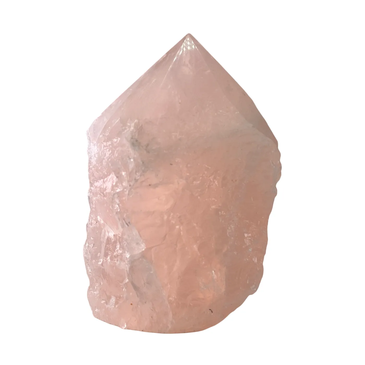 Prachtige rozenkwarts punt afkomstig uit Brazilië. De bovenkant van de steen is glad gepolijst, waardoor de zachte roze tinten en natuurlijke structuren van de rozenkwarts prachtig naar voren komen.