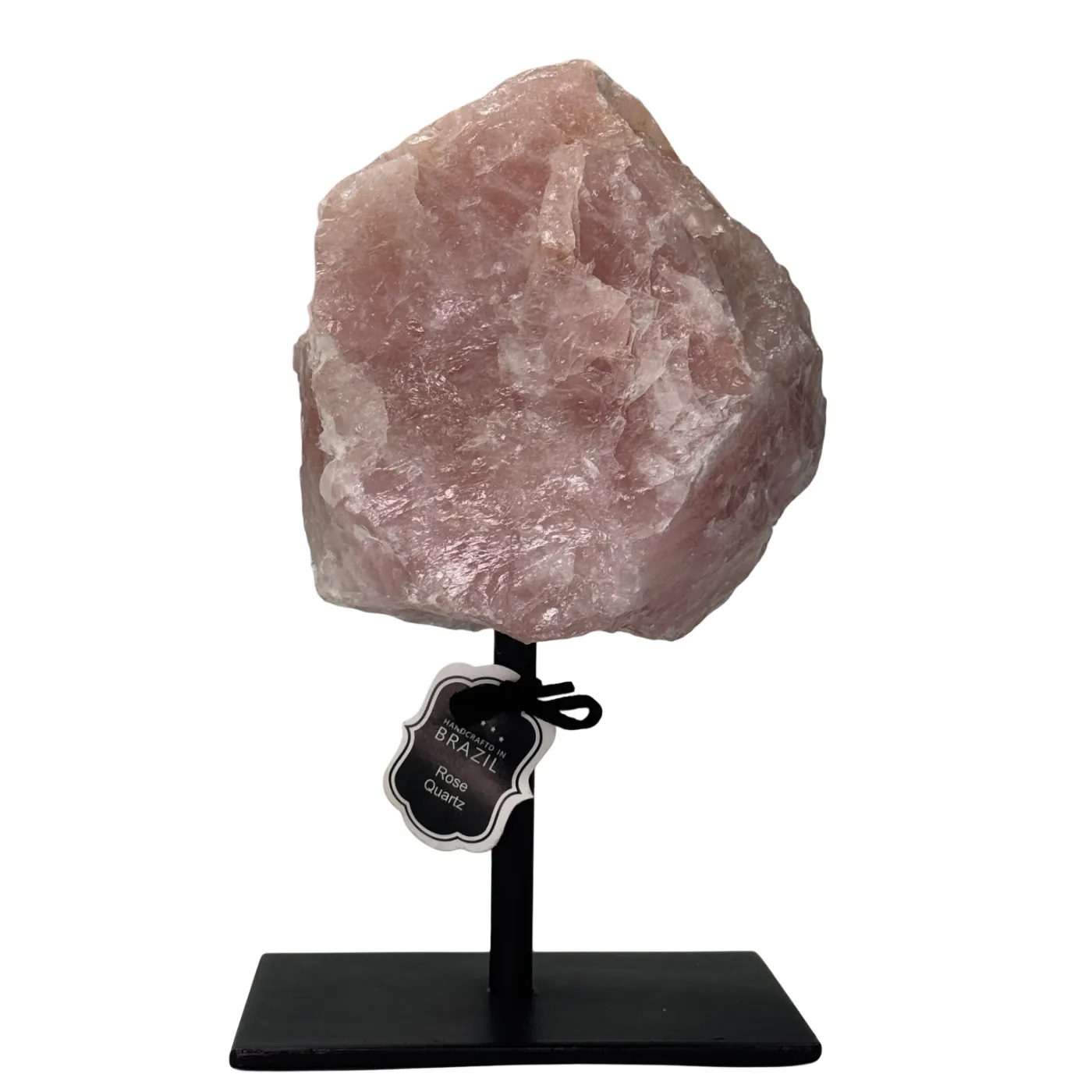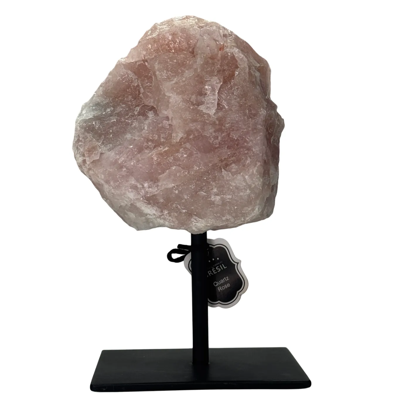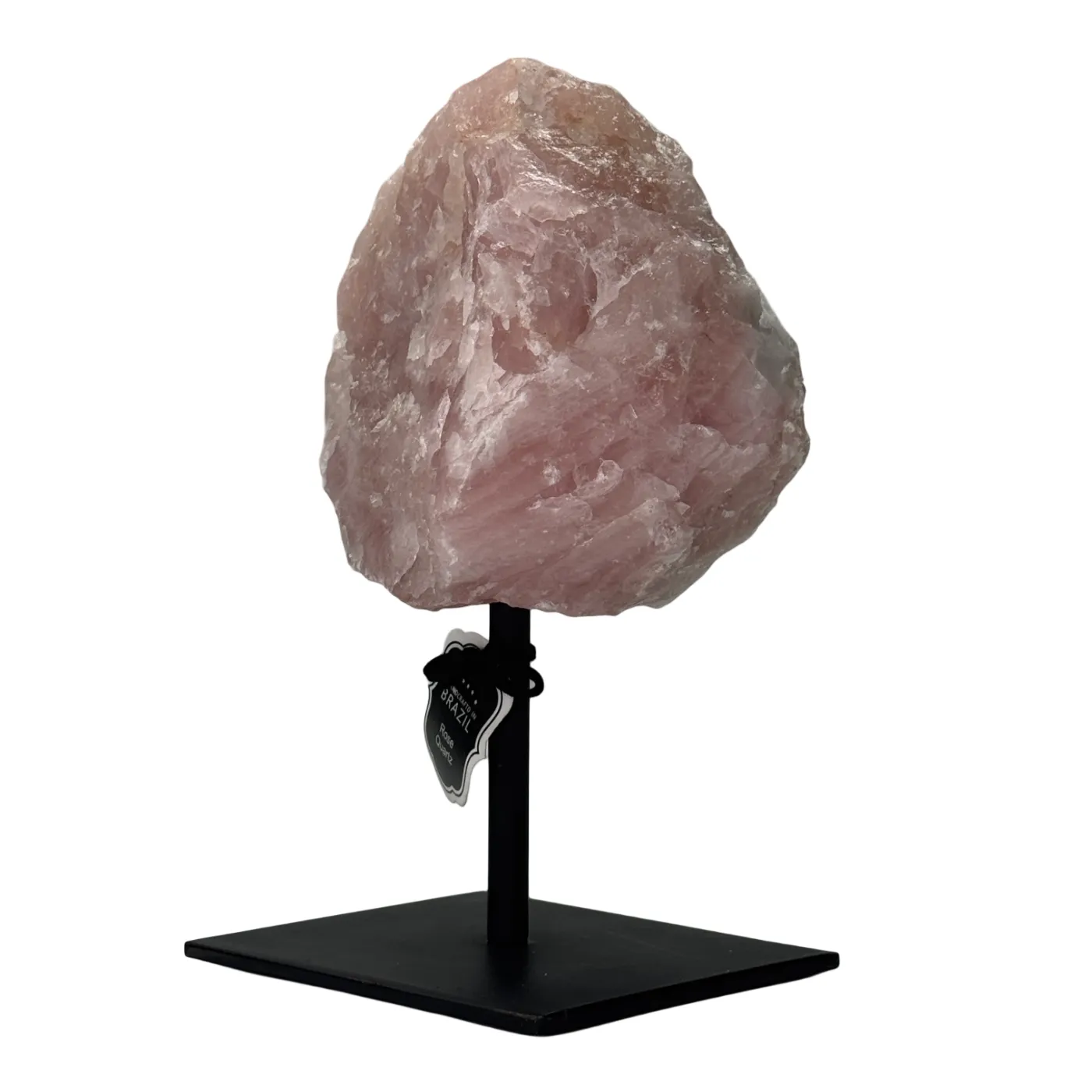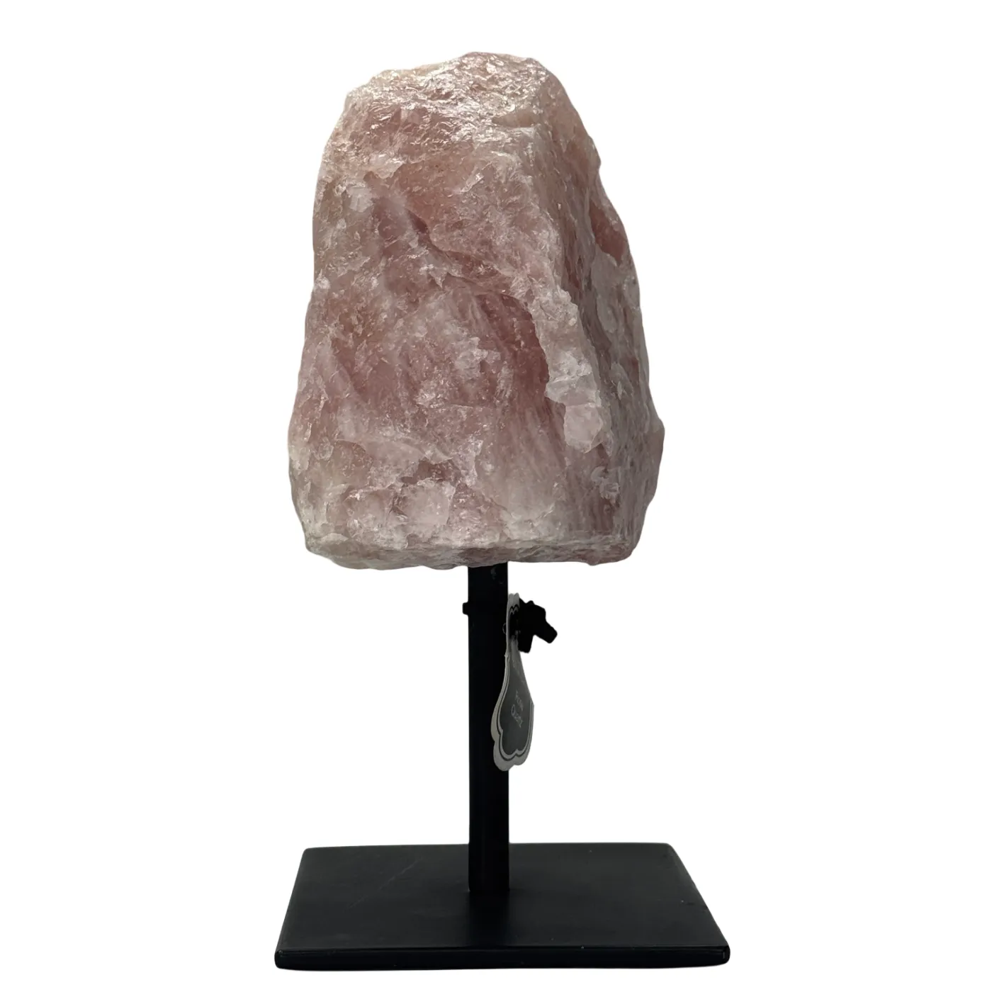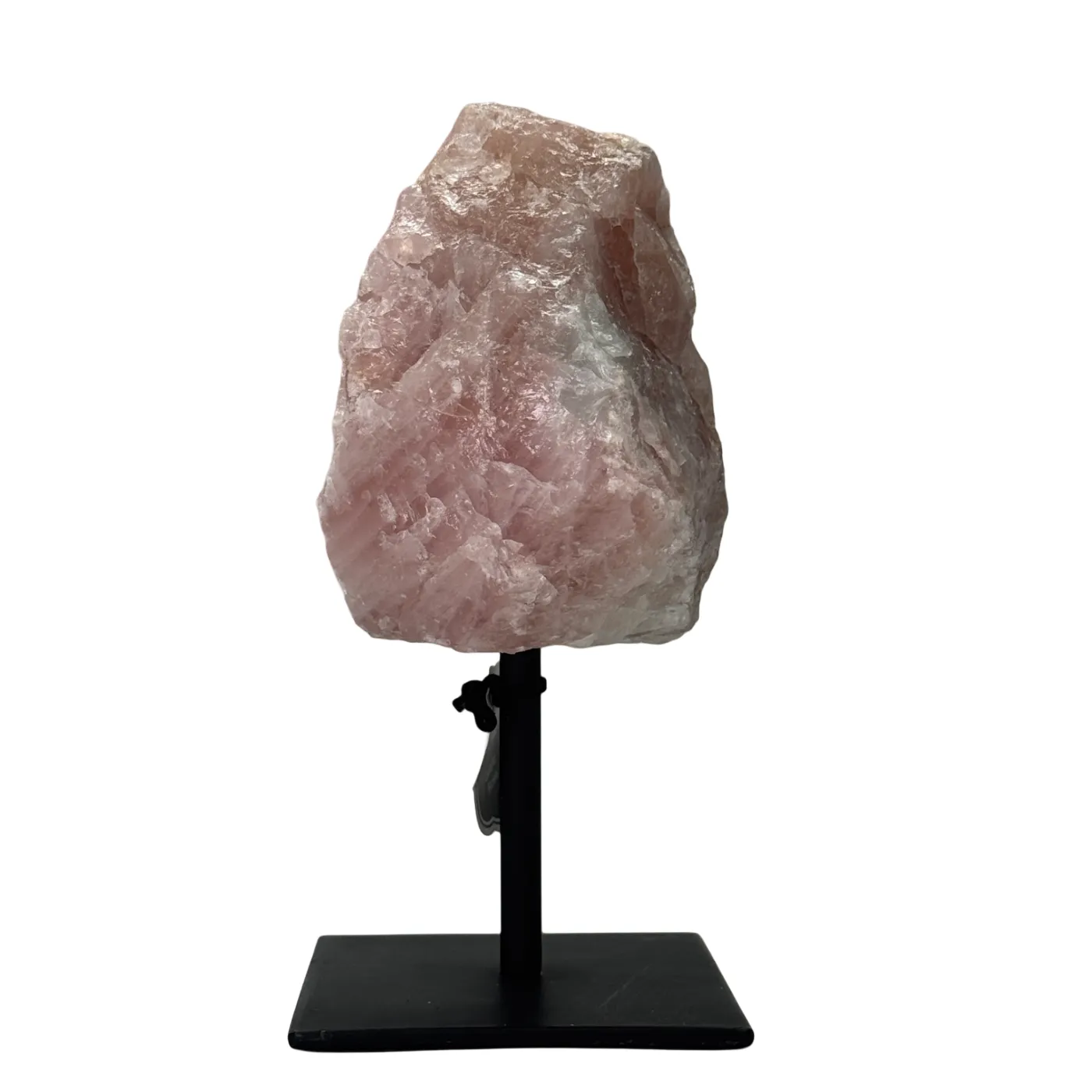 Deze ruwe rozenkwarts is volledig natuurlijk en onbewerkt, afkomstig uit Brazilië. Rozenkwarts staat bekend als de steen van de liefde en wordt vaak geassocieerd met rust, harmonie en een kalmerende werking. Dankzij de metalen standaard is dit stuk perfect om neer te zetten als subtiele, natuurlijke decoratie in huis of op kantoor.