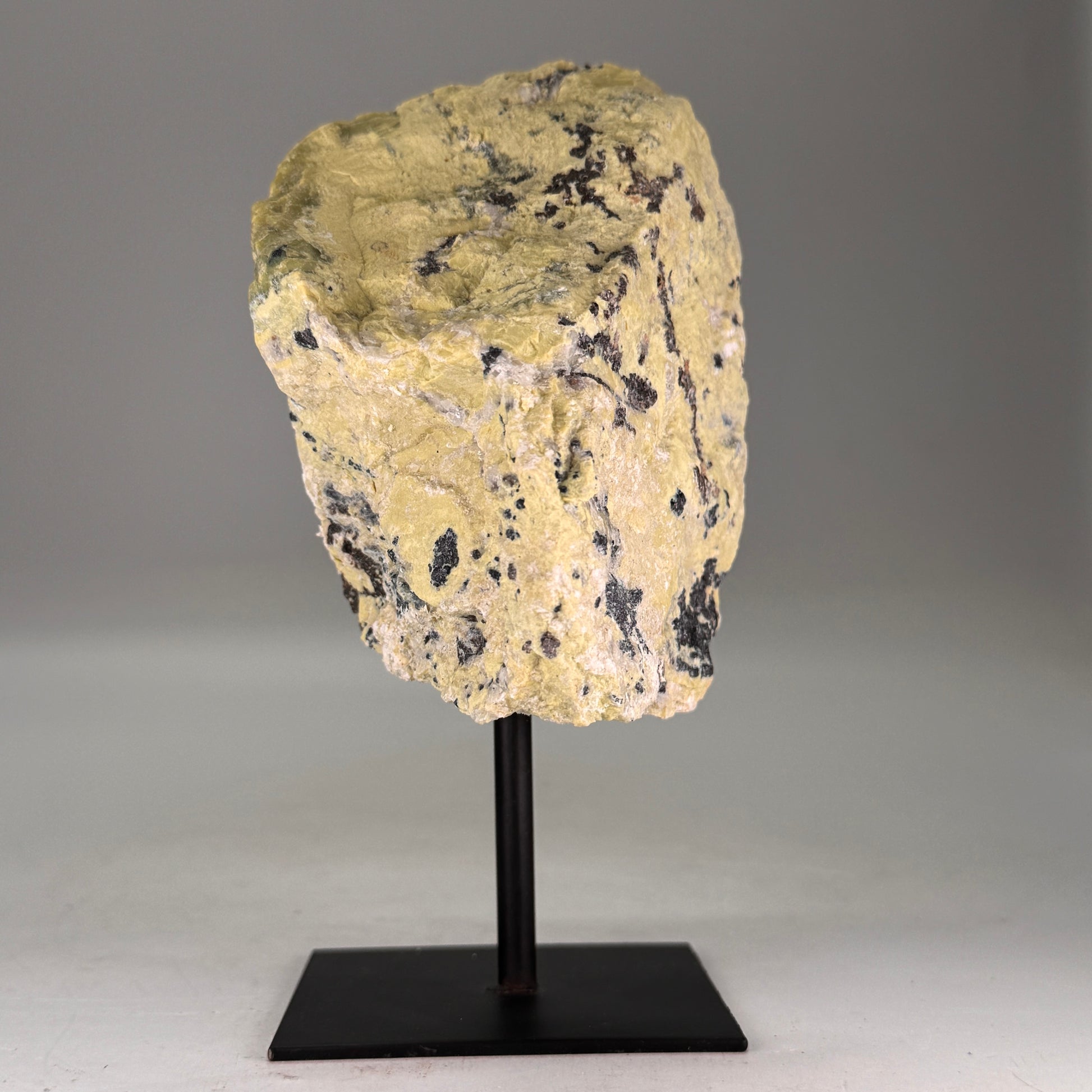 Prachtige lichtgroene serpentijn, volledig ruw en onbewerkt, geplaatst op een elegante zwarte metalen standaard. De natuurlijke vormen en zachte groene tinten maken dit een stijlvolle decoratie voor elk interieur of werkruimte.