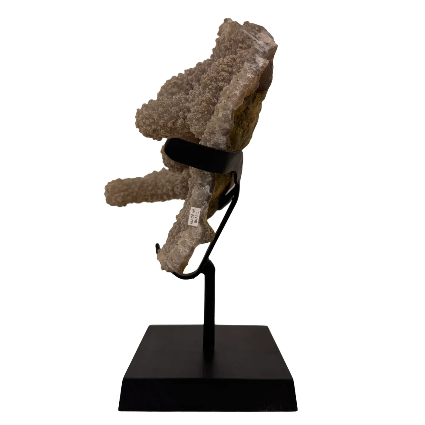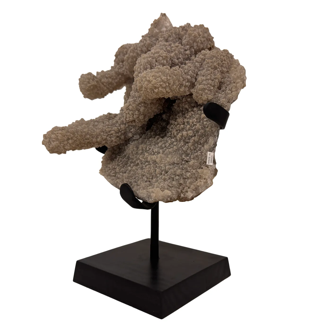 Deze stalactiet weegt 1,5 kg en is afkomstig uit Brazilië. De steen staat stevig op een elegante houten voet, waardoor het geheel een stijlvolle en natuurlijke uitstraling heeft – perfect als decoratief of verzamelobject.