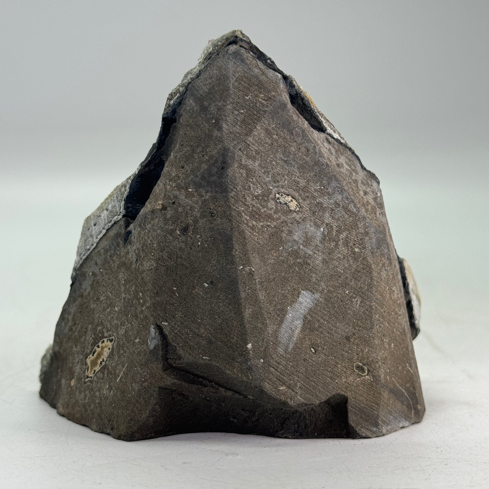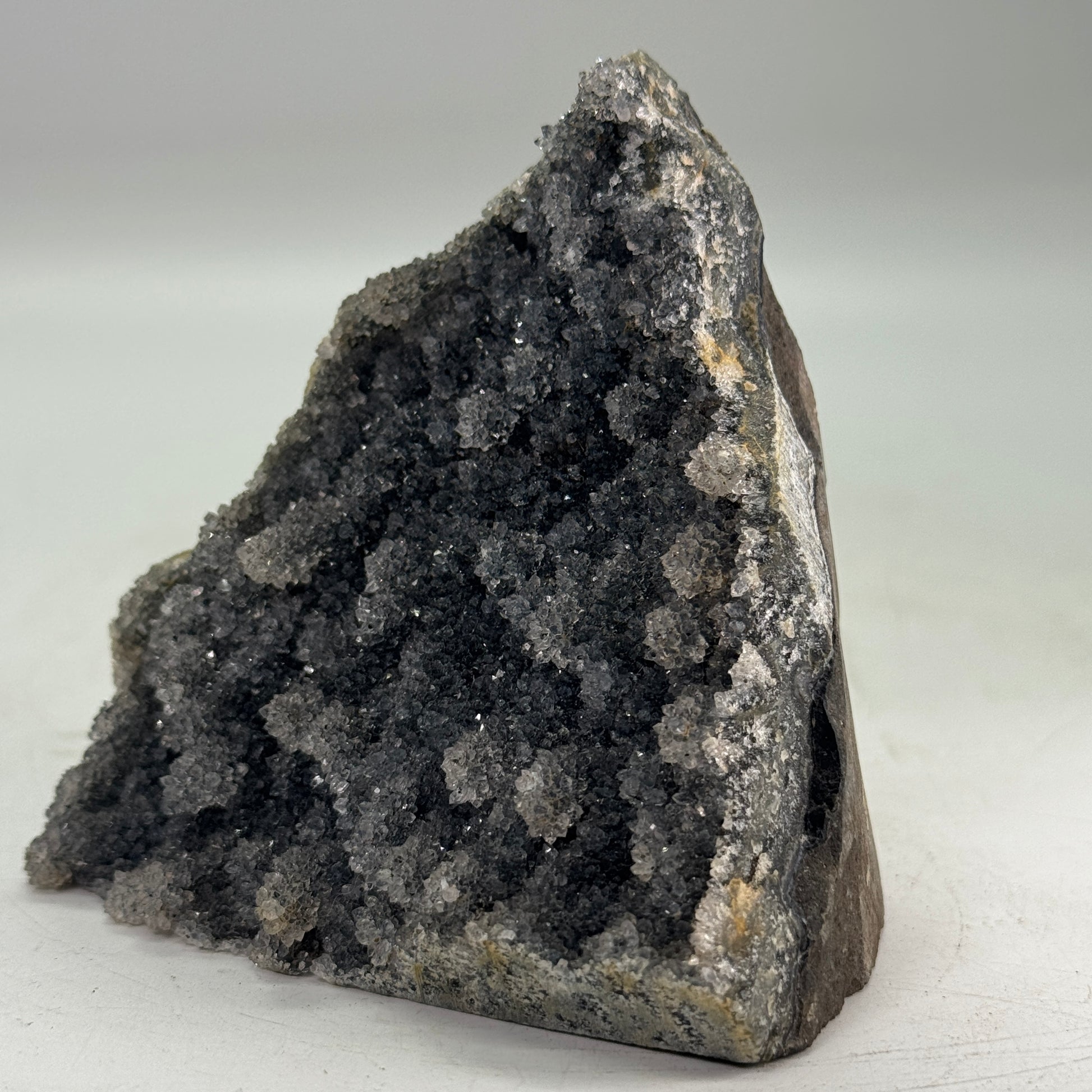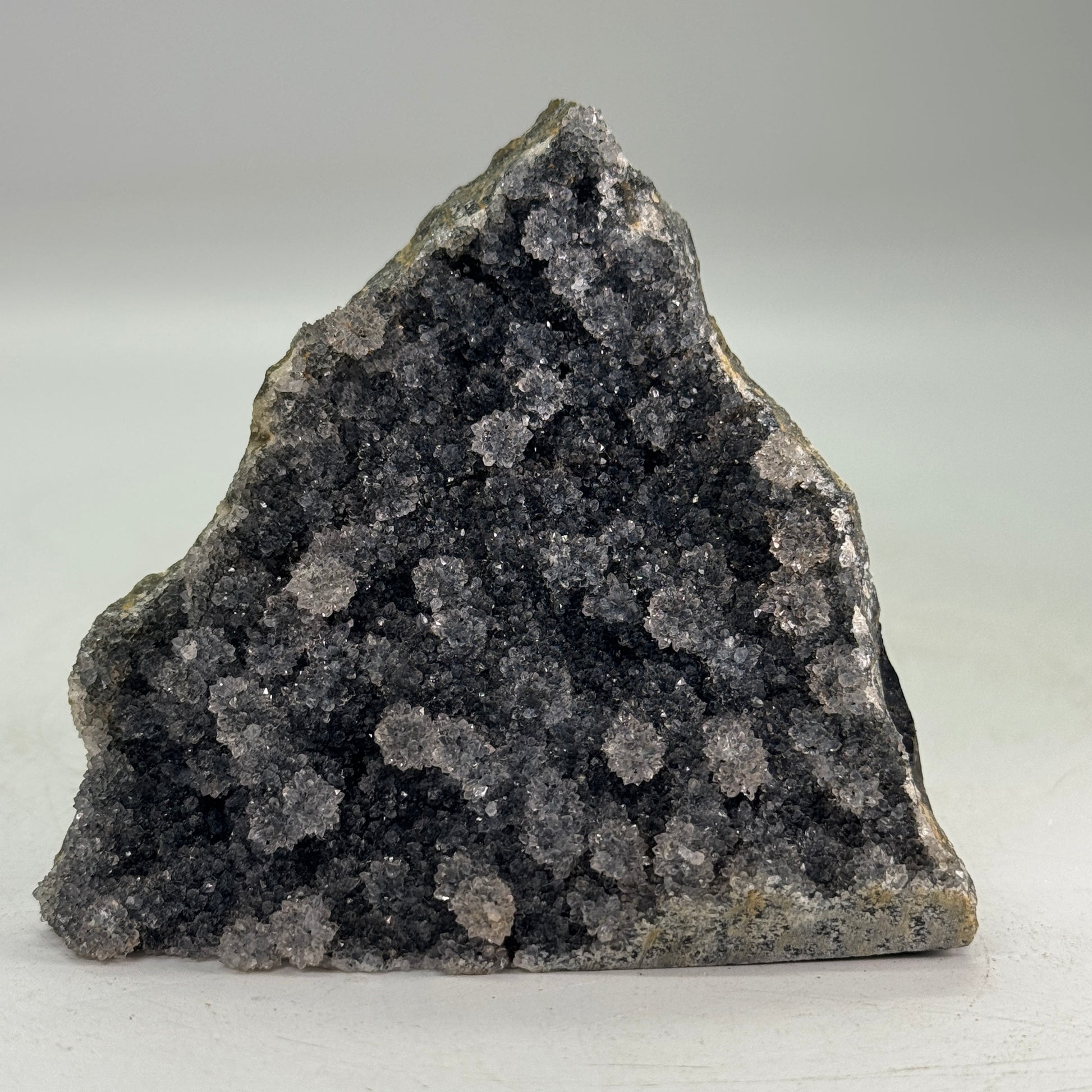 Deze bijzondere sugar amethist heeft talloze kleine kristallen die prachtig glinsteren wanneer het licht erop valt. De amethist heeft een diep grijs-paarse tint en is aan de onderzijde vlak geslepen (cut base), waardoor het stuk stevig en stabiel blijft staan.