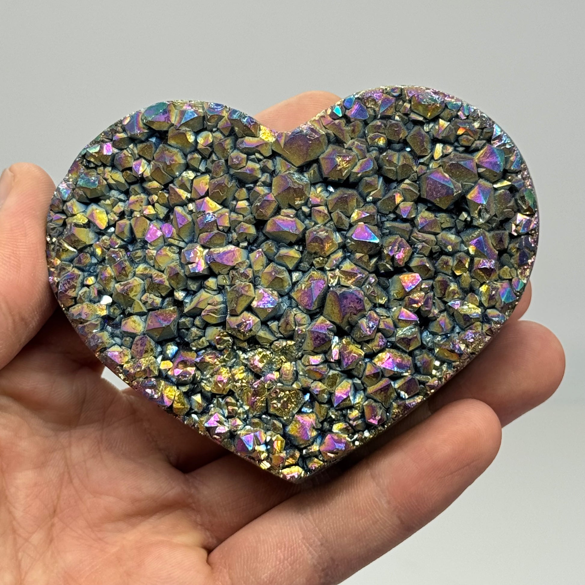 Kwarts met titanium rainbow gepolijst in een hart vorm. Circa 9 cm breed.