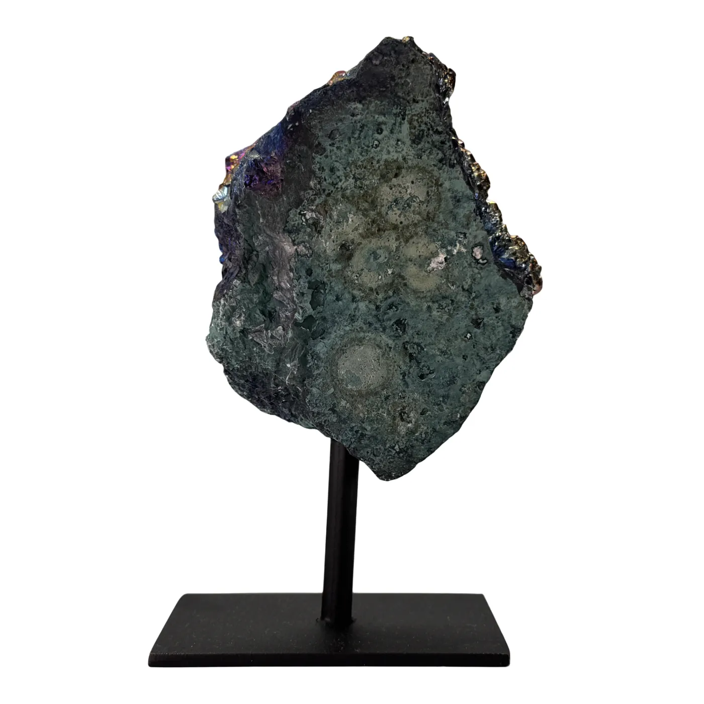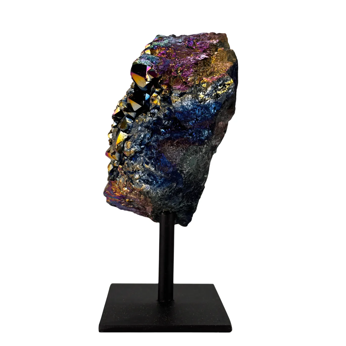 Prachtige kwarts cluster, verhit en behandeld met titanium en platina, waardoor er prachtige regenboogkleuren ontstaat. Het glanzende oppervlak en de sprankelende kristalpunten maken dit stuk tot een echte eyecatcher in elk interieur.