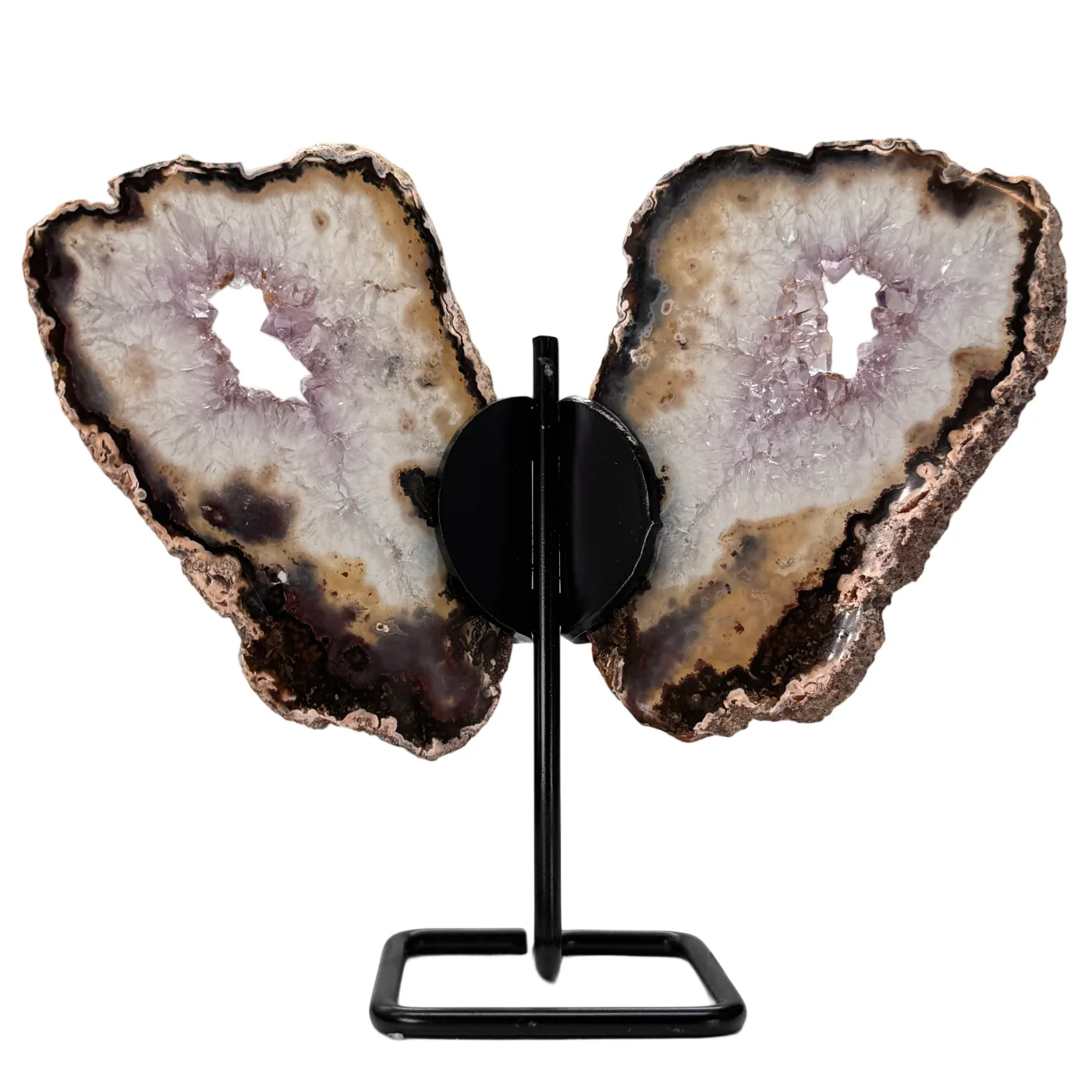 De stenen zijn afkomstig uit Brazilië en zijn zorgvuldig bevestigd op een elegante zwarte metalen standaard. Een bijzondere blikvanger die perfect past in elk interieur.
