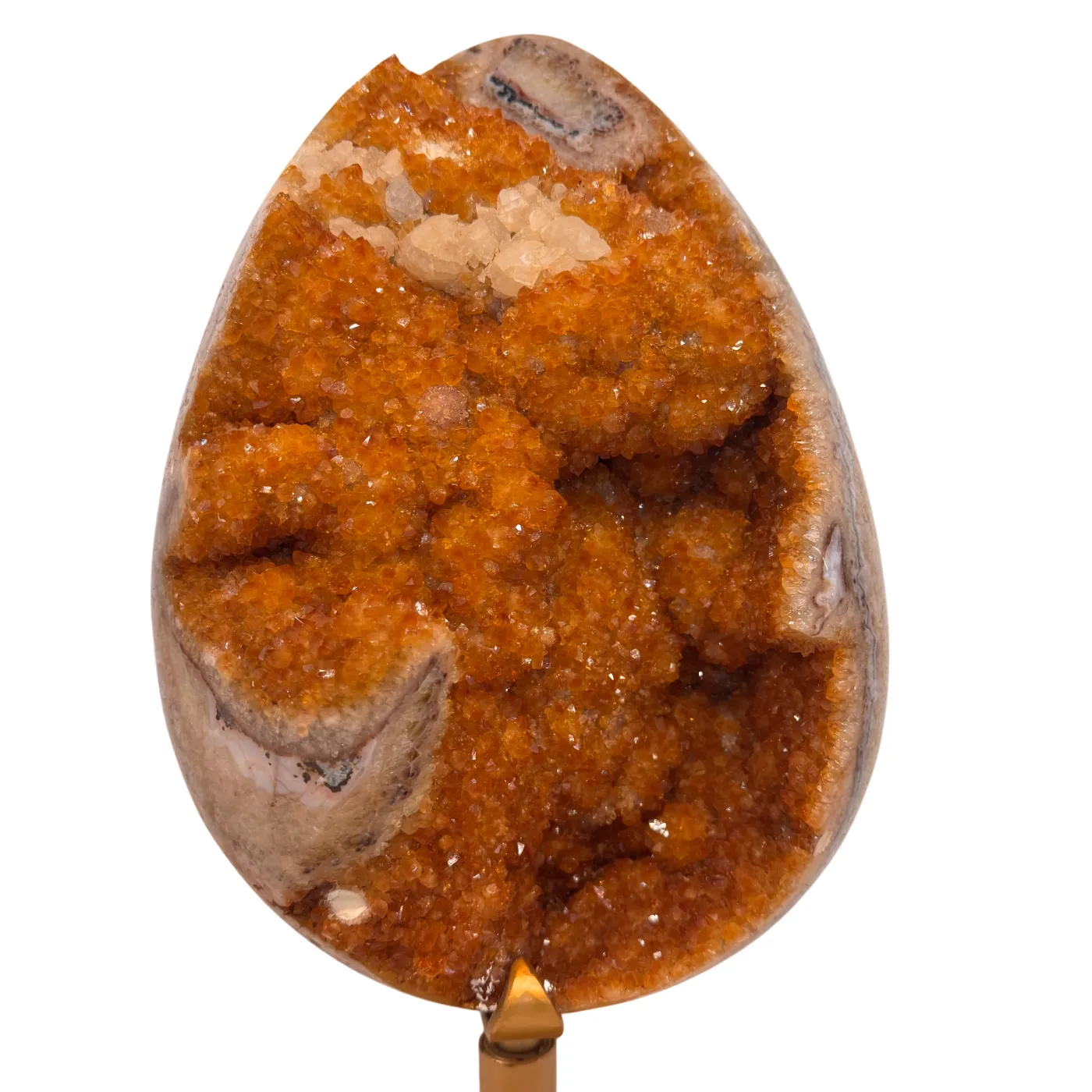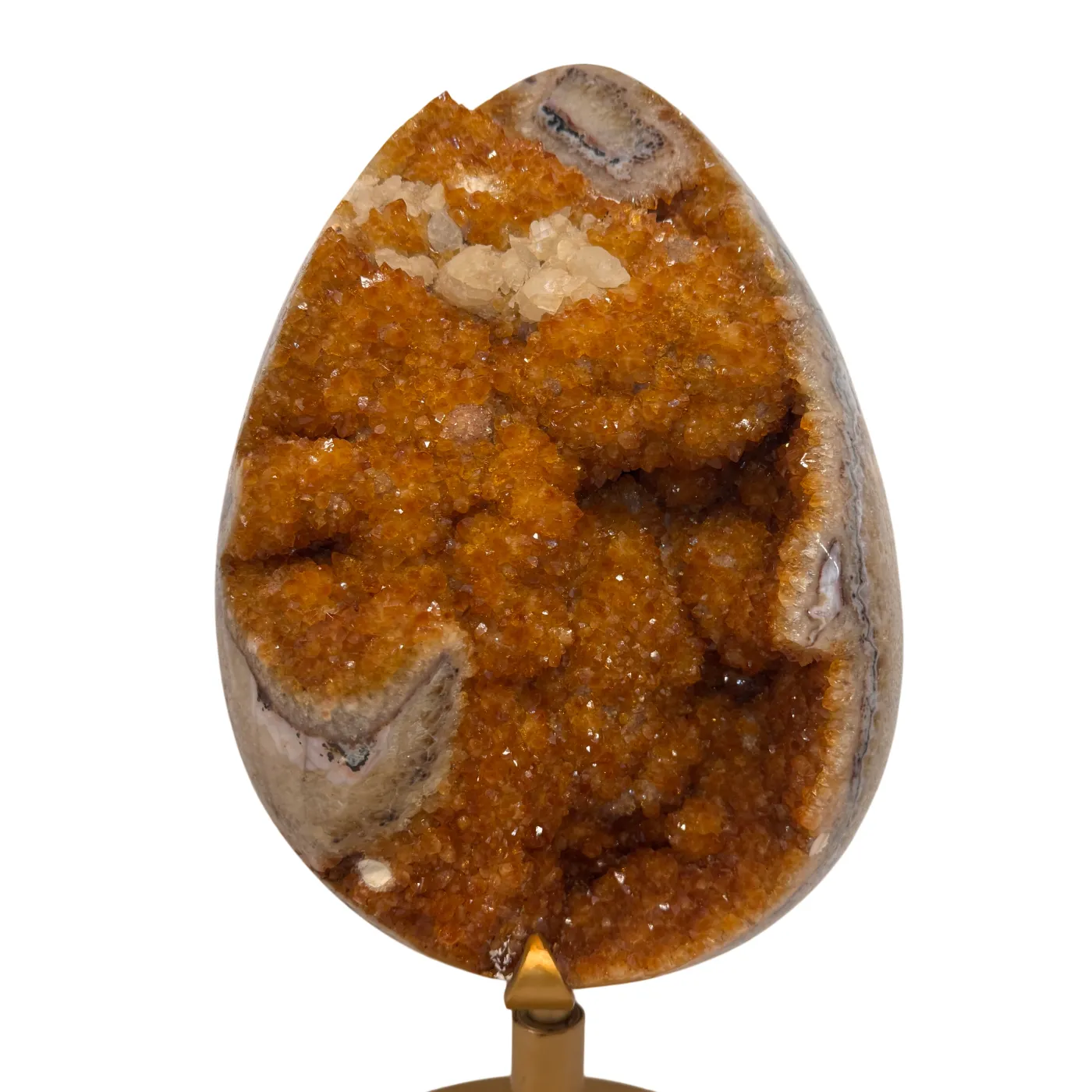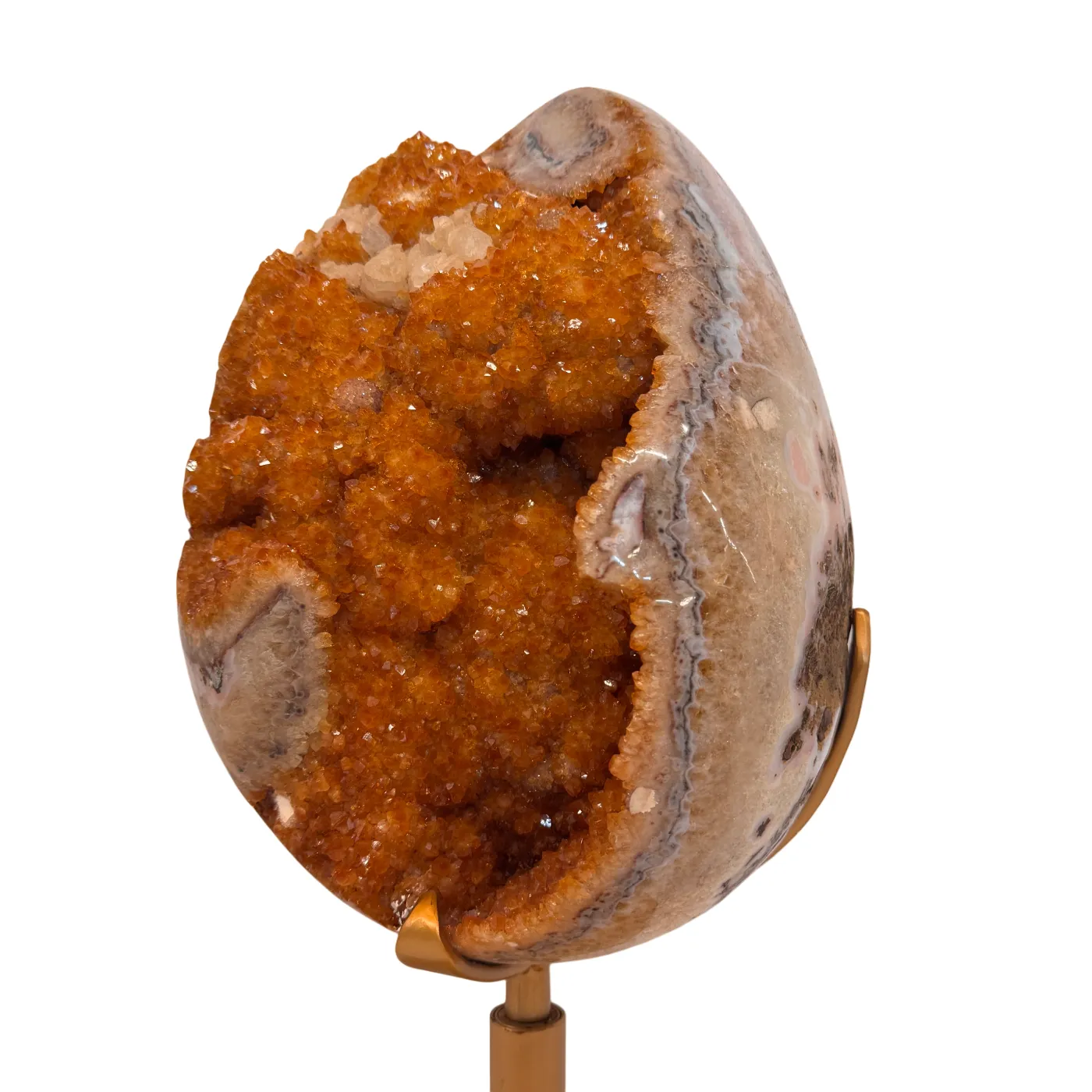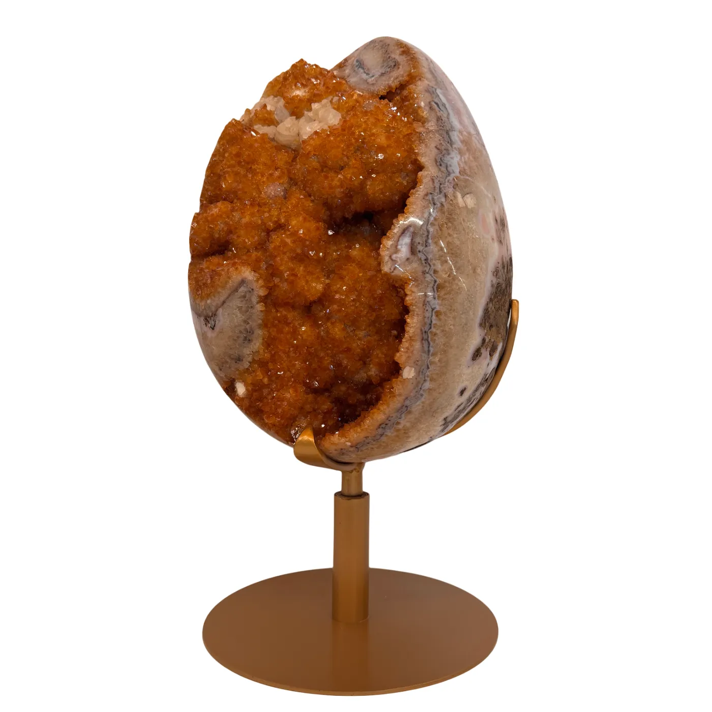 Dit uitzonderlijke citrien ei is een waar meesterstuk uit Brazilië. Oorspronkelijk gevormd als amethist en later door natuurlijke verhittingstechnieken omgezet naar de warme citrienkleur, toont dit stuk prachtige kristalformaties rondom het volledige ei.