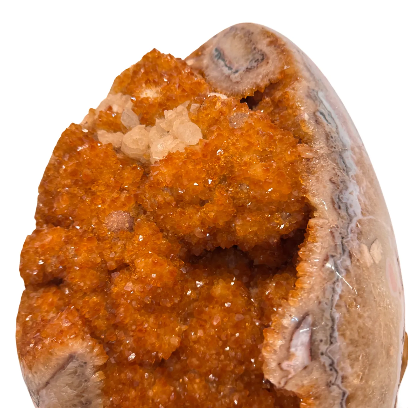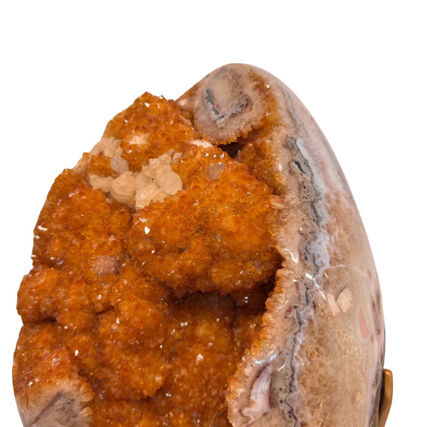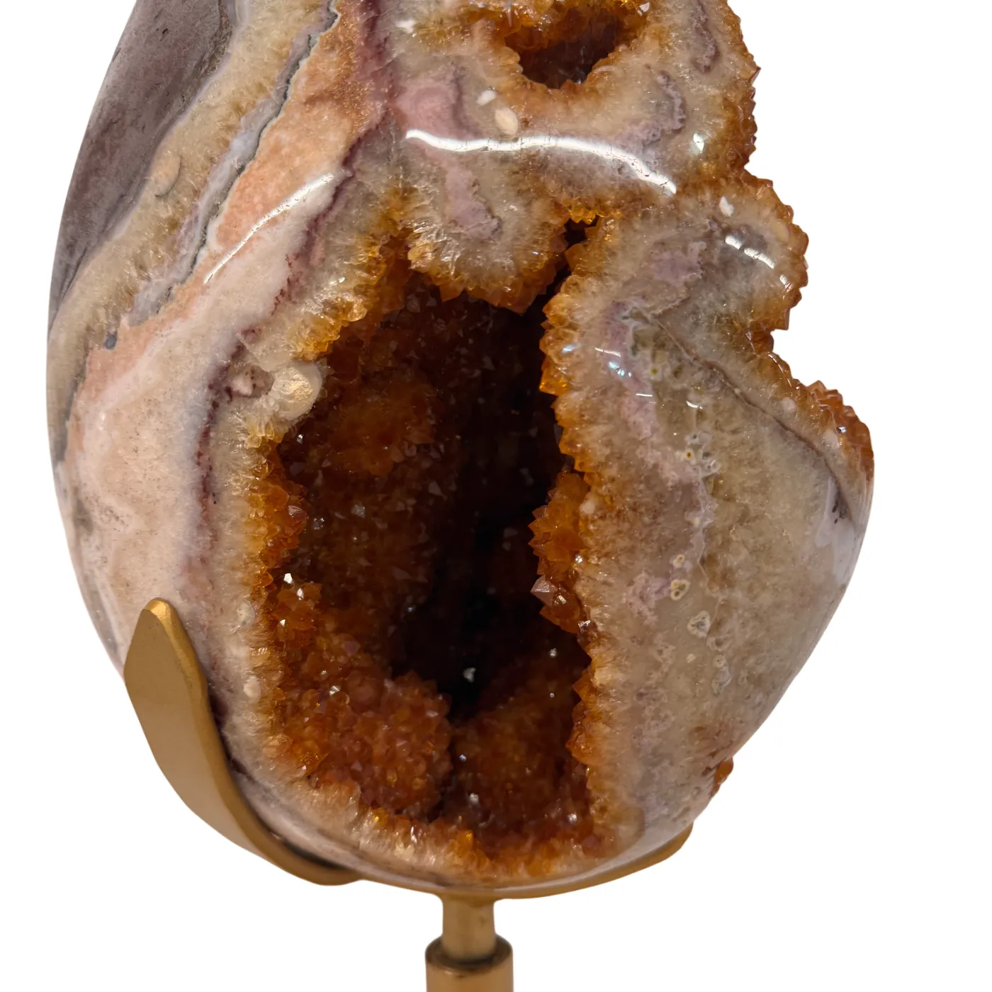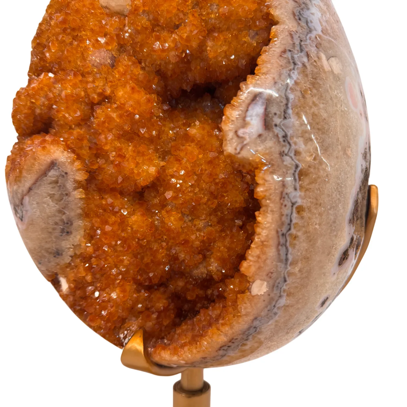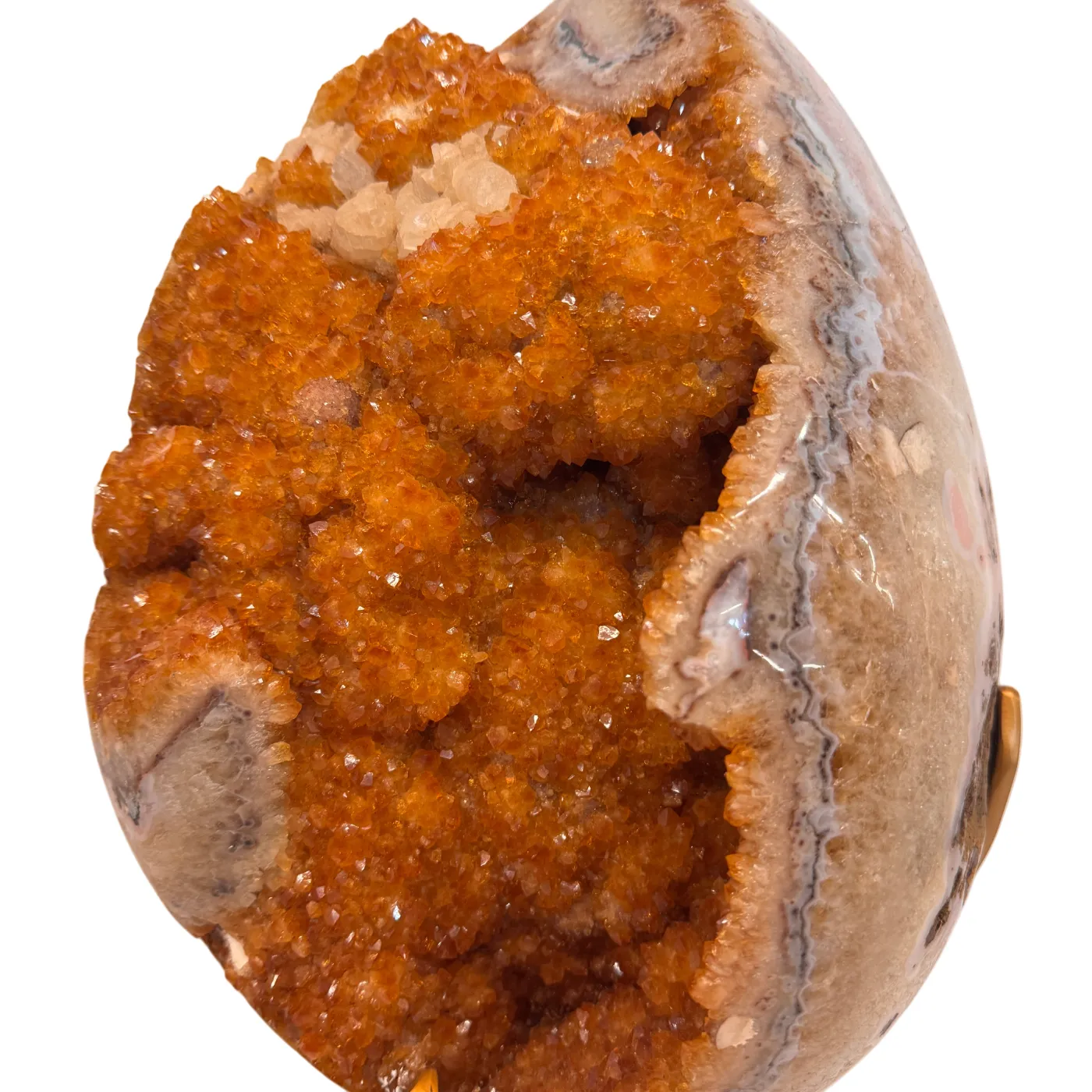 Dit uitzonderlijke citrien ei is een waar meesterstuk uit Brazilië. Oorspronkelijk gevormd als amethist en later door natuurlijke verhittingstechnieken omgezet naar de warme citrienkleur, toont dit stuk prachtige kristalformaties rondom het volledige ei.