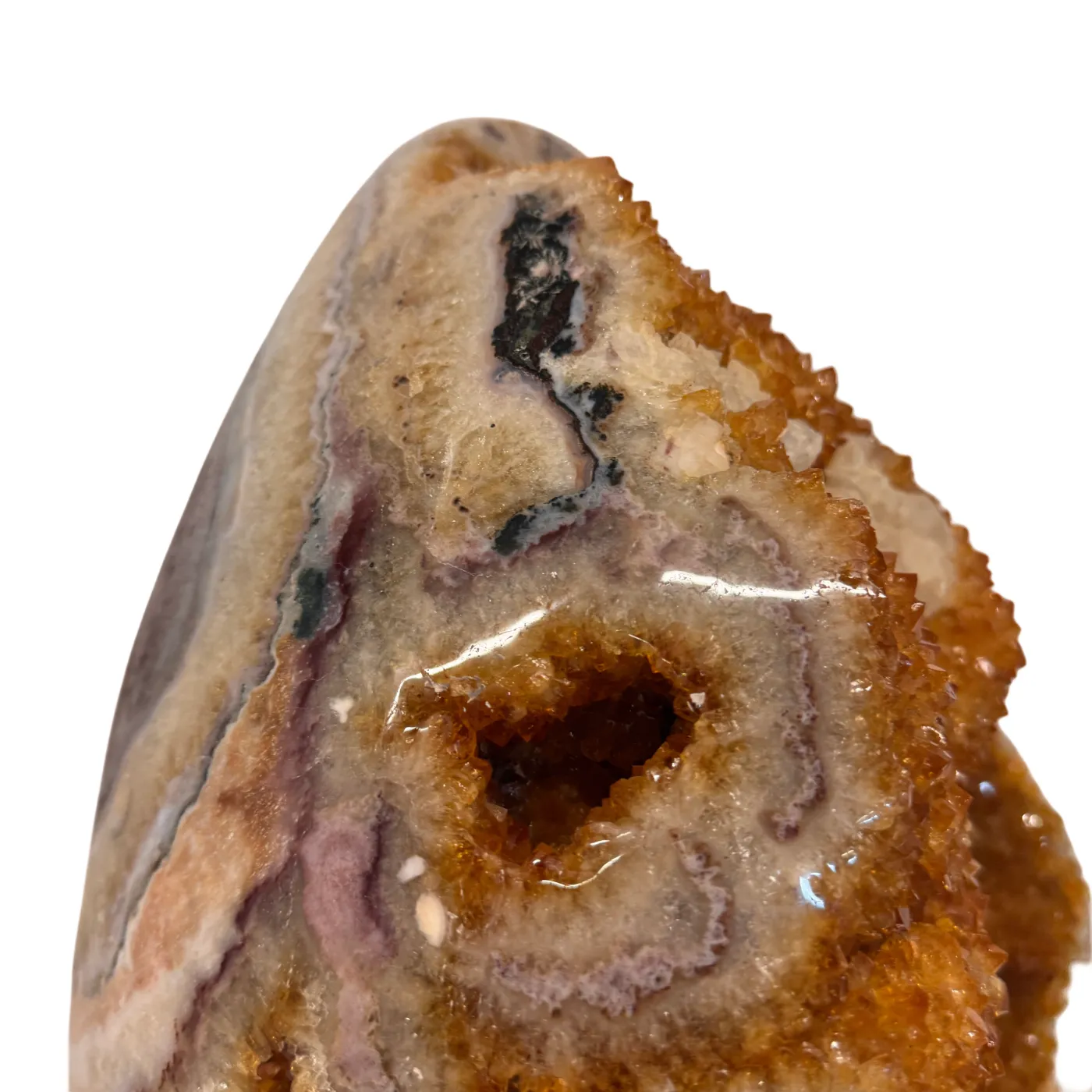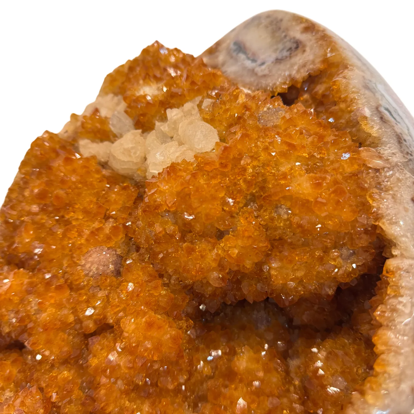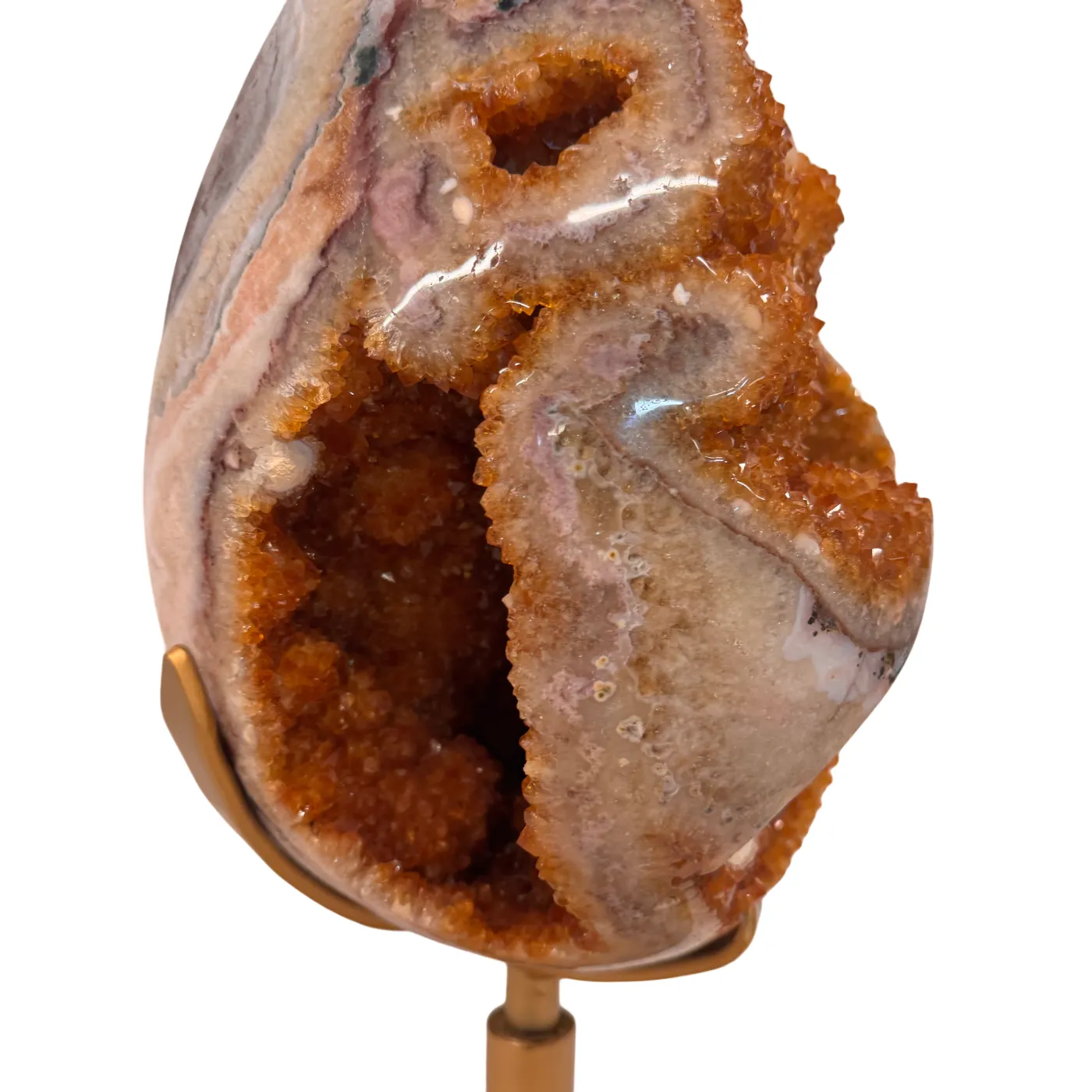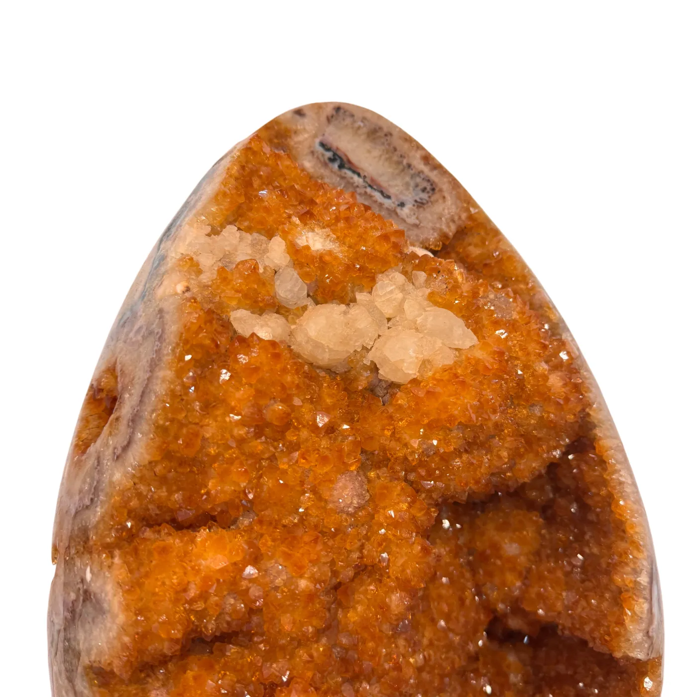 Dit uitzonderlijke citrien ei is een waar meesterstuk uit Brazilië. Oorspronkelijk gevormd als amethist en later door natuurlijke verhittingstechnieken omgezet naar de warme citrienkleur, toont dit stuk prachtige kristalformaties rondom het volledige ei.