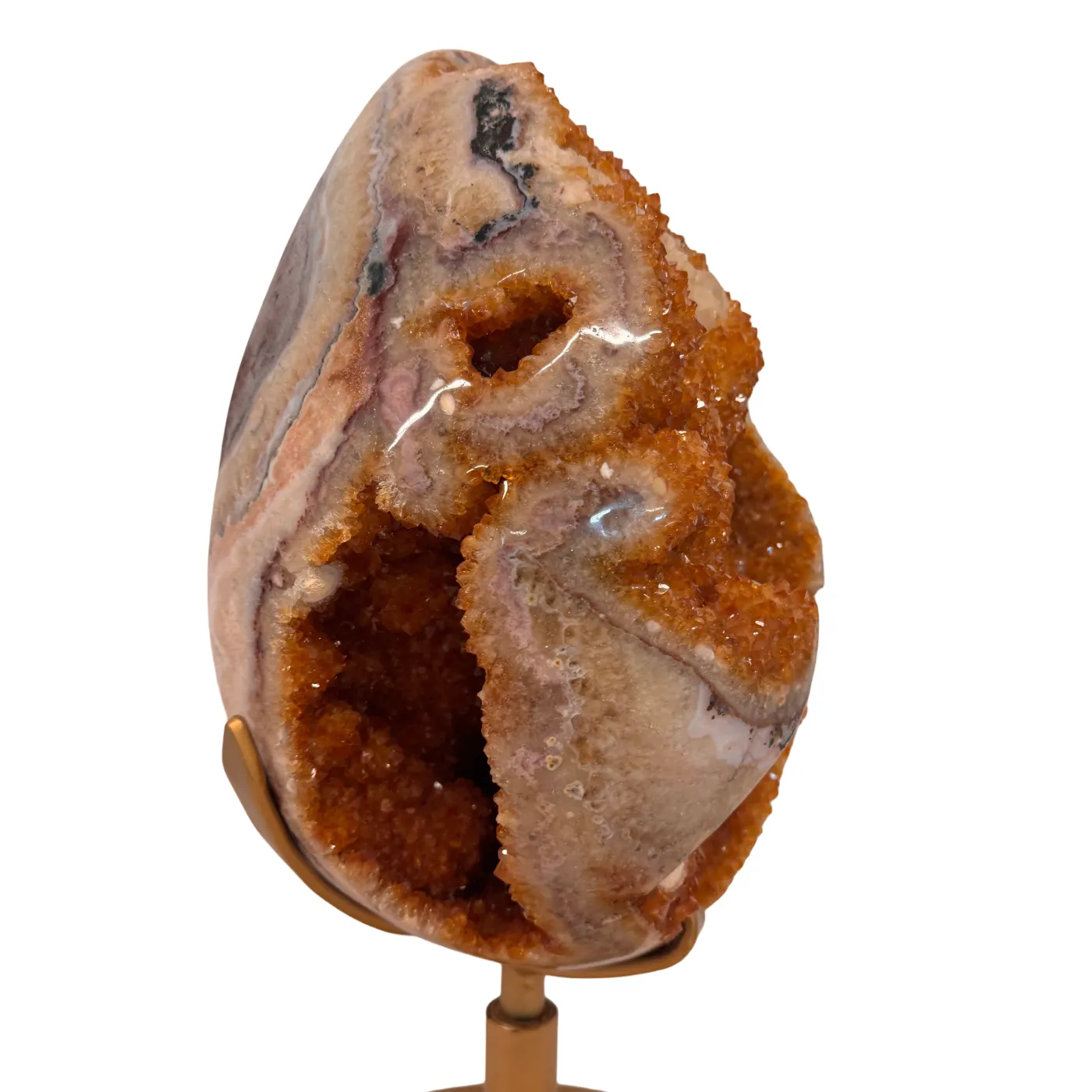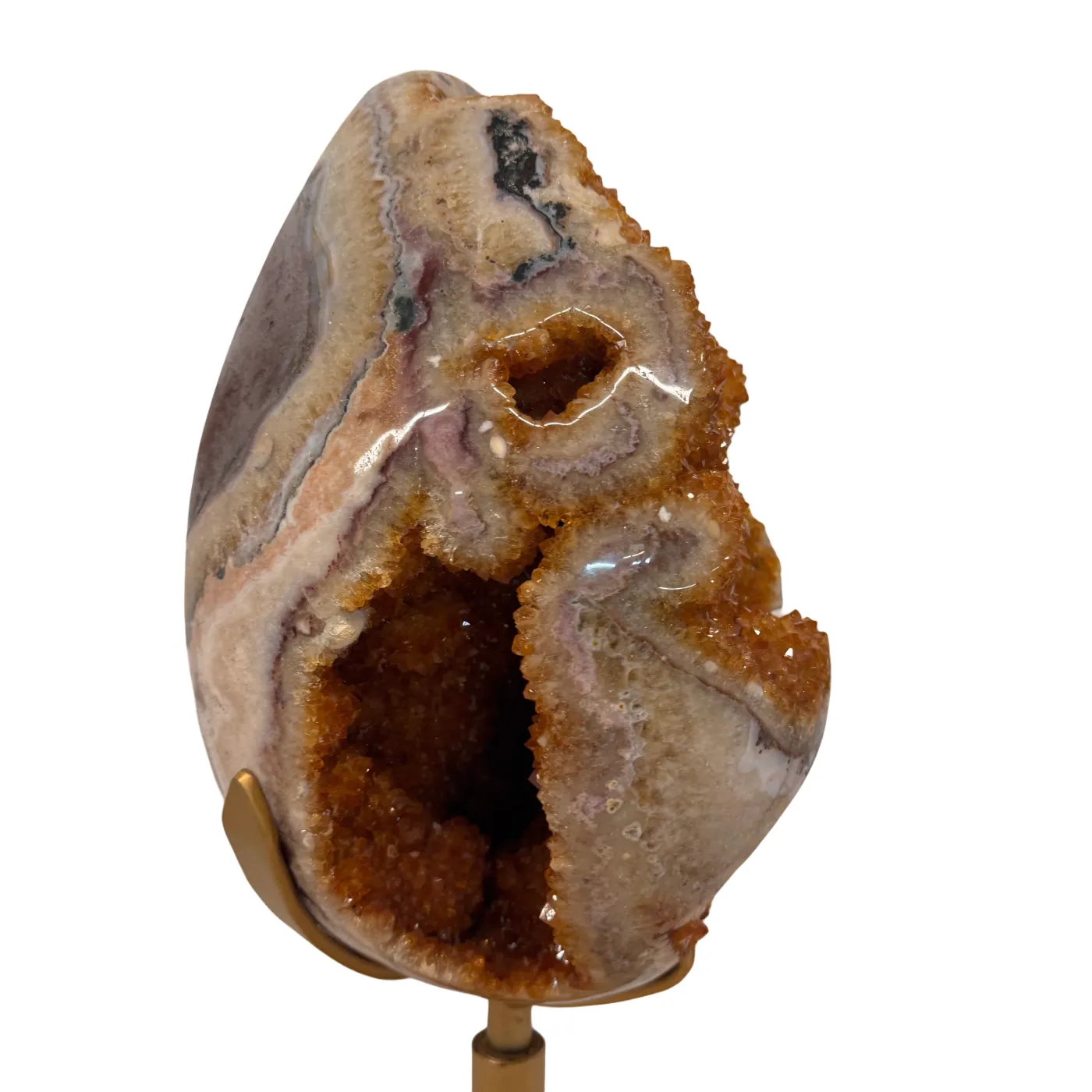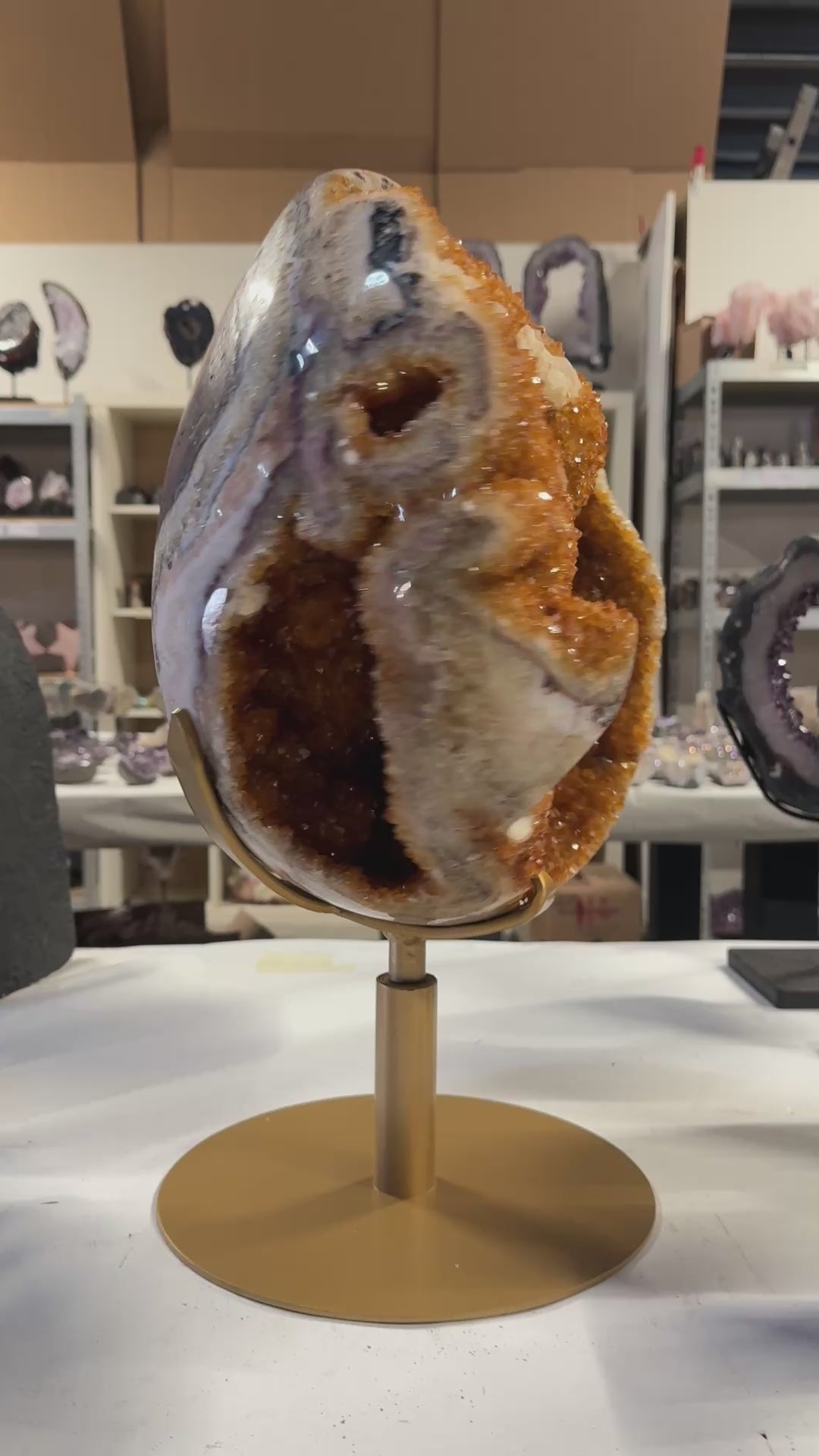 Het ei is volledig met de hand gepolijst, waardoor de schitterende kristalpunten, structuren en diepe goudkleurige tinten optimaal zichtbaar zijn. Het staat op een stevige, draaibare metalen standaard, zodat het kunstwerk vanuit elke hoek bewonderd kan worden.
