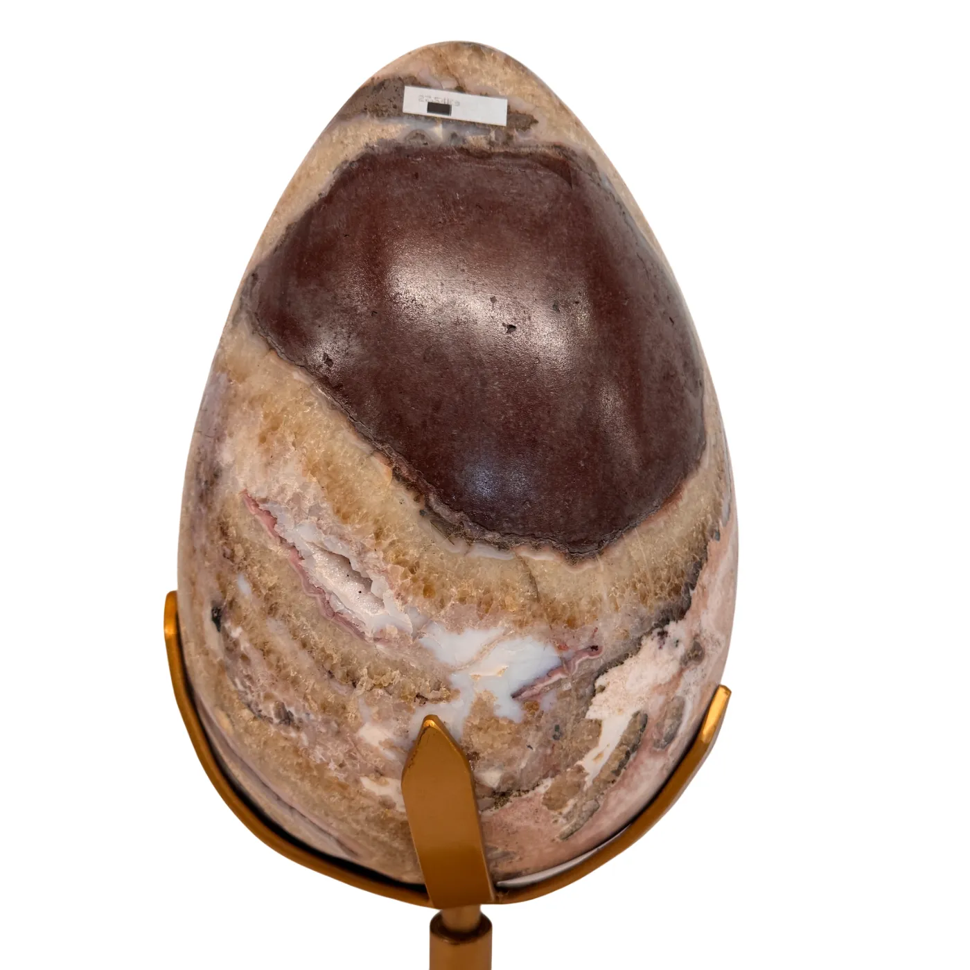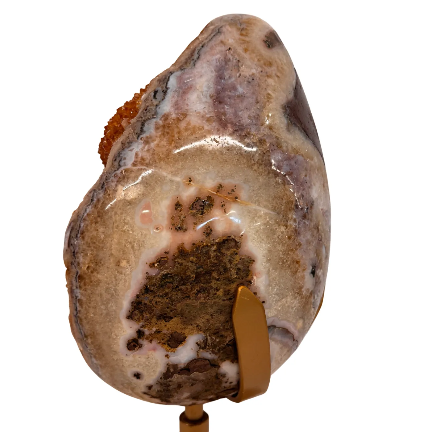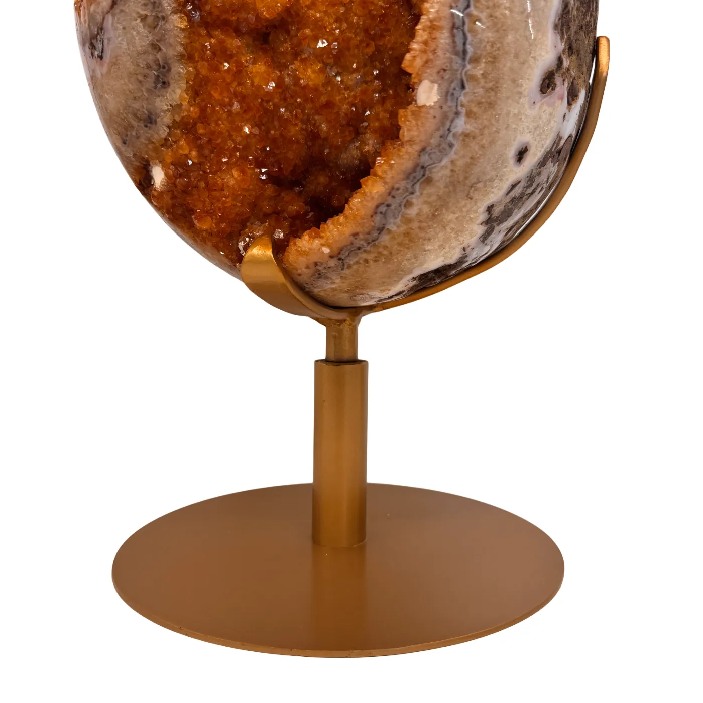 Het ei is volledig met de hand gepolijst, waardoor de schitterende kristalpunten, structuren en diepe goudkleurige tinten optimaal zichtbaar zijn. Het staat op een stevige, draaibare metalen standaard, zodat het kunstwerk vanuit elke hoek bewonderd kan worden.