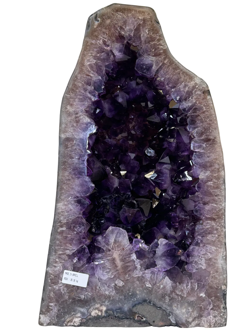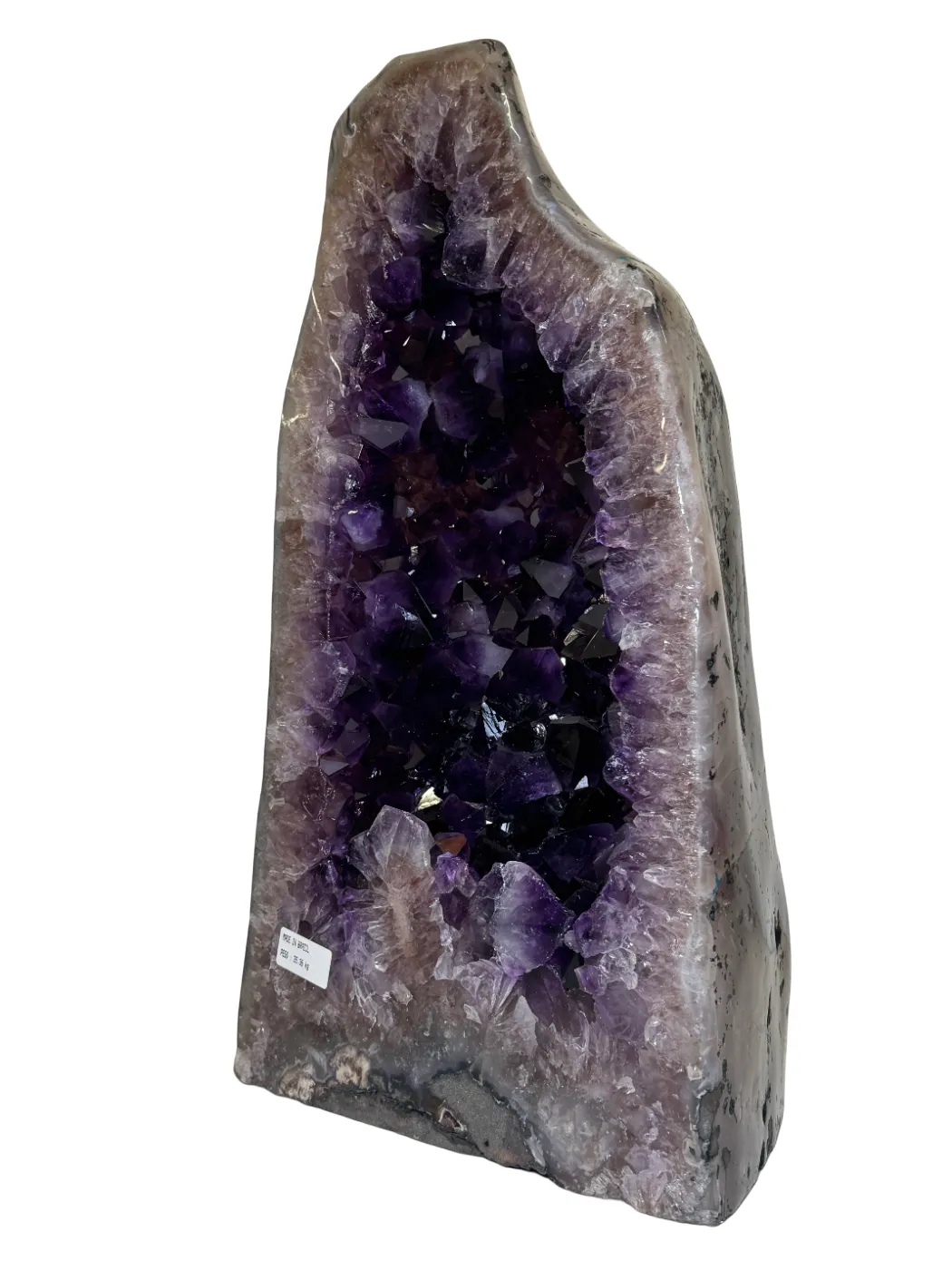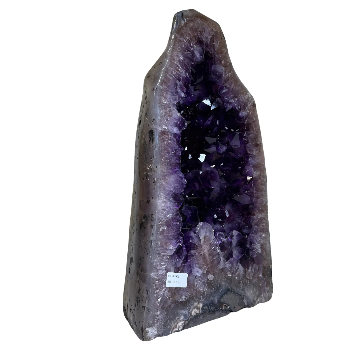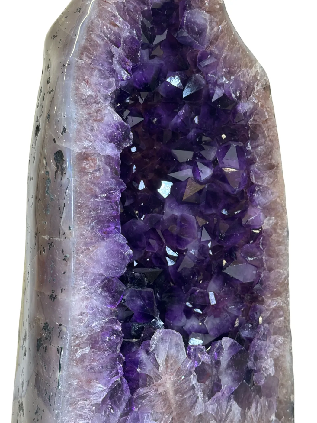 Deze indrukwekkende amethist kathedraal is een waar topstuk en een echte eyecatcher in iedere ruimte. De zijkanten en achterkant zijn volledig gepolijst, waardoor de natuurlijke kleuren en structuren prachtig tot hun recht komen.