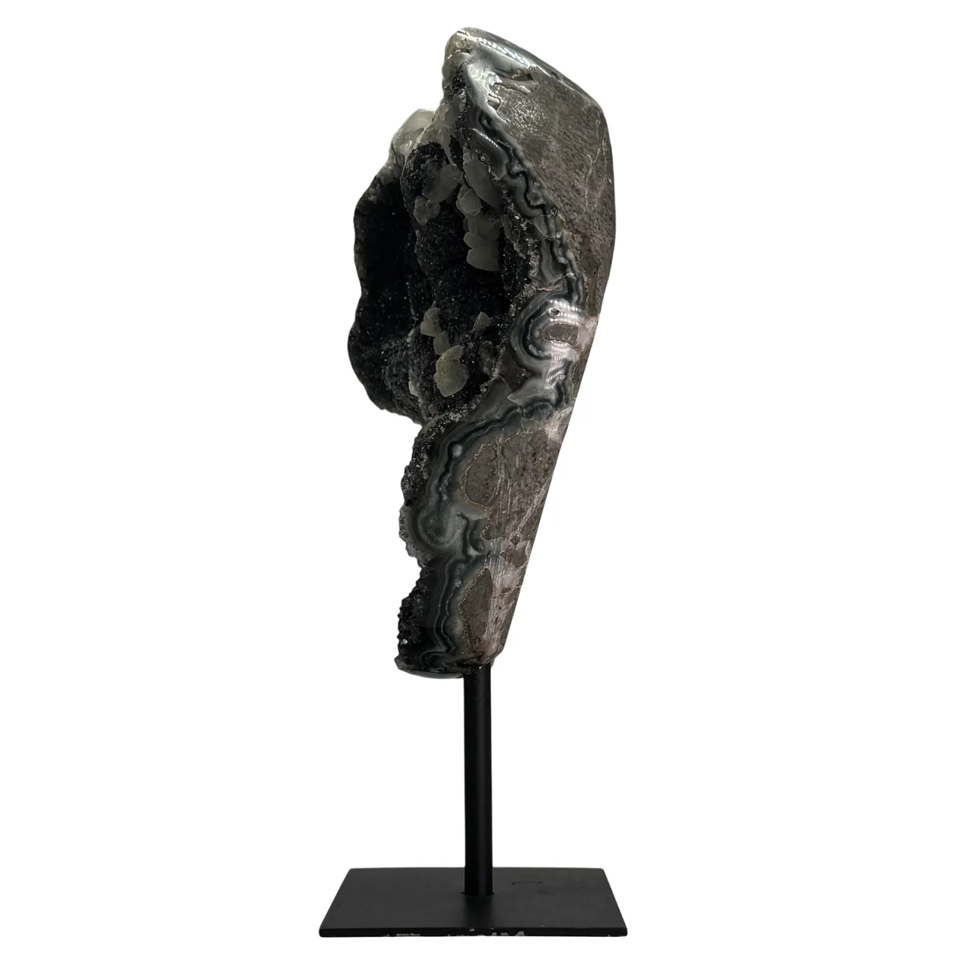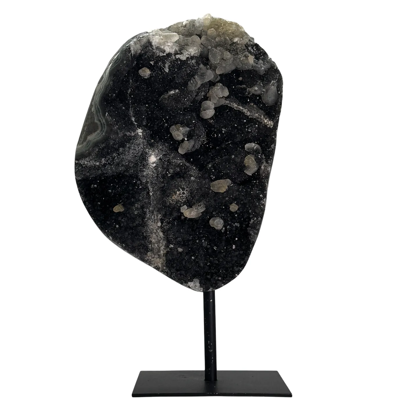 Zwarte amethist met calciet op metalen standaard