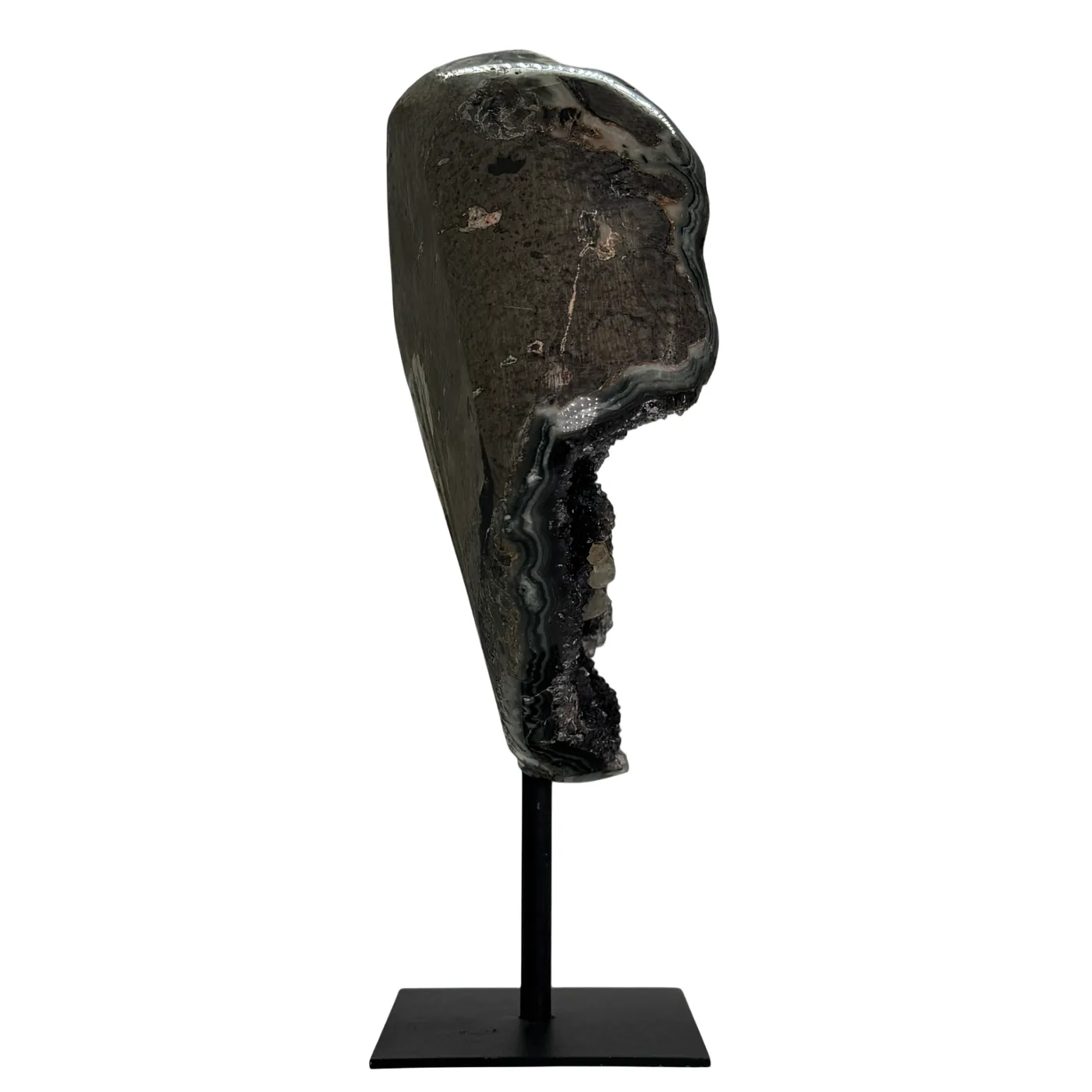 Deze prachtige zwarte amethist is afkomstig uit Brazilië en staat op een stevige, metalen standaard. De achterkant van de steen is zorgvuldig geslepen, terwijl de zijkanten zijn gepolijst. Hierdoor komt de aanwezige mosagaat mooi tot uiting en worden de natuurlijke structuren extra zichtbaar.